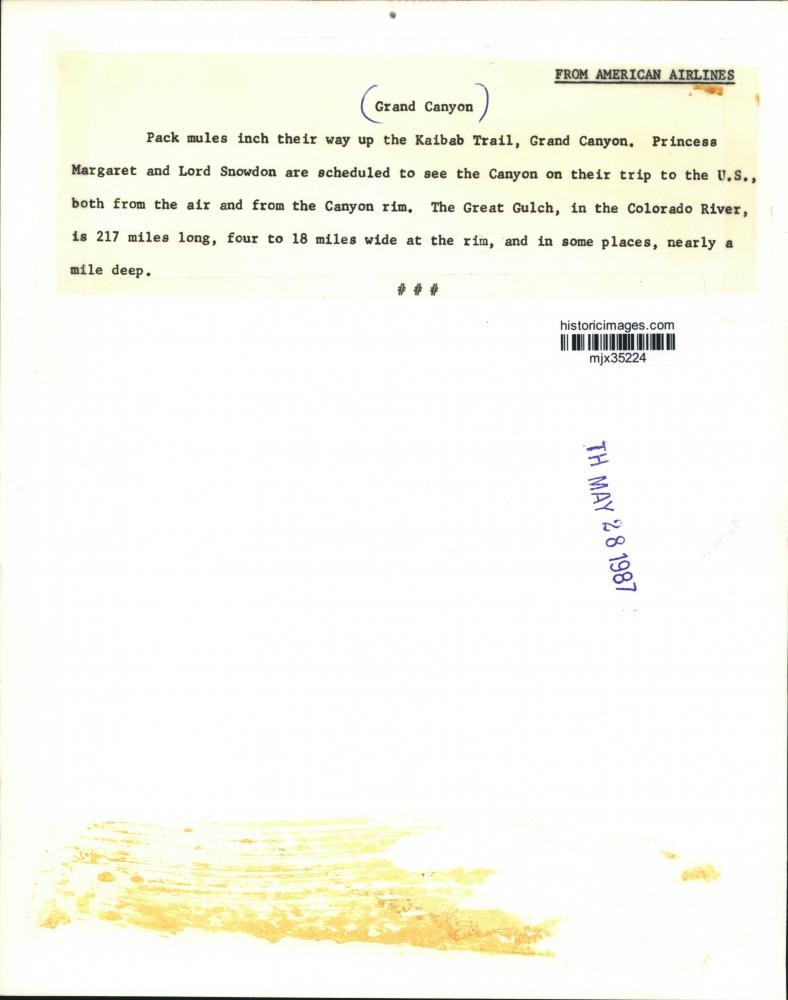 ebay template Note: Please study the images carefully to determine the condition of this vintage photograph, as it may not be in perfect condition. It may contain wrinkles, cracks, and possibly even tears due to its age and how it was handled before it got to us. A scanner may interpret colors and contrast differently than human eyes will, so it is possible that the actual photograph may be slightly darker or lighter in person. This vintage photograph is offered for sale as a collectible item and conveys no transfer of copyright. 1987 Press Photo A view of pack mules going up the Kaibab Trail, Grand Canyon. This is an original press photo. Grand Canyon -- Pack mules inch their way up the Kaibab Trail, Grand Canyon. Princess and Lord Snowdon are scheduled to see the Canyon on their trip to the United States, both from the air and from the Canyon rim. The Great Gulch, in the Colorado River, is 217 miles long, four to 18 miles wide at the rim, and in some places, nearly a mile deep. Photo measures 8 x 10.25 inches. Photo is dated 05-28-1987. PHOTO FRONT PHOTO BACK Historic Images Part Number: mjx35224 FAQs Q: Can I just download a digital version instead? A: No, we sell only vintage originals and do not make or distribute any copies, including digital ones. Q: Do you combine shipping and invoices? A: Multiple photos won on the same seller ID combine automatically through the eBay checkout process. If you encounter problems with this, send us a message via eBay messaging and we will send you an invoice. Due to eBay limitations, we cannot combine items won on our different seller IDs for a single shipping charge. Q: How quickly do you ship the items once paid? A: We ship within one business day after your payment clears. If you do not receive an "order shipped" email from us by the close of the second business day from submitting payment, please e-mail us via eBay messaging. Q: How do you make sure my photograph arrives safely? A: We package each order between two cross-corrugated pieces of cardboard to ensure that the package is as difficult to bend as possible. We then wrap each order in a plastic sheet to help protect against moisture. We want you to rest assured that we take every precaution to ensure that the photograph you receive will be in the same condition in your care as it was in ours. Q: Will the "Historic Images" watermark be on my photo when I receive it? A: No. This is a digital watermark we use to protect our images. It is not printed on the photo. Q: What are your office hours? A: eBay for us is a business, and a very fun one to be in! We are open M-F 9 to 5 (CST). Therefore, we do not return e-mails and phone calls over the weekend. We observe the following holidays: New Years Day, Memorial Day, Fourth of July, Labor Day, Thanksgiving and the day after Thanksgiving, Christmas Eve and Christmas Day. Q: Where did all these vintage photos come from? A: These original vintage photographs are from various news service and newspaper photo archives from locations around the country including: Boston, Detroit, Tampa, Chicago, Denver, Seattle, New Orleans, Milwaukee, Portland, Spokane, and more. We do not copy or reproduce any photographs -- every item is a unique vintage piece that was housed in a news archive. Q: Can I use this photograph in my book/blog/website? A: The short answer is no. There is no transfer of copyright for republication or reproduction with these photographs when you purchase them, and only photographs taken before 1923 are currently automatically in the public domain. Permission from the copyright holder, which usually can be identified from the back of each photo, must be sought to republish or reproduce the image for any purpose. Q: Do you relist items (in case I miss an auction ending)? A: Auction items that receive no bids are relisted in our store (historicimages-store on eBay) as a fixed-price item and at a higher price than the starting auction price. Q: Do you leave feedback? A: Yes, we always leave feedback for buyers. Our software monitors when our buyers leave us feedback, then notifies us that we can leave feedback for the buyer. Rest assured, if you leave feedback, we will do the same! Check out our family of eBay IDs: historicimages01 Sports Photos historicimages02 Entertainment Photos historicimages03 Americana Photos historicimages04 International & War Photos historicimages05 Transportation Photos historicimages06 Photos of All Subjects historicimages07 Entertainment Photos historicimages08 Newsworthy Photos historicimages09 Entertainment Photos historicimages10 Sports Photos historicimages-store Our largest fixed-price selection historicimages-gallery Hand-picked photos Saturday night auctions About Us Historic Images was formed in September 2009, with a handful of scanners working out of a basement to digitize newspaper photo archives. We have since moved out of the basement, and we can now archive thousands of photos per day. Our company has worked with magazines and newspapers from Detroit, Boston, Denver, Seattle, Tampa, Chicago, and New Orleans, just to name a few. We are constantly adding to our inventory, and have assembled an archive of millions of photos to date. As our company evolved, we began our eBay business, which brings thousands of fresh auctions per week to the world's largest online auction marketplace. Our custom software systems and team of great employees allow us to efficiently scan and sell large photo archives online. At the very core of our company's DNA is a strong commitment to customer satisfaction and strict integrity for our product. Our promise to you is that we will do everything in our power to provide you a great buying experience. Copyright 2009 - Present, Historic Images, Inc. Sell Smarter with Kyozou. Inventory and Ecommerce Management