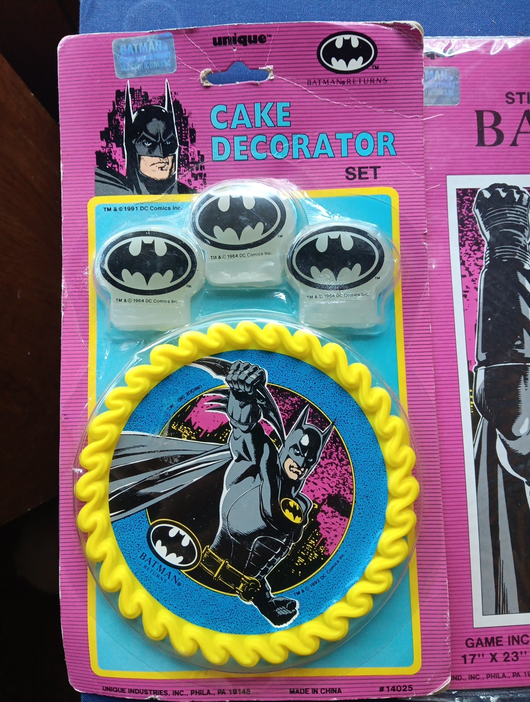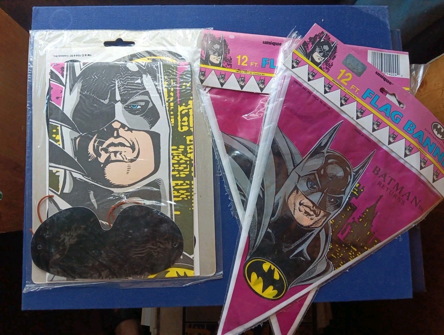 vintage 1991 batman returns party set. includes cake decorator set, 2 flag banners and a party game. all new in packaging. sold as set.