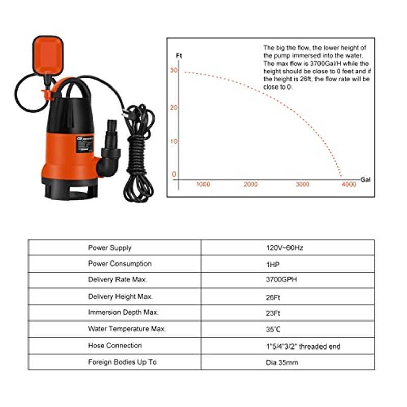 About this item If you need the pump to work in a low water level environment (the water level does not exceed the pump), the float switch need to be locked on the pump. The working principle of the water pump is that the float switch goes down vertically, the beads inside are stuck on the line under the float switch, and the water pump starts automatically. 【Kindly Tip】When you start use the pump you must be submerged into the water at a slight angle to allowthe remaining air to escape. 【1HP High Power】Prostormer Sump Pump uses 1HP power, which is more efficient than ordinary 3/4HP sump pump; Max 3700 Gallon Per Hour rating tackles any draining job at a fraction of the time. 【Multi Outlet Sizes】3 different diameters outlets (1 inch ,1-1/4 inch, 1-1/2 inch) to adapte for different size hoses as needed according to the flow rate. The bigger the flow is, the wider the outlet should be. 【Keep Open Mode】When you put the float switch locked on the sump pump, the sump pump will keep working all the time. Once the pump can not pump any water, you should cut off the power immediately to prevent the coil from getting burned. 【Automatic ON/OFF Mode】The float switch should be unlocked from the pump. When the water level rises above the pump, the pump will start working automatically under the control of float switch. When the pump fails to pump water, it will automatically disconnected the power. 【Sealing Structure & Durable Construction】The sump pump features a durable sealing structure and the durable thermoplastic body keeps the pump from corrosion. The higher base plate which assures the prevention of debris collection in the sump pit. › product details Brand:Prostormer Color:Orange Material:Plastic Style:1HP Submersible Sump Pump Product Dimensions:6. 69"L x 6. 69"W x 12. 2"H Power Source:Corded Electric Item Weight:10 Pounds : : : You may also like Foldable Easy Assembly Smart Box Spring Twin Steel Frame Support Mattress Metal 94.8 USD Free shipping Hyacinth Organizer Basket 4 Pack Woven Storage Basket Toys Books Home Decor New 48.81 USD Free shipping Clear Glass Beverage Dispenser 1.5 Gallon Wood Lid Party Drink Serving New 26.48 USD Free shipping Cordless Stick Vacuum Powerful Motor 35 Min Runtime Handheld LED Lights Pet Hair 181.26 USD 190.8 USD Free shipping 5% off Cordless Palm Sander 20V Lithium-Ion Battery Charger Dual-Grip Design Pad New 69.53 USD 73.19 USD Free shipping 5% off 80V 18" Brushless Cordless Chainsaw Tree Felling w/ Battery & Rapid Charger 304.41 USD 320.43 USD Free shipping 5% off Max Power Triple Odor Guard Unscented Clumping Cat Litter 15lb 3 Pack Dust Free 35.12 USD Free shipping Full Motion TV Wall Mount 47-84 inch Tilt Swivel Bracket 132lbs Max Capacity New 69.06 USD 72.69 USD Free shipping 5% off Christmas Tree Storage Bag 7.5ft Artificial Trees Durable Water Resistant Canvas 28.38 USD Free shipping Yard Rover 2 Wheel Tire Wheelbarrow 300lb Capacity Garden Landscaping Tool New 86.31 USD 90.85 USD Free shipping 5% off 108Pcs Cordless Drill Household Power Tools Set DIY Accessories Tool Kit HOT 86.35 USD 90.89 USD Free shipping 5% off Atomic Digital Calendar Clock Extra Large Digits Self Setting Alarm Wall Clock 37.83 USD Free shipping