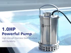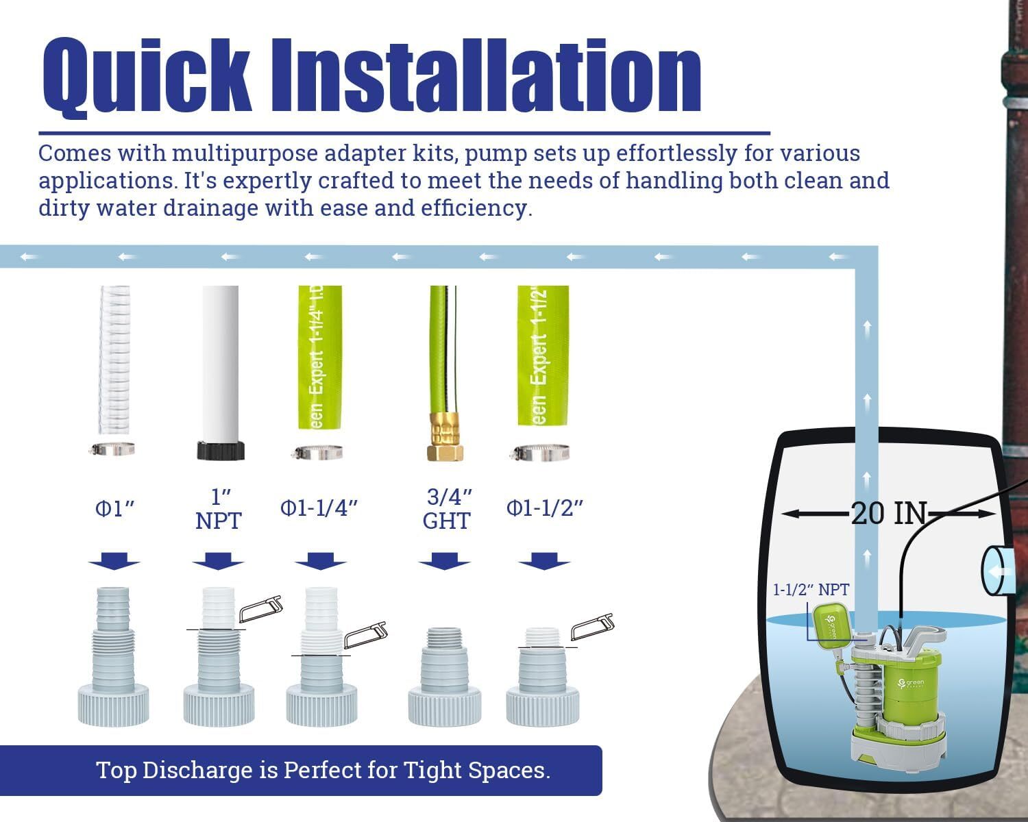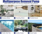 【High-Efficiency Drain Pump】Features an advanced oil-free PSC motor for efficient power conversion and low consumption, offering a robust 1.0HP output. Capable of lifting water up to Max. 28 feet vertically, it boasts a maximum flow rate of 4500 gallons per hour at zero feet, and 54 gallons per minute at a 10-foot discharge lift, perfect for handling high-volume water drainage tasks with ease. 【2 in 1! Manual/Automatic Adjustable】This utility water pump can be adjustable usage mode between manual and automatic on/off as you wish. You can use it in automatic on/off operation and just leave it at work, or you can freely choose the simple plug-in operation to remove water completely. With the lock design, floater can be fixed in up status that would keep pump always run, but you have to plug off manually in case of run dry. 【Unique Pump Base Adjusts Suction Mode】Pump has adjustable base that can be kept up for sucking dirty water, or down for draining clean water. Under dirty water mode, pump handles water up to 0.8" solid with quick suction. Under clean water mode, pump can drain more water as much as possible. 【More Hose Installation Options】Includes two plastic adapters for versatile pumping options: 1” & 1-1/4" & 1-1/2" barb for discharge hoses, ideal for high-capacity pumping; 3/4” GHT and 1" & 1-1/2" NPT for garden hoses and threaded hoses, simplifying quick installations. *For optimal performance, avoid using expandable or retractable hoses with this pump, as they may hinder its full capability. 【Green and Tough】Features full corrosion-resistant, reinforced thermoplastic construction that achieves environmental consciousness and durability, and equipped with thermal overload protection, ensuring reliability in water removal applications. It's built for continuous duty use, providing peace of mind and long-lasting performance. A perfect fit for your home and garden! 【User-Friendly Design for Seamless Installation and Transport】This compact item fits perfectly in narrow pits with its top discharge and integrated body design. With a 25-foot long grounded waterproof power cord and a portable handle, you can safely and easily manage the setup from a distance, eliminating the hassle of extension cords and simplifying the installation process.