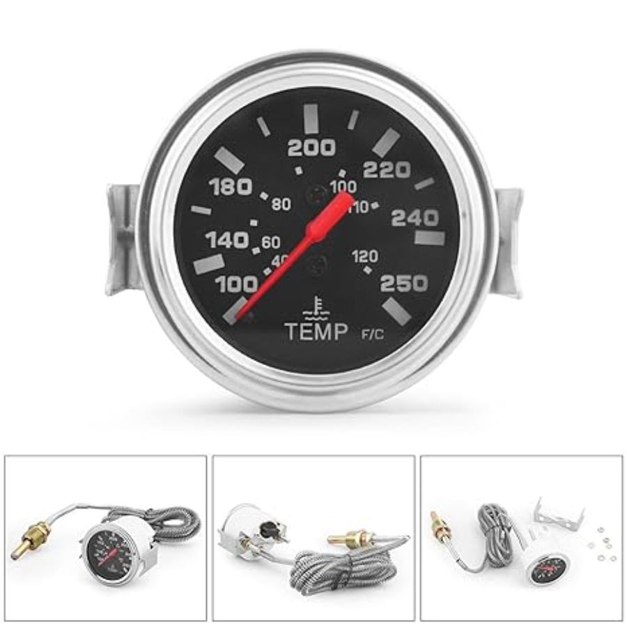 About this item Dual-Scale Display: Features both Celsius (40–120°C) and Fahrenheit (100–250°F) scales on a single analog dial for versatile readability. Features: High sensitivity and easy operation, equipped with yellow LED backlighting for clear readings in low-light or nighttime conditions. Read: 40-120℃/100-250℉, the diameter of the installation: 2.24 x 2.24 x 2.24 inches; 10.56 ounces adds a retro aesthetic while monitoring coolant temperature accurately (Unit: degree Fahrenheit & degree Celsius). Works with most 12V vehicles; Sensor NPT 1/2-14; requires professional installation for optimal performance. Power: 12V DC, Max. 0.3A, Thread Package Dimensions sensor: 1/2-14 NPT, Length of the cable: 1.8 meter. Package Dimensions: 2.24 x 2.24 x 2.24 inches; 10.56 ounces.