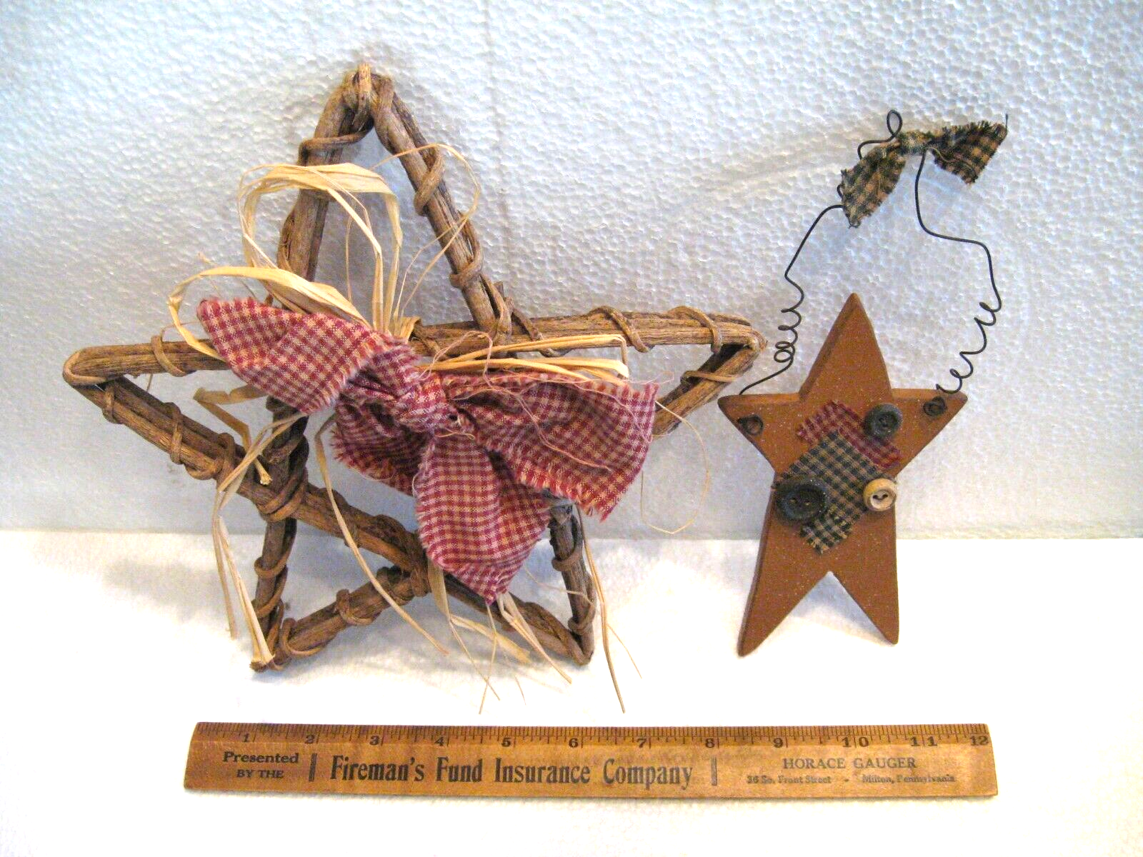 2 Country Farmhouse Decor Hanging Stars Grapevine Red Bow Wooden w Buttons Wire Grapevine star is 9" x 10" and wooden one is 3" x 6", not including the wire.
