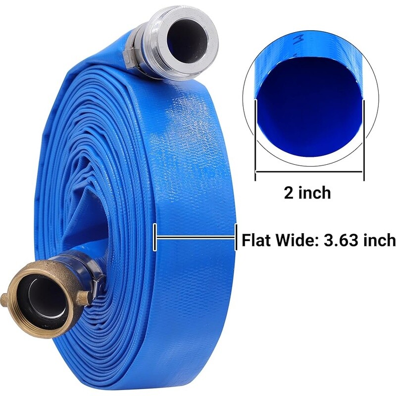 You may also like 12V DC Utility Pump 350GPH Water Transfer Portable Hose Kit Pool Garden Draining 55.52 USD 58.44 USD Free shipping 5% off 1/3HP Submersible Water Pump 2900GPH Oil Free Portable Utility Pump Drain Home 46.87 USD 49.34 USD Free shipping 5% off 1HP Submersible Sump Pump 5000GPH W/ Automatic Float Switch Utility Water Pump 61.68 USD 64.93 USD Free shipping 5% off About this item [ADVANCED MATERIAL]: Pump Discharge hose is made of flexible PVC material reinforced with high tensile strength polyester yarn circularly woven to prevent leaks and tears for durable use. It’s also resistant to oils, grease, acids, and many chemicals [STANDARD DIAMETER]:Pool Backwash hose Diameter: standard 2 inch, Flat width: 3. 63 inch; Length: 100 feet; Temperature Range : 23°F to 149°F (-5°C to 65°C); Working Pressure: 90 PSI [RELIABLE FITTINGS]:2’’ Aluminum male pin lug hose shank x 2" female pin lug hose shank with Brass swivel nut are installed on both sides by stainless steel punch lock clamps, strong and durable, anti-oxidation and anti-rust [NO LEAK]: Backwash hose is molded by extruder and reinforced with polyester yarn, the joint is filled with sealant, and there is a black rubber ring inside the brass swivel nut, can effectively prevent water leakage and blasting [EASILY USE]:It can be easily connected, just only match the same size and directly screw onto the pump threaded outlets Brand: Material: Polyvinyl Chloride (PVC), Aluminum, Stainless Steel, Brass, Rubber Color: Blue Product Dimensions: 11"L x 10"W Item Weight: 8. 18 Kilograms Maximum Pressure: 90 Pound per Square Inch Outside Diameter: 2 Inches Item Length: 1E+2 Feet Manufacturer: Specific Uses For Product: swimming pool backwash, draining piping systems, sewage pump, sump pump, trash pump, sand filter pumps, agriculture irrigation, construction dewatering, submersible pumping See more Indoor Ceramic Plant Pots Set of 3 W/ Drainage Holes & Leak-Proof Mesh Pads New 66.16 USD 69.64 USD Free shipping 5% off Corded Electric Leaf Blower 7 Amp 330 CFM 150 MPH Lightweight Powerful Tool New 35.54 USD 37.41 USD Free shipping 5% off Men's Incontinence Underwear Maximum Absorbency Discreet Fit Anti Odor 72 Count 33.41 USD 35.17 USD Free shipping 5% off 600lm LED Rechargeable Headlamp Flashlight 4 Mode Waterproof Adjustable Aluminum 29.71 USD 31.27 USD Free shipping 5% off 10 Pack Garden Plant Trays W/ Drain Holes Hydroponics Seed Starting Microgreens 51.15 USD 53.84 USD Free shipping 5% off 34 Pc Stainless Steel BBQ Grill Accessories Set W/ Thermometer & Grill Mats New 49.95 USD 52.58 USD Free shipping 5% off Large Plastic Flower Pots Set Of 4 Drainage Trays Indoor Outdoor Planters Copper 75.26 USD 79.22 USD Free shipping 5% off Flux Core Mig Welding Wire 0.03" Diameter 10lb Self Shielding Strong Spool New 53.05 USD 55.84 USD Free shipping 5% off Porcelain Dinner Plates Set Of 6 Microwave Safe Colorful Serving Plates Ceramic 48.11 USD 50.64 USD Free shipping 5% off Heavy Duty Soft Close Drawer Slides 22" Ball Bearing Rails 100LB Capacity Silver 51.52 USD 54.23 USD Free shipping 5% off Battery Powered Garden Sprayer Rechargeable Pump Adjustable Nozzles Portable New 61.67 USD 64.92 USD Free shipping 5% off Folding Roller Stand Height Adjustable 250 LB Capacity Portable Heavy Duty New 61.68 USD 64.93 USD Free shipping 5% off