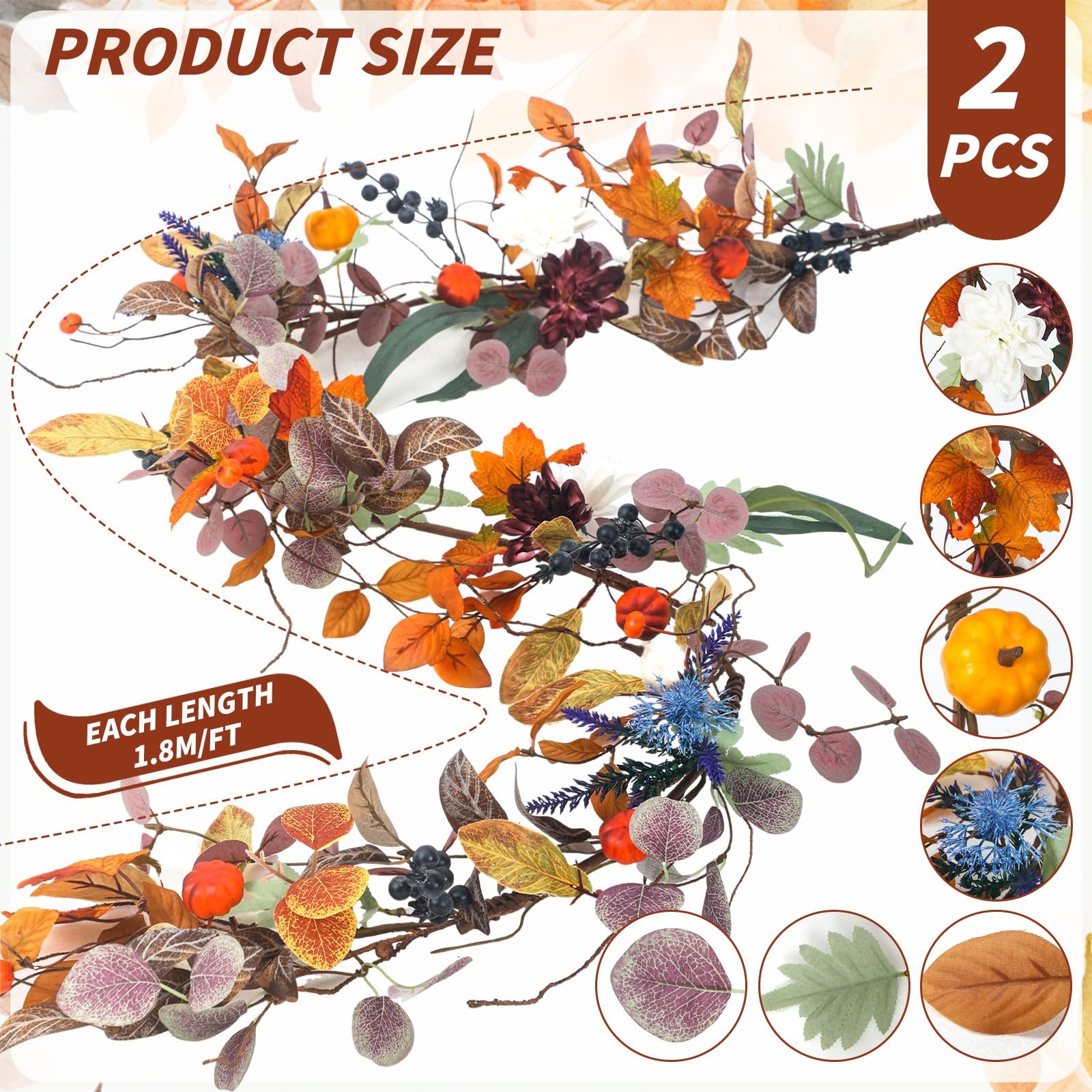 Features: The flower vines for decoration are lightweight and portable, convenient to carry and store, can be easily put in your closet when not in use, not taking up much space. You can present the flower garland for backdrop as ideal gifts to your families, friends, colleagues or neighbors for decorating during holidays, celebrations or ceremonies, making your relationship closer. Specifications: Material: plastic Color: mainly white, yellow, orange Size: about 6 ft/ 1.8 m long Package includes: 2 x Floral garlands Notes: Manual measurement, please allow slight errors on size. The color may exist a slight difference due to different screen displays. Realistic Pumpkin Eucalyptus Wreath: this set contains 2 realistic fall harvest pumpkin and eucalyptus wreaths, suitable outdoor fall decorations, consisting of pumpkins, colorful eucalyptus leaves, plant vines and dahlias; Eye-catching fall colors and unique design make your decoration stand out; Provides double the beauty and vitality, more suitable for the cheerful atmosphere of autumn harvest Autumn Thanksgiving Garland: this artificial fall wreath is decorated with yellow and orange pumpkins, autumn leaves; It is full of vitality, life and autumn atmosphere, making your home more autumn atmosphere, and is a ideal Thanksgiving decoration Bend and Shape As You Please: our fall flowers decorations have a flexible size to suitably fit your decorating ideas; Whether straight, curved, or spiraled, bending our 6 ft/ 1.8 m long garlands to suit your decor desire, will not distort or break them, allowing for unlimited creativity; In addition, please remember to unfold them after receiving, you can also splice 2 garlands together to decorate a larger space Versatility at Your Fingertips: from homes to offices, indoor parties to garden, our garlands for decor with flowers lift the ambiance most place applied, such as stairs, front doors, fireplaces, walls, farmhouses, indoor and outdoor decor; Their versatile nature magnifies the creative options of their applications, making the most of your decoration process; It's an ideal addition to your fall and Thanksgiving Day home decor Clean with Convenience: constructed with reliable plastic, our flower vines for decoration are easy to clean and storage; A simple swipe with a damp cloth can restore their freshness, making them reusable for different occasions without loss of their original aesthetic
