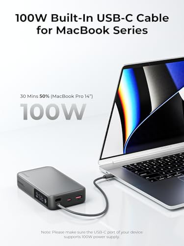 20000mAh Large Capacity: With a large 20000mAh capacity, this power bank provides sufficient power for your iphone, macbook, and other devices. It can charge Macbook Pro 14" about 1 time, keep all your gadgets running non-stop. Robust 100W Output: Portable Charger can rapidly charge your laptop, powering up your mackbook 14 from 0 to 50% in just about 30 minutes, for iphone 15 Pro can be charged 0 to 58% in 30 minutes. Experience lightning - fast charging with 100W output. Built-in USB-C cable: This battery pack with cables allows you to say goodbye to tangled wires and bulky chargers when traveling and working. Just pull out the cable, connect your device, and start charging hassle - free. Digital display: The phone battery bank is equipped with an LED display that shows the remaining battery life precisely. Easily monitor the power status to avoid being caught off - guard with a dead battery. Comprehensive protection: The powerbank has a built-in smart chip with overcharge, overvoltage, overcurrent, short circuit, and overheating protection. You can be free from trouble and create a safe charging environment for you.
