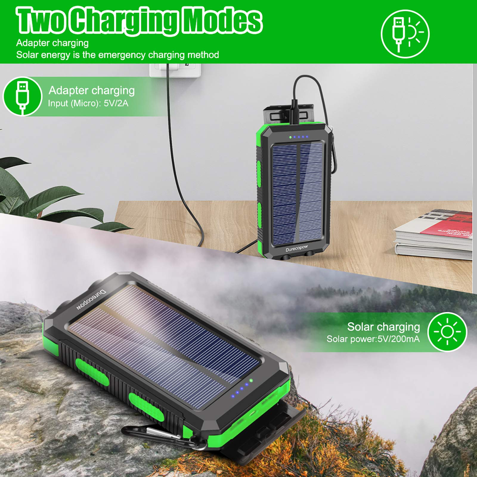This solar power bank is a lifesaver for outdoor adventures! The waterproof and shockproof design makes it super durable, and the built-in LED flashlight and compass are handy extras. Charges fast via solar or outlet, staying powered up for days. Perfect for hiking, camping, or emergencies—works with most phones! Super reliable and a great gift for anyone who loves the outdoors.