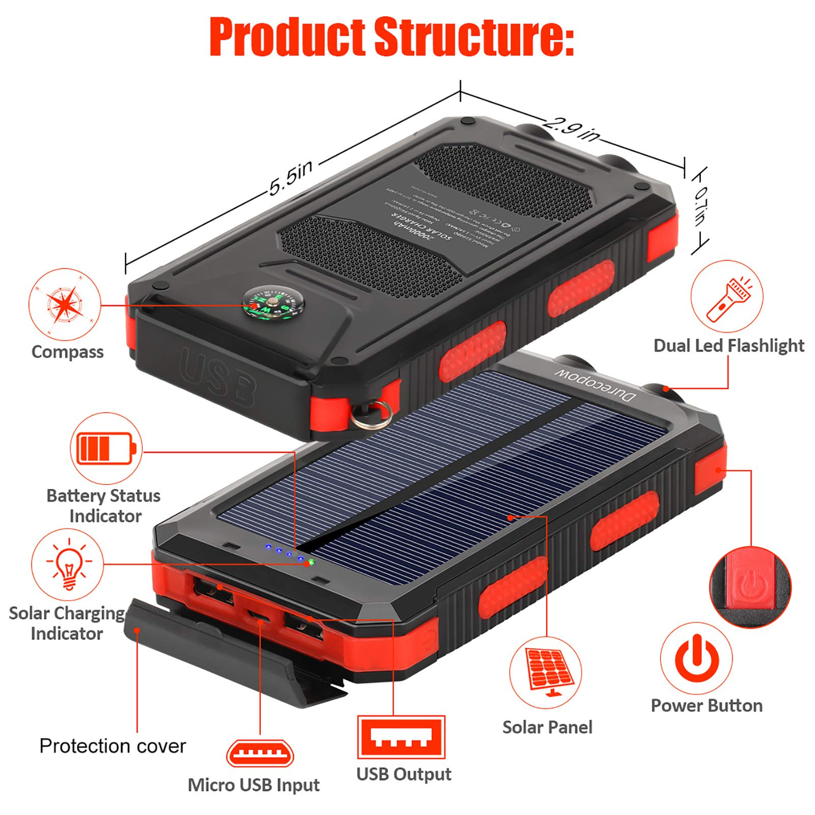 High-Quality Portable Solar Charger - water-resistant, shock-resistant and dustproof solar phone charger, featured with carabiner, compass, and 2LED flashlight. Solar power bank provides more convenience in your daily or on your trip. Awesome for outside activities such as camping, hiking, and other emergency use. The solar USB battery pack can be regards as a nice gift. Two Charging Way - External battery charger with solar panel can recharge by solar or outlet. Compatible with your iPhone, Samsung, HTC, Nexus, Go-pro Camera, Tablets and other USB devices. More than 1000+ recharge lifecycle. Dual USB and Powerful LED Light - It makes it easy to charge two smartphones simultaneously or a tablet at full speed. 2 led lights can be used as flashlight with Steady-SOS-Strobe mode. Five pilot indicators show the status of the battery charger timely. The green light on when charging by a solar, blue light on when USB charging. Safety for Use - Made of eco-friendly silicone rubber and ABS PC material. CE, FCC, RoHS certified, reliable and durable. Solar charging is a charging way for emergency use, and solar panel charging efficiency will be influenced by natural conditions and random factors, such as day and night, season winter and summer, sunny, cloudy, rainy, and so on, so it may take a long time to be charged. Best Warranty for Solar Phone Charger - 12 months Warranty, 24h online after-sales service, Friendly replace policy. We take pride in the quality of our products. Any related issues are guaranteed with friendly REPLACEMENT or REFUND, and also support 24h online after-service. Please CONTACT US if you have any problems with the items from HQT-US Store.