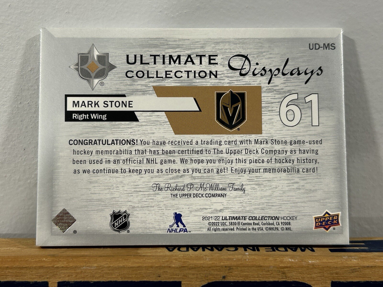 2021-22 ULTIMATE COLLECTION ULTIMATE DISPLAYS JERSEY MARK STONE #UD-MS KNIGHTS Combine shipping is $0.50/per card or $1.00/per lot Shipping to Canada is $3 and to United States is $10 PLEASE NOTE: Some cards shipped may take longer to arrive then expected given delays in Canada Post and United States Postal Services. Please be patient. Could be 2wks to a month in some areas so please take this into consideration when bidding as I do not guarantee the estimated arrival times provided through the shipping options on ebay so please be patient