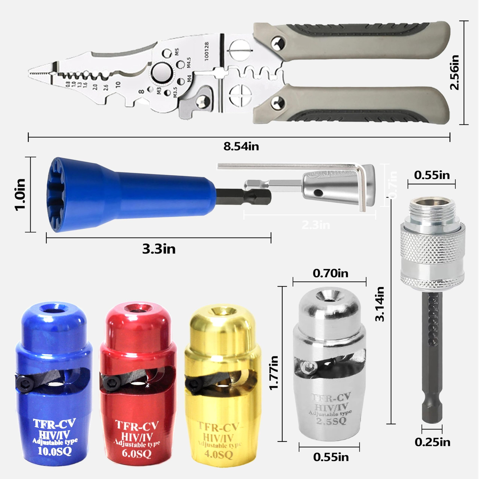 【2024 New Wire Stripping and Twisting Tool】: Introducing the latest innovation in wire tools for 2024. By the electric drill, the wire sheath will rotate out along the groove of the electric wire stripper. Wire stripper tool for drill is more convenient and faster than the old manual wire stripper. 【Easy to Install and Use】Simply attach the wire connector driver to a power drill and twist wires easily and efficiently. wire stripper can be used with handheld drills and power tools for fast wire stripping results, and the tool can be connected in parallel over 30,000 times. Under the action of the drill, the wire sheath rotates out along the grooves of the wire stripper. 【Electric Wire Stripper - Sturdy Material】:Electric Wire Stripper - Crafted from high-quality aluminum alloy using a high-temperature extraction process, this electric wire stripper boasts high hardness, strong wear resistance, and excellent heat resistance. Wire stripper for drill is a durable and reliable tool for your wire-stripping needs. 【Professional Electrician Tool Set】: Portable aluminum alloy electrician fast peeling tools - enjoy user-friendly operation with adjustable stripping length, offering a range of 10~33mm. This electrical tools feature provides flexibility and precision for various wire-stripping needs.Say goodbye to tedious manual work and embrace the efficiency of modern tools. 【5 IN 1 Wire Stripping and Twisting Tool】Our wire stripper machine includes 2.5 sq.ft wire stripper head x1, 4 sq.ft wire stripper head x1, 6 sq.ft wire stripper head x1, wire stripper head x1, connecting rod x1, wrench x1, plastic box x1, wire twister x1.In addition, we also provide an additional multi-functional wire stripper with the functions of crimping pliers and wire cutters to meet all your needs. It is a perfect set