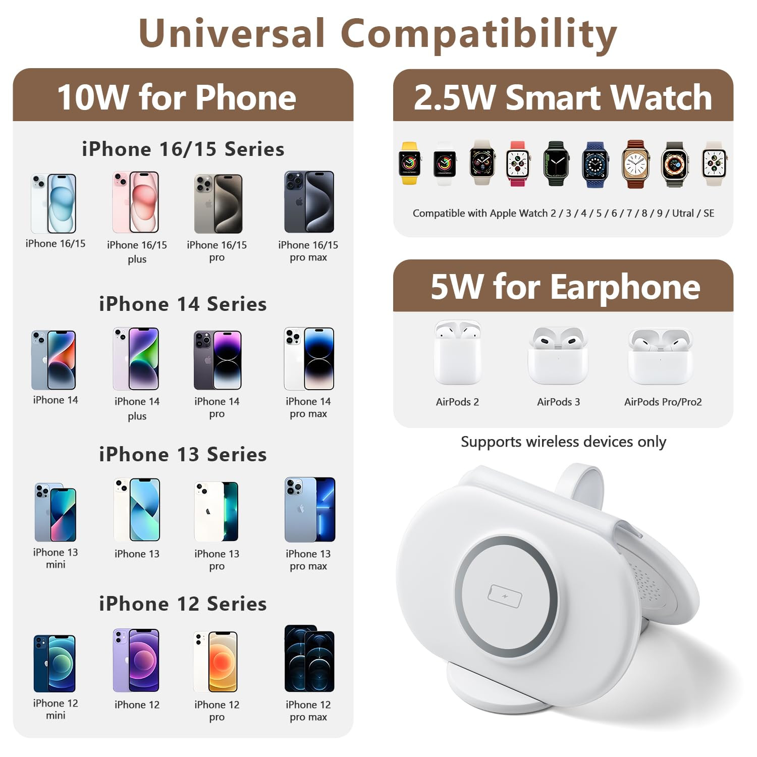 3 in 1 portable charger:The charging station for Apple multiple devices is a great option to organize your home, office, or meeting room. It lets you say goodbye to tangled cords and messy cables, keeping your space neat and organized Fast Wireless Charging Station:3 in 1 charging station a-pple compatible for Apple Watch Ultra10/9/8/7/6/5/4/3/2 and Air pod 4 3/2/pro(Supports wireless devices only);i Phone 16/15/14/Pro/Plus/Pro Max;13/12/Pro/Pro Max,12/13 Mini;With an 18 W quick charger, you can fully charge your device in just 2.5 hours Strong magnetic: A-pple wireless cell phone charger is characterized by high-quality magnets to ensure that the wireless charging coils of your smartphone are easily aligned; precise magnetic absorption brings a fast and stable charging experience Portable and Foldable Charger:This foldable travel charger stand is a great addition to your travel gear, lightweight and portable, easy to pack in a bag or suitcase; It also doubles as a phone stand, allowing you to adjust it horizontally or vertically for easy movie-watching or calls Charging Protection: Adopting advanced intelligent and high-efficiency components; providing foreign object detection, short-circuit prevention, over-charging and over-voltage, etc.; preventing intermittent charging and overheating due to mismatch High-Quality Design:Our iPhone charging pad is F-CC certified; which can prevent damage to the camera and ensure stable charging, and will not interrupt charging due to the gap between the mobile phone and the charger;you can rest assured of the safety and reliability of; it is a gift choice for friends Note:The outer ring of the charging station is silver in colour with a blue protective film on the surface to prevent scratches during transport; please peel off the blue protective film from the surface before use;great for travel/home/office and other scenarios