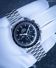 The Speedmaster Moonwatch is one of the world’s most iconic timepieces. Having been a part of all six moon landings, the legendary chronograph is an impressive representation of the brand’s adventurous pioneering spirit. Presented on a brushed five-arched-links-per-row bracelet, this 42 mm Moonwatch in stainless steel features hesalite glass on the front and an embossed Seahorse medallion on the caseback. Inspired by the 4th generation Speedmaster style worn on the moon, it also includes an asymmetrical case, black step dial and the famous dot over 90 on the anodised aluminium bezel ring. The watch is driven by the OMEGA Co-Axial Master Chronometer Calibre 3861, which powers the small seconds sub-dial, 30-minute recorder and 12-hour recorder, along with the central chronograph function.