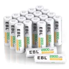 20-Counts AA Rechargeable Batteries 2,800Mah High Capacity AA Batteries Low self-discharge batteries will remain 80% juice when you leaving it for no use 1 year. Durable storage case included, providing a better protection while shipping and daily storage. Package: 20 quantities AA rechargeable batteries, Ni-MH 2800mAh 1.2V. Ensure the battery charger can charge 1.2v Ni-MH batteries. Ni-MH eco-friendly cell, doesn’t contain Hg/Cd/Pb, makes no pollution to the environment. Note: Please ensure the battery installed is correct: make the +/- pole of the battery is match for the +/- pole of the device. About EBL EBL, since 1998, professional on batteries and chargers more than 26 years. Professional and reliable on AA/AAA/C/D Rechargeable Batteries and Battery Chargers. About EBL AA Ni-MH Rechargeable Batteries * Quantity: 20 counts batteries * Voltage: 1.2V Capacity: 2800mAh * Precharged 15%~20% of capacity by solar energy. Could be used when you get it. * Excellent charge/discharge performance, the batteries will keep a high quality after 3-5 times charge & discharge when used in the first time or long time no used. * Doesn't contain Hg/Cd/Pb, no pollution to the environment. * Great for high power demand devices such as digital camera, children' toys and so on. * Durable case, convenient for storage and taking on the go. What You Get 20 X EBL AA 1.2V rechargeable batteries 5 X Battery Storage Case