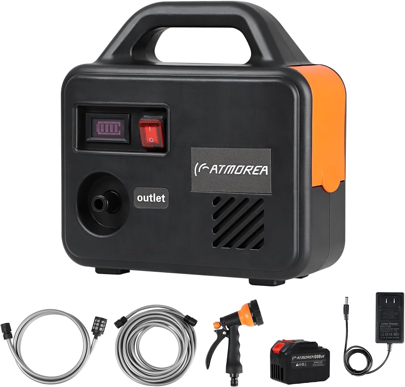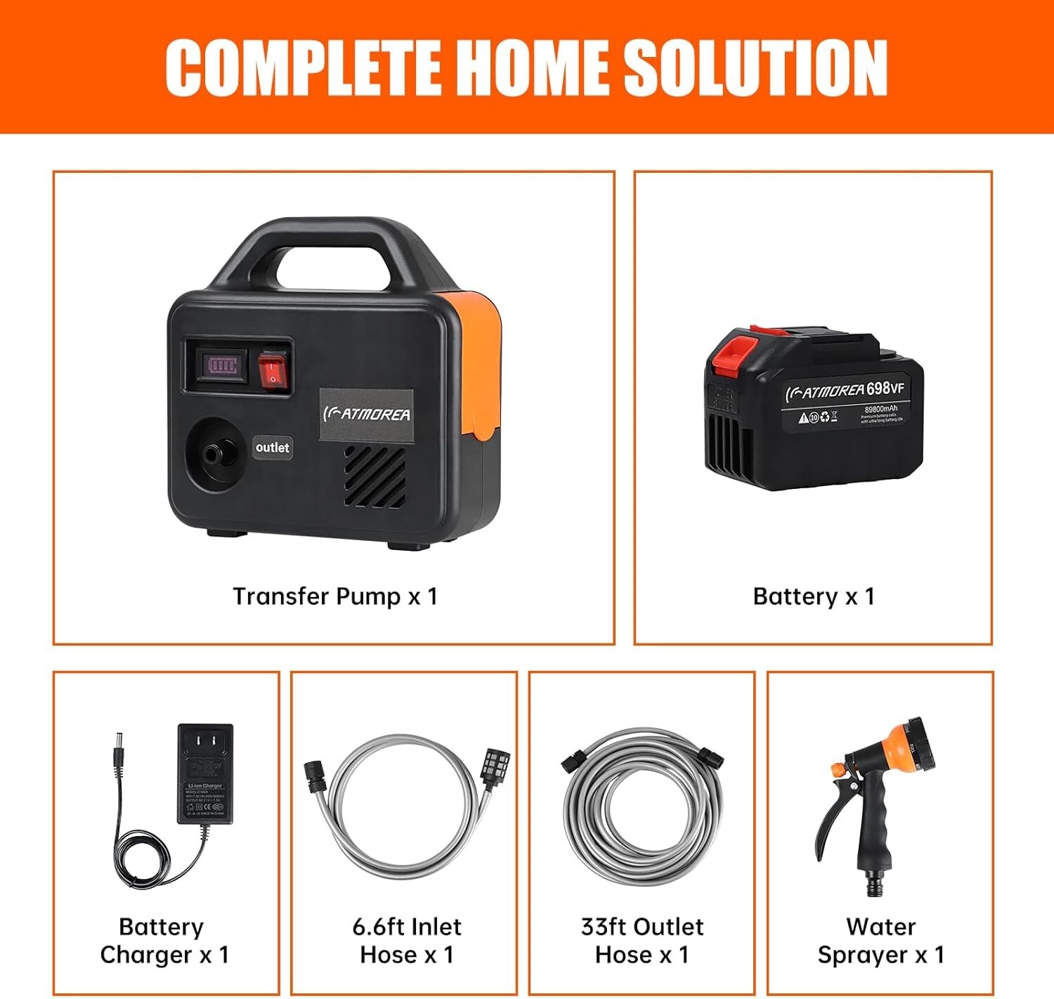 Cordless Water Transfer Pump 20V Battery 200GPH Portable Electric Utility Pump with Water Hose Kit for Garden, Tub, Tank, Aquariums, Inflatable Pool 【Cordless Design】Unleash the power of portability with our Cordless Water Pump, driven by a 21V 3Ah battery (included). Enjoy to move it effortlessly anywhere, from gardens and tubs to tanks, aquariums, inflatable pools, and even for car washing – no power outlet constraints! 【Complete Home Solution】Your ideal home use kit comprises 1 transfer pump, 1 rechargeable battery, 1 battery charger, a inlet hose, a 33ft outlet hose, 1 suction filter, and 1 water sprayer. Everything you need is right here, ready to use at the push of a switch. 【Conveniently Portable】Enhanced stability meets unmatched convenience. The smooth, non-slip bottom design ensures a secure grip during operation, while the easy-carry handle on top makes it a breeze to move around. Connect the hose, press the switch, and let the pump do the rest! 【Powerful Performance】Experience the strength of our water suction pump, boasting a suction lift of up to 6ft, a max flow of 200GPH, and a 45ft max head lift. Versatility is key, and our pump, equipped with an adjustable water sprayer featuring 7 modes, caters to all your multi-scene needs. 【Durable and Dependable】The 1/2" inlet and outlet connections fit standard garden hoses seamlessly. The robust thermoplastic composite housing and alloy motor ensure durability, while the splash-resistant battery cover adds an extra layer of protection. Stands the test of time for all your home needs.