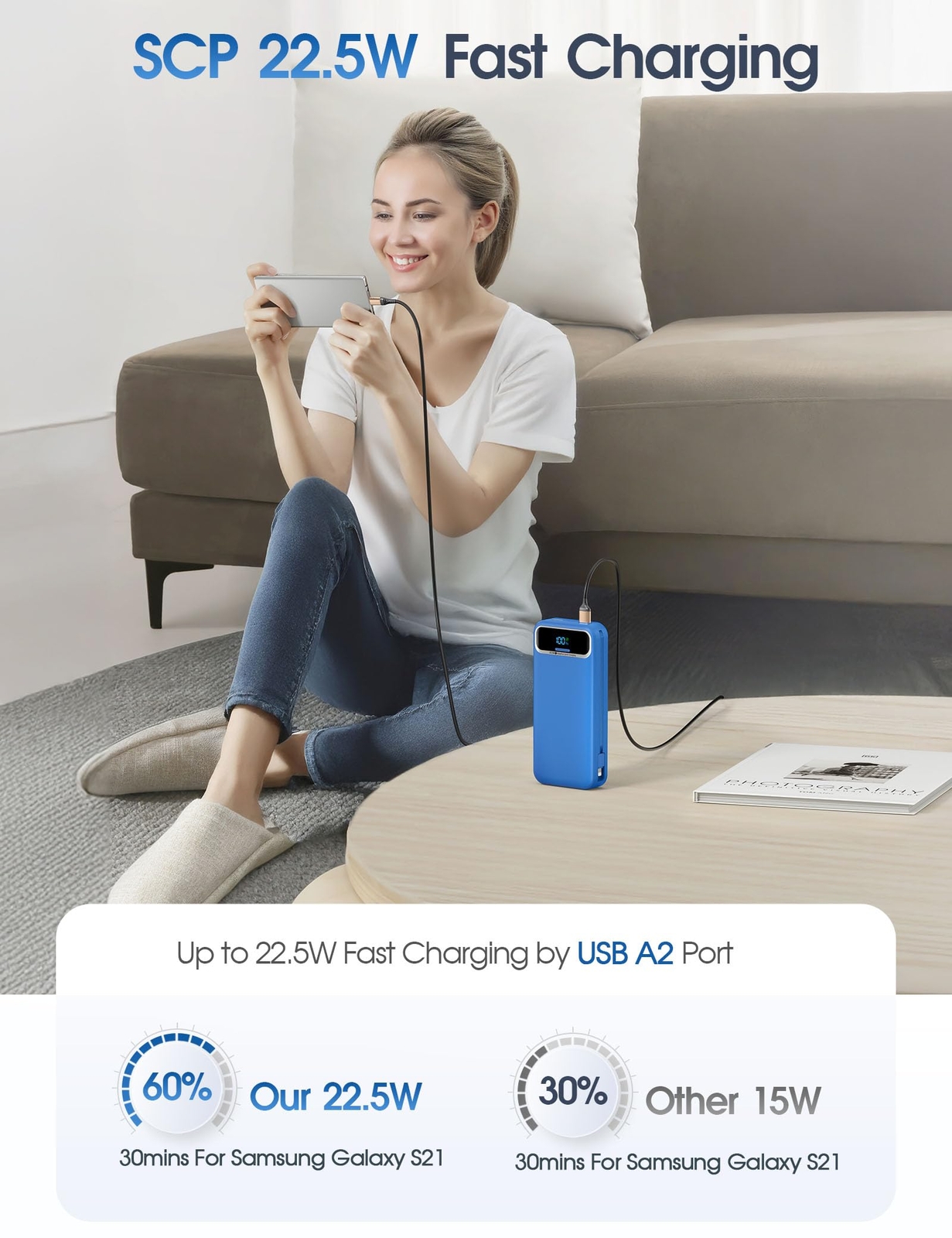 This power bank is a game-changer for travel! No more hunting for cables or adapters—it has built-in Type C and Lightning cables plus an AC wall plug for hassle-free charging. The 20,000mAh capacity keeps my devices powered all day, and the fast-charging ports (including a 22.5W USB-A) are incredibly quick. Love how compact it is despite packing so many features. Perfect for iPhones, Androids, and USB-C gadgets. Never leave home without it!