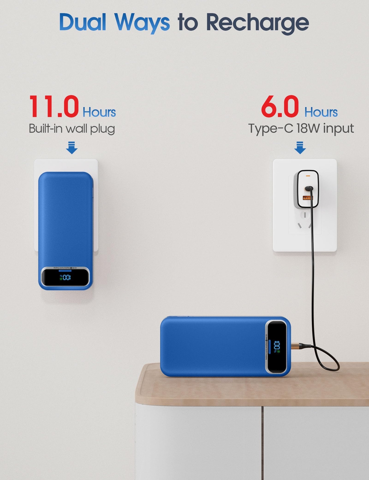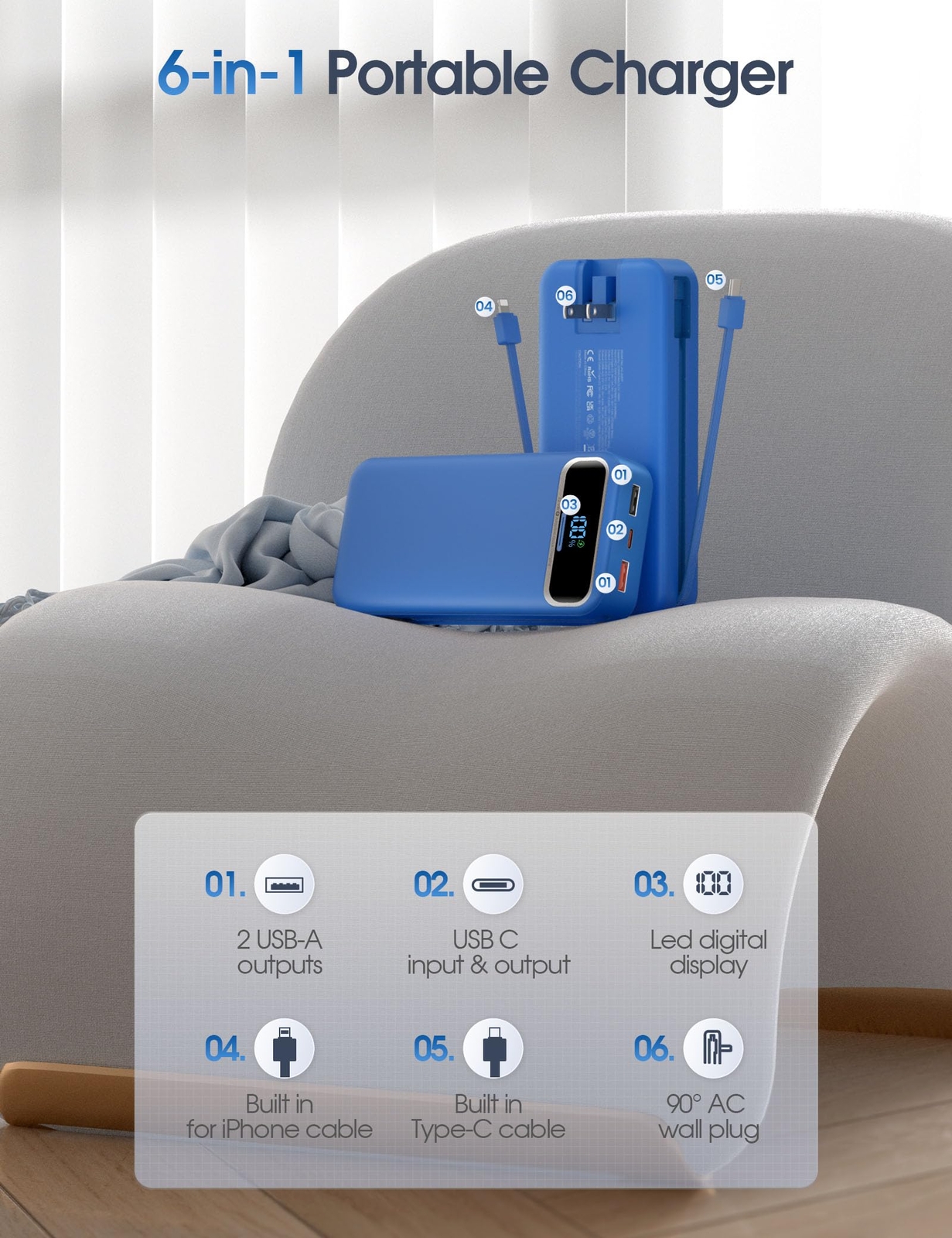 Built-in Cables and AC Wall Plug:20000mAh portable charger built-in Type C and iOS 2 types cables,compatible with iPhone,USB C devices. Portable phone charger is built-in wall plug that charges the power bank itself directly from the wall outlet.You don't need to worry about carrying adapters and cables when travel. Fast Charging Power Bank: This Portable phone charger has two USB-A and 1 USB C ports.The USB-A2 port of this portable power bank delivers up to 22.5W of ultra-fast charging, significantly boosting charging efficiency and reducing wait times. The suitable travel companion for your smart devices. Two Ways Recharging Options:This battery pack charger supports two charging methods. One is through the AC wall plug (100-240V), which can fully recharge in 11 hours.The AC Wall Plug can be folded 90 degrees for easy storage. The other is via Type-C cable input, which can fully recharge in 6 hours. Designed for multiple devices:This portable charger can simultaneously charge up to 5 devices, widely compatible with All iPhone, iPad, Samsung, tablets, just connected to your device,the LED digital display makes it easy to keep track of the remaining power, you can replenish the external battery when you need it. What You Get: 20000mAh power bank *1, user manual*1,USB A to C Cable*1, our 12 months support, and 7 days/24h friendly customer service. If you have any problems, please contact us and we will solve them within 24 hrs.