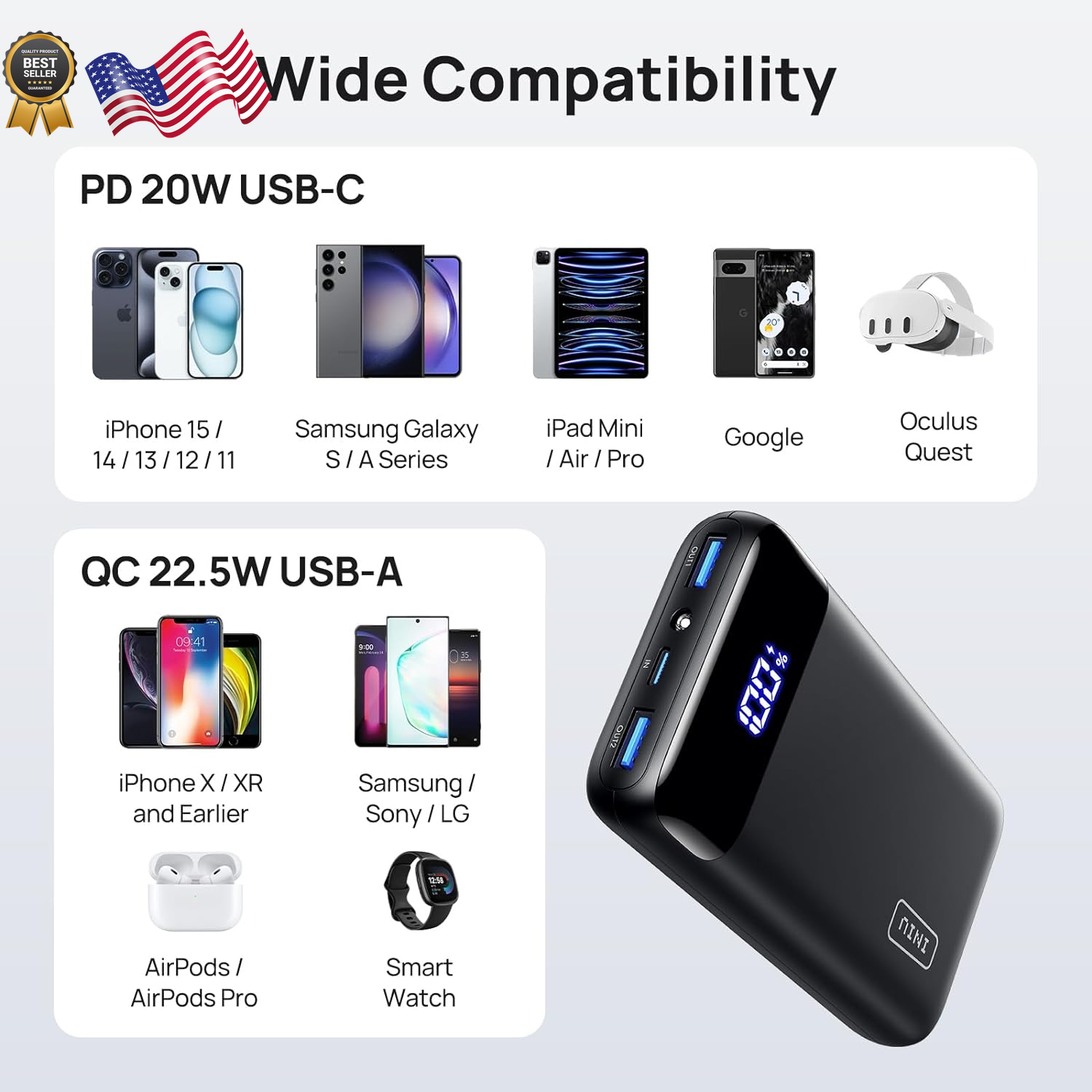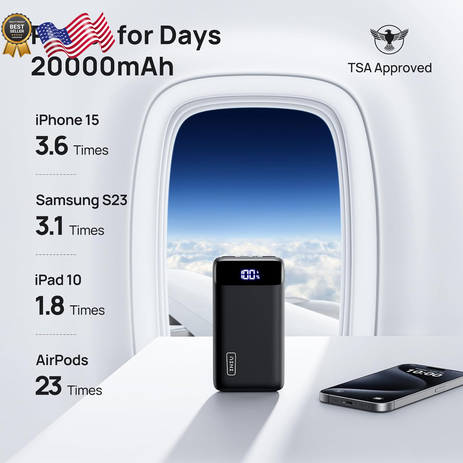 Fast Shipping On All Items 30 Days Money Guarantee Customer Support Excellent Service 100% Satisfaction Satisfaction Guaranteed Portable Charger 22.5W 20000Mah USB C in & Out Power Bank Fast Charging Specification Battery Cell Type Lithium Polymer Power Source Corded Electric Item Dimensions L x W x Thickness 5.3"L x 2.8"W x 1"Th Warranty Type 30 days money-back guarantee, industry-leading 3 years warranty and lifetime technical support. Model Number BI-B5 Unit Count 1.0 Count Connector Type Used on Cable USB Type C, USB Type A Additional Features LED Indicator Lights, Lightweight, Flashlight, Fast Charging Battery Capacity 20000 Milliamp Hours Connector Type USB Type C, USB Type A Item Weight 12.8 Ounces Number of Ports 3 Special Feature LED Indicator Lights, Lightweight, Flashlight, Fast Charging Amperage 4.5 Amps Portable Yes Color Black Compatible Devices [For iPhone] iPhone 16, iPhone 16 Plus, iPhone 16 Pro, iPhone 16 Pro Max, For Steam Deck, MacBook Air, Cellphones, Tablets, AirPods, [For Sumsung] Galaxy S23 ultra/ S22 /S22 ultra/ S22/ S21/ S20/ S10/ S9/ Sumsung Note 20/ 10/ 9, [For iPhone] iPhone 15/ iPhone 15 Plus/ iPhone 15 Pro/ iPhone 15 Pro Max/ iPhone 14 Pro/ 14 Plus/14 Pro Max/iPhone 13/ 13 Pro/ 13 Pro Max/ iPhone 12/ 12 Pro/ 12 Pro Max / iPhone 11/ 11 Pro/ 11 Pro Max / iPhone SE (2nd generation)/ iPhone XS / XS Max/ XR/ X/ iPhone 8 Plus/ 8, For ALL 【iPhone】iPhone 16, iPhone 16 Plus, iPhone 16 Pro, iPhone 16 Pro Max, iPhone 15, 15 Plus, 15 Pro, 15 Pro Max, iPhone 14, 14 Plus, 14 Pro, 14 Pro Max, iPhone13 Pro, iPhone 13 Pro Max, iPhone 13 mini, iPhone 13, iPhone 12 Pro, iPhone 12 Pro Max, iPhone 12 mini, iPhone 12, iPhone 11 Pro, iPhone 11 Pro Max, iPhone 11, iPhone SE (2nd generation), iPhone XS, iPhone XS Max, iPhone XR, iPhone X, iPhone 8, iPhone 8 Plus; 【Samsung】Samsung galaxy S23 Ultra / S23 / S23+ /Samsung galaxy S22 Ultra / S22 / S22+ / S21 Ultra /S21+ / S21 / S20 Ultra / S20+ / Z Flip / S10 / S10+ / Note20 / Ultra / Note10 / Note10+ / Note9 / S9 / S9+ / Note 8 / S8 / S8+ / S7 Edge / S7 / Note5 / S6;【Google】Google Pixel 6, Google Pixel 6 Pro, Google Pixel 5,Google Pixel 4A,Google Pixel 3a,Google Pixel 3XL, Google Pixel 3,Google Pixel 2 XL,Google Pixel 2;【iPad】iPad Pro, iPad Air【Watch Series】Apple Watch Series 9, Apple Watch Series 8,【AirPods】AirPods Max, AirPods Pro, AirPods etc Voltage 5 Volts Recommended Uses For Product Iphone,Tablet,Tablets Is Product Cordless No Size Classic Size 2.8 inches x 5.3 inches x 1.0 inches. Weight: 12.8 oz Item Description [From INIU--the SAFE Fast Charge Pro] Experience the safest charging with over 38 million global users. At INIU, we use only the highest-grade materials, so we do have the confidence to provide an industry-leading 3-Year iNiu Care. [3X Ultra-Fast Charging] The newest 22.5W Power Delivery 3.0 USB C port, plus dual QC 4.0+ USB outputs, to revolutionize your experience of speed, especially bring iPhone 13 from 0 to 52% just in 25mins, 3X faster than regular 1A chargers. [7 Days of Safe Power] Enjoy a full week’s worth of charging capacity with the airline-approved 20000mAh power bank. [Even Wider Compatibility] Unlike the market’s most power banks incapable of charging low-current accessories, INIU PD3.0 Super portable charger can work with not only all the phones, tablets but your smaller devices like AirPods, Bluetooth headphones, fitness trackers, smartwatches, etc. [What You Get] INIU 20000mAh power bank*1, USB C cable*1, travel pouch *1, welcome guide*1, industry-leading 3-Year iNiu Care, plus lifetime technical support. Product Description 1 Faster Charge iPhone 2 Faster Charge iPad 3 Faster Recharge Charge & Recharge via the Same One USB-C Port Charge Your Devices Directly via Original USB-C to USB-C or USB C to Lightning Cable. Charge the PowerBank via USB-C Cable . 20000mAh for Days out 20000mAh huge capacity is stored in a compact body weighing 12.8oz/365g . Comply with TSA carry-on baggage battery rules under 27000mAh . Safe Charging for 3 Devices AutoFit matches ideal charging power to devices from big to small. Charge with Peace of Mind 15-Layer SmartProtect shrugs off 15 possible charging risks: farewell overheating and device damage. 1 3 Years Replacement 2 AutoFit 3 15-Layer SmartProtect 4 Emergency Flashlight Why Does It Feel Like a 'Not Sure 20,000mAh'? Rated Capacity 20,000mAh Understanding Capacity Loss All the power banks could only supply 60%-70% battery to other devices, since around 30-40% of the capacity is lost in circuit heat and voltage conversions.(Actual Capacity ≈ 12000-14000mAh) General Formula (PowerBank Rated Capacity × 0.6) ÷ Device Battery Capacity ≈ Number of Charges eg. (20000mAh Powerbank × 0.6) ÷ 3279mAh iPhone14 battery ≈ 3.6 charges Full Recharge Time It depends on the power of the wall charger used: 18W fast charger - 6hrs; 5V/2A charger - 10 hrs; 5V/1A charger - 20 hrs 20000mAh 22.5W Power Bank Power Options Await 2.8 Charges iPhone 14 Pro Max 1.4 Charges 3.9 Charges iPhone 13 1.9 Charges 4.3 Charges iPhone 12 Pro 2.1 Charges 3.1 Charges Samsung S23 1.5 Charges 1.5 Charges iPad Pro 0.8 Charge 5.3*2.8*1.0in Size 5.3*2.8*0.6in 12.8oz/365g Weight 7.4oz/210g 2.8 Charges iPhone 14 Pro Max 2.1 Charges 3.9 Charges iPhone 13 2.9 Charges 4.3 Charges iPhone 12 Pro 3.2 Charges 3.1 Charges Samsung S23 2.3 Charges 1.5 Charges iPad Pro 1.2 Charges 5.3*2.8*1.0in Size 5.8*2.8*0.9in 12.8oz/365g Weight 11.7oz/334g 2.8 Charges iPhone 14 Pro Max 3.5 Charges 3.9 Charges iPhone 13 4.8 Charges 4.3 Charges iPhone 12 Pro 5.3 Charges 3.1 Charges Samsung S23 3.8 Charges 1.5 Charges iPad Pro 1.9 Charges 5.3*2.8*1.0in Size 5.85*2.87*1.34in 12.8oz/365g Weight 16.7oz/475g 10000mAh 22.5W Power Bank 15000mAh 45W Power Bank 25000mAh 100W Power Bank About us We offer the best prices around on high quality products. Our E-store includes media such as books, movies, music and games while offering electronics, toys, sporting apparel, clothing, tools, general home, garden items a