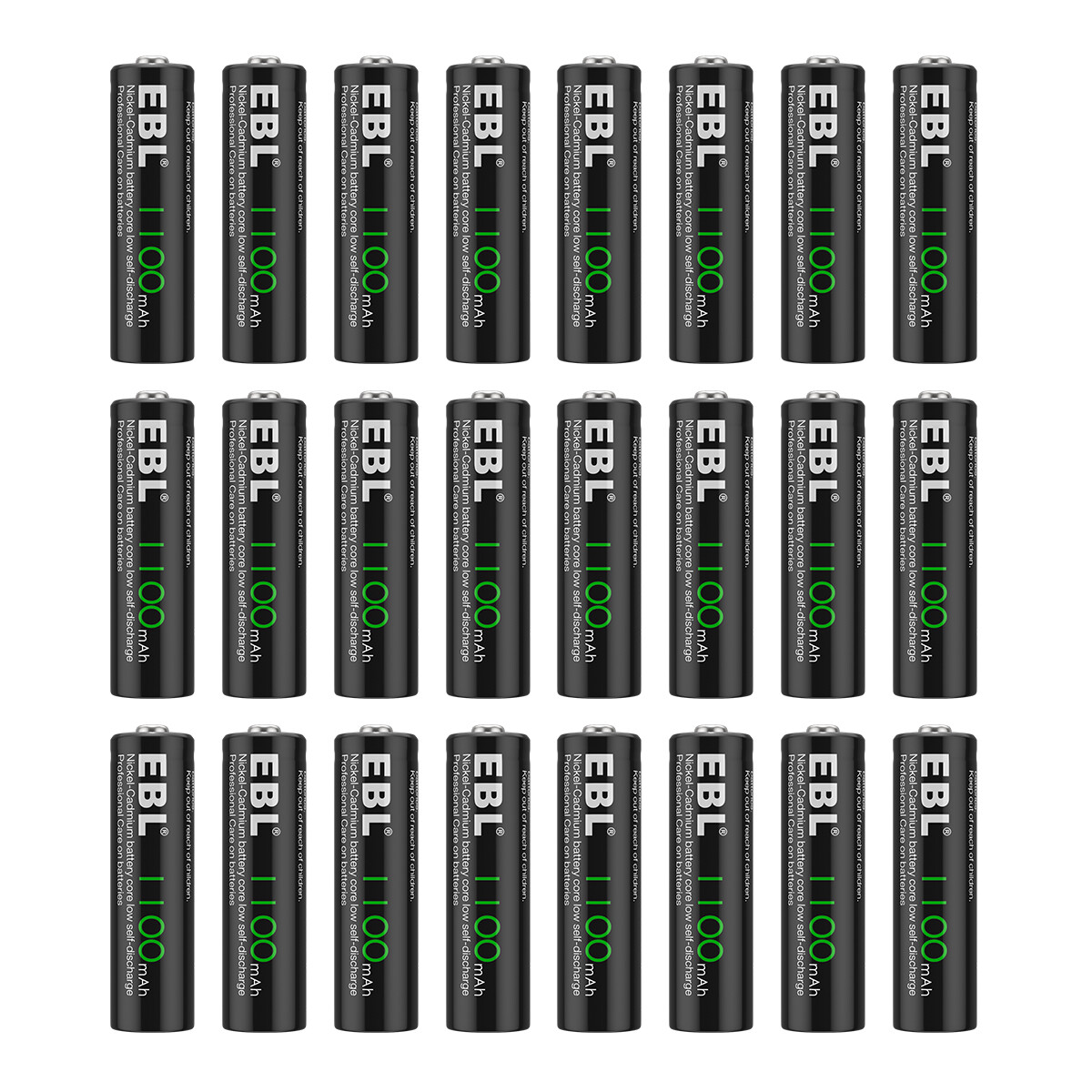 Features: High Capacity & Long Lasting Time - 1100mAh High Capacity can give you more run time when fully charged. Also can replace 600mAh, 800mAh, etc NiCd AA cells AA battery. Match Your Device Perfectly - Perfect used for solar powered garden lights, landscaping lights, lawn lights, etc. replace all alkaline disposable batteries that power your TV remotes, wireless mouse and keyboards, gaming controllers, RC remotes and others. Good Performance - Much better high temperature performance than other type batteries, can be used in -4℉ to 140℉, They can be charged from the sun even in the snow. Low self-discharge - Embedded seal structure expand the space of crystal lattice, make more room for hydrogen, so EBL batteries will holds 75% power after 3 years benefit from its concentration to low self-discharge project. Storage Cases - every 4 batteries we packed in one professional battery storage case - carefulness due to professional Specifications: 1.Battery Type: AA 2.Capacity: 1100mAh 3.Voltage: 1.2V 4.Chemistry: Ni-CD 5.Weight: 7.8 ounce (220 g) Package Included: 24 x 1100mAh AA Battery