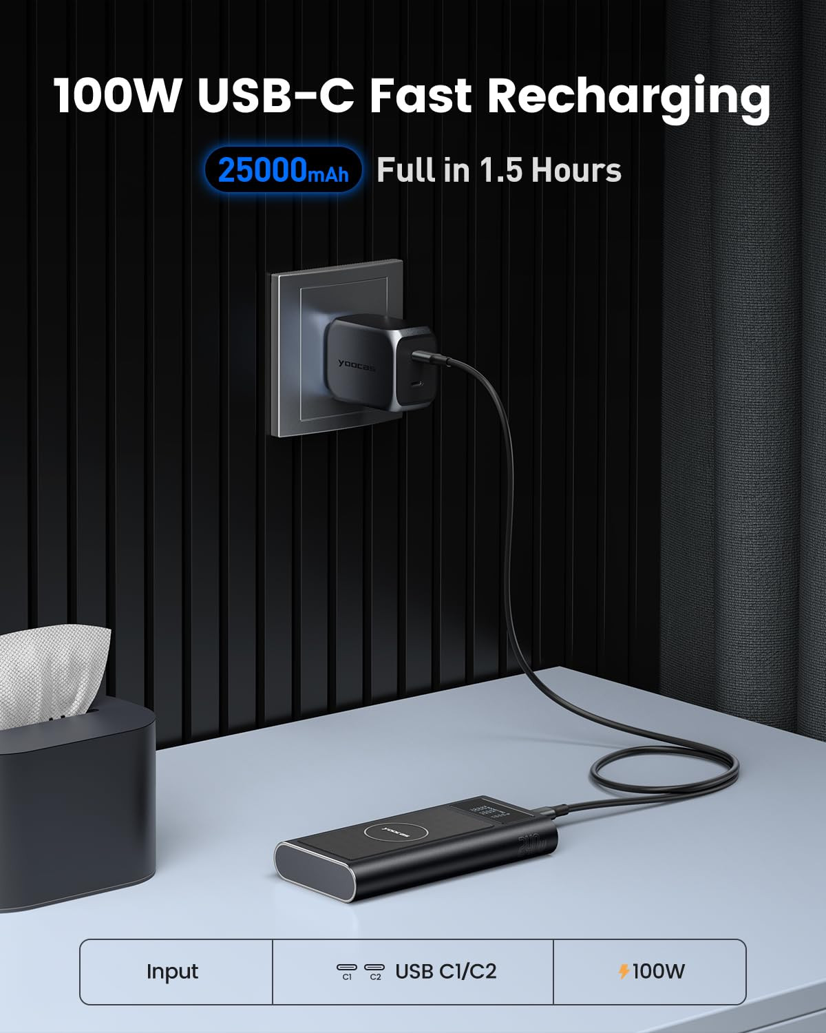 [๐ฅ๐ผ๐ฐ๐ธ๐ฒ๐ ๐ฃ๐ฟ๐ผ ๐ฎ๐ฐ๐ฌ๐ช ๐ฎ๐ป๐ฑ ๐ฎ๐ฑ๐ฌ๐ฌ๐ฌ ๐บ๐๐ต]: With an amazing 240W total output power and 25000 mAh capacity, this power bank supply for laptops ensures that your device will never run out of power. With the 100W USB C port, it can quickly charge your MacBook pro 16" up to 50% in less than 30 minutes, saving you time.Note: For 100W fast output, use the 100W 5A bi-directional type-c to type-c cable (included in the Rocket Pro package) [๐๐ต๐ฎ๐ฟ๐ด๐ฒ ๐ฑ ๐ฑ๐ฒ๐๐ถ๐ฐ๐ฒ๐ ๐ฎ๐ ๐๐ต๐ฒ ๐๐ฎ๐บ๐ฒ ๐๐ถ๐บ๐ฒ]: Rocket pro portable charger has 4 ports, C1 and C2 for devices in 100W, C3 for devices in 30W, and USB A for devices in 30W, Rocket pro is also a wireless powerbank, you can use it to charge your smartphone, AirPods, and smartwatches without cables.Get it now and keep all your devices fully charged on the go [๐ข๐๐๐ ๐๐ถ๐ด๐ถ๐๐ฎ๐น ๐๐ถ๐๐ฝ๐น๐ฎ๐&๐๐น๐๐บ๐ถ๐ป๐ถ๐๐บ ๐๐น๐น๐ผ๐ ๐ฆ๐ต๐ฒ๐น๐น] The smart OLED digital display perfectly summarizes parameters: 1.Remaining battery power 2. Symbol of Rocket Pro, 3. Wireless Charging Icon(Only showed when wireless charging is working) 4. The output power and voltage per port. Aluminium Alloy Shell with woven design for wireless panel part make this powerful power bank looks high-end and durable [๐ช๐ถ๐ฑ๐ฒ ๐๐ผ๐บ๐ฝ๐ฎ๐๐ถ๐ฏ๐ถ๐น๐ถ๐๐]: The Battery Pack is compatible with "PD3.0", "PPS", "QC4.0", "SCP", "FCP", and "AFC" fast charging protocols, so your devices are always equipped with fast and efficient charging. Suitable for Laptop, Macbook, Dell, HP, Lenovo, Samsung, iPhone, iPad, AirPods and other devices [๐ฆ๐๐ฝ๐ฒ๐ฟ๐ถ๐ผ๐ฟ ๐ฆ๐ฎ๐ณ๐ฒ๐๐ ๐ฆ๐๐๐๐ฒ๐บ]: You and your deviceโs safety is always the first priority for . Rocket Pro come with over-charge protection, over-voltage protection, over-temperature protection, short-circuit protection and over-discharge protection, Which ensure the power bank will be shut down. So that both Rocket Pro and your devices be protected from the danger [๐ฃ๐ฎ๐ฐ๐ธ๐ฎ๐ด๐ฒ ๐๐ผ๐ป๐๐ฒ๐ป๐๐]: Package contents: 240W Rocket Pro laptop wireless power bank 25000mah, 100W two-way TypeC-C cable (1.5m), A pouch for Pocket Pro, user manual, 7x24 friendly customer service, and lifetime technical suppor if there're any problem with the product.