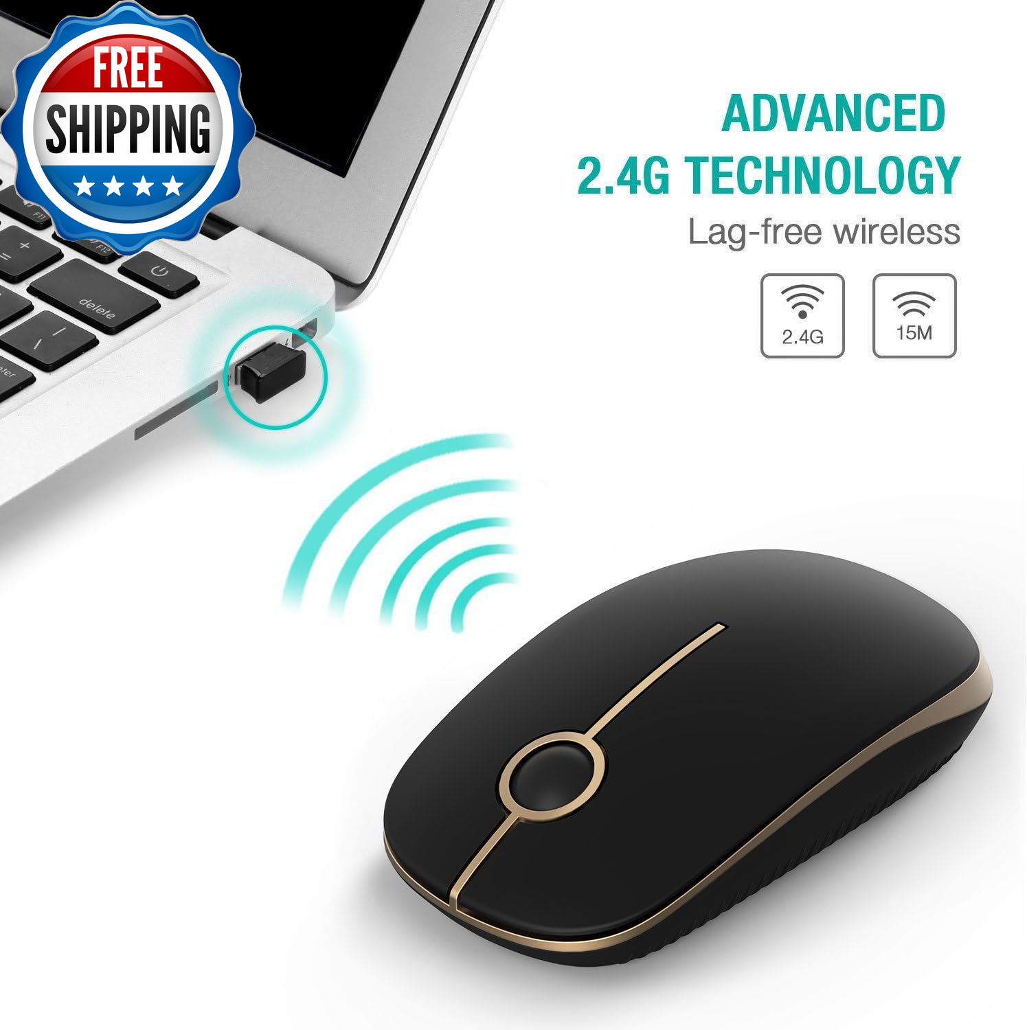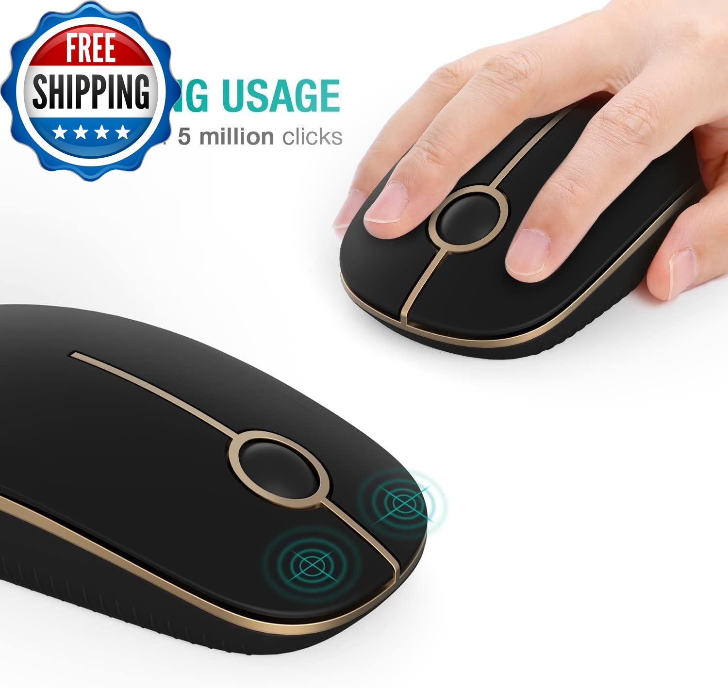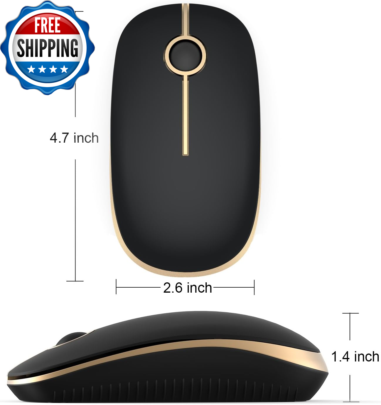 Wireless Mouse - 2.4G Slim Portable Computer Mouse with Nano Receiver, Less Noise Mobile Optical Mice for Notebook, PC, Laptop, Computer, Mac (Black and Gold) 2.4GHz Stable Wireless Connection - A tiny wireless receiver (stored in back of the mouse) provides stronger anti-interference ability, faster transmission speed and more reliable connection up to 15m (49 feet), without any hassle of additional wire and driver. Just plug and play. Portable and Noiseless - Stow the USB receiver inside the wireless mouse when not in use. Take it to anywhere like home, office, coffee shop, etc. Responsive buttons provide soft click with less noise. Ergonomic Shape & Smooth Hand Feeling - Slim ergonomic design and smooth surface for an incredible user experience. Black and gold color perfect for office use, and can match any color device. Enduring Quality & Power Saving - High DPI Movement resolution allows the mouse to track on nearly any surface. Rated to 5 million comfortable clicks. Turn into sleep mode in 8 minutes of inactivity for energy saving, easily activated by clicking any button. 1 AA Battery (NOT Included) is needed for this mouse. Wide Compatibility - Work with Windows XP, Windows Vista, Windows 7, Mac OS X 10.4 etc. NOTE: This product is connected by USB receiver, and is NOT compatible with Macbook pro or other laptops which only come with type C port. Product Description Lightweight & Slim Multi-stage power saving mode, less power consumption. The wireless mouse turn to sleep mode in 10mins of inactivity for energy saving, and can be activated by clicking any buttons. Quiet Clicking Quiet clicking takes the worry out of disturbing others, the advanced sensor silent design provides noiseless clicking. Enduring Wireless Mouse The USB receiver is located on the back of the mouse. Only 1 AA battery (not included) is required to operate this mouse and the battery life can be up to 18 months. Color Black and Gold Product Dimensions 4.7 x 2.6 x 0.04 inches Country of Origin China Item Weight 2.4 ounces Connectivity Technology USB Movement Detection Technology Optical Special Feature quiet Shipping Fast shipping is very important for us. Our standard US shipping service is FREE. Your order will be shipped within 2-3 business days upon full payment received. Your order will be delivered within 2-3 business days after the handling time. We only ship to the confirmed PayPal address. We reserve the right to cancel any order for any reason at any time. We are not responsible for undeliverable addresses. Returns and payment We offer a 30 days return policy from checkout winning date. We allow only PayPal as payment method FeedBack Your feedback very important to us, after you get your package and you are satisfied with our service please leave us positive feedback If you have any problem with your order / any questions please before leave any type of feedback Please visit our eBay store to check out other items for sale! Thank you for shopping at our store.