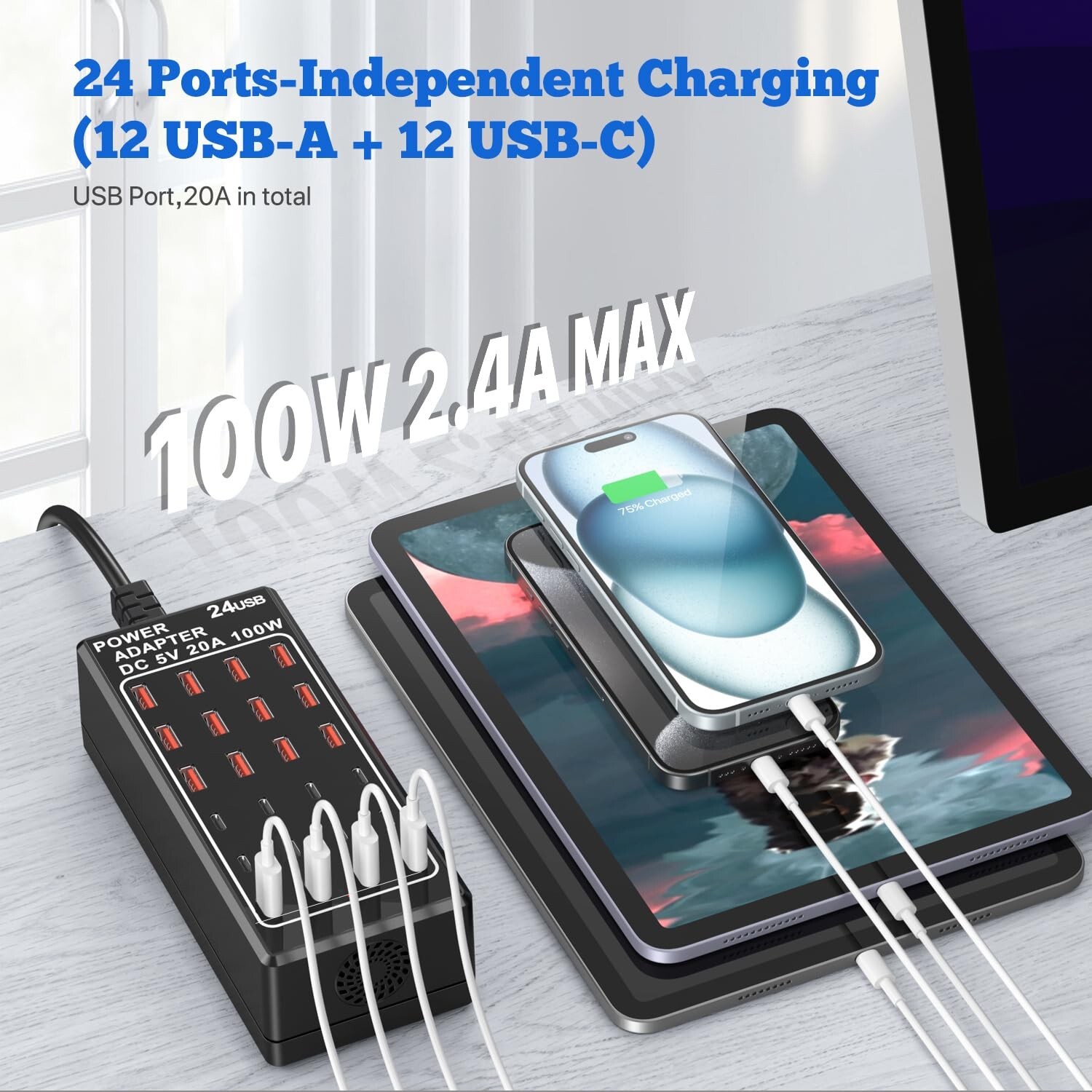 USB Charging Station Block, USB C Charger Station 24-Port 100W(20A), USB A Charger Block, Fast Charger Desktop Station, Multi-Function Smart Charger for Apple iPhone iPad Samsung Laptop Pixel Product Details Size: 24Ports(12A+12C)-100W Brand: DeBangsi MPN: ZETX24C01B UPC: 669423616818 EAN: 0669423616818 Brand: DeBangsi Connectivity Technology: USB Connector Type: USB Type C, USB Type A Compatible Devices: Smartphones, Headphones, Tablets, Laptops, E-Book Readers Compatible Phone Models: IPhone 15/15 Plus/15 Pro/15 Pro Max/IPhone 14/14 Plus/14 Pro/14 Pro Max/13/12/12pro/12mini/12pro max/se11 / 11 pro/ 11 pro max / XS / XS Max / XR / X / 8 Plus / 8 / 7 Plus / 7 / 6 Plus / 6 /6S, iPad Pro 11 " 2018 / iPad Air 3 10.5" / iPad Mini 5th Generation7.9" / AirPods / AirPods Pro / Samsung Galaxy S20/S10 / S10+ / S10e / S9 / S9+/ S8 / S8+ / Note 9 / Note 8 / A60 / A50 / A40 / A30 / A20e / A20 / M30s / A30s/ A50s / M40 / M30 / M20, Google Pixel 4 XL / 4 / 3a / 3 XL / 3 / 2 XL / 2, Nexus 5x / 6p, LG G5 / G6 / G7 / V20 / V30 / V40 / V50 / ThinQ Q70, Switch, Microsoft Lumia 950 Switch, Microsoft Lumia 950 XL, HTC 10 / U12+ See more Included Components: 1 x 24 Ports 100W USB C Charging Station, 5ft / 1.5m ultra long detachable Power Cord. Special Feature: Magsafe Compatible Color: black Input Voltage: 240 Volts Mounting Type: Tabletop Mount Product Dimensions: 2.36 x 7.48 x 3.35 inches Item Weight: 15.9 ounces Item model number: ZETX24C01B Date First Available: April 29, 2024 Manufacturer: Dongguan Zeen Tengxiang Industrial Co., Ltd Country of Origin: China MASS CAPACITY This charging station features 24 high-speed USB ports including 12 USB Type-A and 12 USB-C ports, allowing you to charge up to 24 devices simultaneously. FAST CHARGINGUtilizing proprietary fast charging technology, devices can be powered at full 100W speeds (20A total) for lightning-fast refueling of phones, tablets and more. UNIVERSAL COMPATIBILITY Whether you have an iPhone, Android phone, tablet, wireless earbuds or other USB-rechargeable gadgets, this charger has you covered with a wide range of port types.Compatible with iPhone 15/14/13/12/11/Pro/Pro Max/Xs/XS Max/XR/X/8/7, Apple iPad, iPad air, iPad air 2, iPad mini 3 2 1, iPad Pro, Samsung Galaxy S24 Ultra/S23 Ultra/S22 Ultra/S21 Ultra Series,Google Pixel 7/6/5/4a,Headphones, E-Reader, MP3 Player, iPad, Bluetooth Headphones , and other Devices with a USB Cord. COMPACT DESIGN Measuring only 6cm x19cm x 8.5cm, 5 inches, the small footprint doesn't sacrifice functionality, delivering high power through multiple ports in a space-saving package. has USB Charger Station with 24 Ports for desktop, bedside, counter, nightstand, school, office, and travel, etc. Makes it easy to take with you whenever and wherever you are,avoid using multiple chargers. It's a must-have travel charger for multiple devices. Package Content You will get 1pcs 24 ports 100W USB Charging Station, 1.5m power cable is included. We promise 100% purchase satisfaction to every customer. If you have any questions about your purchase, please do not hesitate to contact us. We will give you a professional and detailed answer within 12 hours.