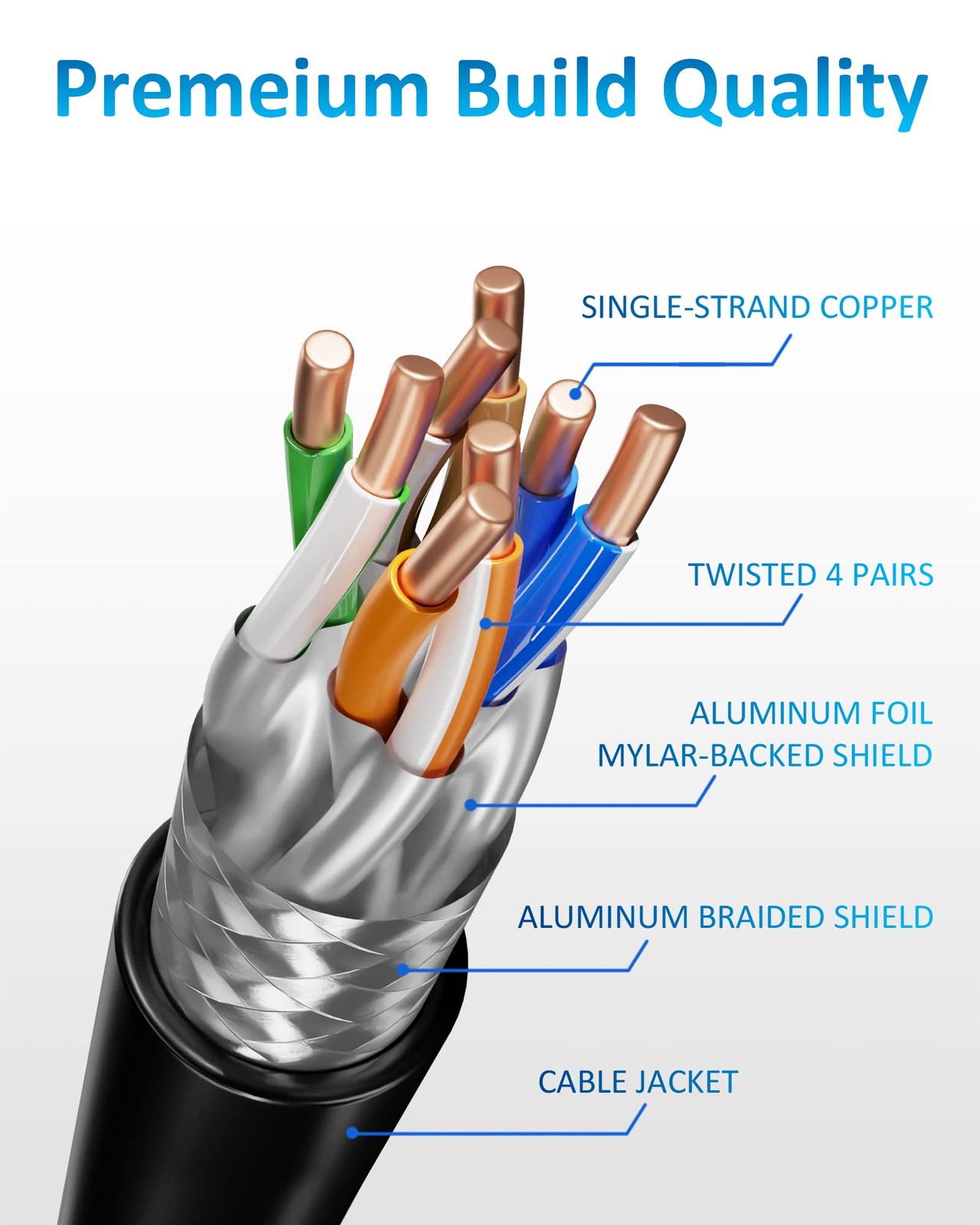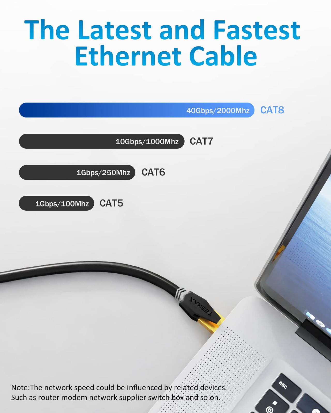 【S/FTP & Ultra Speed】Cat8 Ethernet cable, 4 shielded foiled twisted pair(S/FTP) and single strand OFC wires(26AWG), operates at a frequency of 2000 MHz. Boosts the speed of data transmission up to 40Gbps. Available for you to stream HD videos, music, surf the net, play games and complete office work at hyper speed 【Universal Compatibility】Constructed with a gold-plated RJ45 connector makes it perfect and more secure for networking switches, IP Cam, routers, Nintendo switch, ADSL, Adapters, Modem, PS3, PS4, PS5, Xbox, Patch Panel, Servers, Networking Printers, Netgear, TP-link, NAS, VOIP phones, laptop, coupler, hubs, Keystone jack, Smart TV, Imac and other devices with RJ45 connectors. Also compatible with Cat7/Cat6/Cat6e/Cat5/Cat5e 【Durable Quality & 26AWG Certified】Cat8 is a lot faster and stable in data transfer when compared with other 32AWG Ethernet cables. All Cat8 cables passed a professional Cable Analysis test. It is suitable for small or middle enterprise LANs. Also suitable for AI smart products that require a high speed & high-performance network 【Weatherproof & UV Resistant】Cat8 Lan cable is made with a pure copper core, aluminum foil shield, woven mesh shield, PVC outer cover and two gold-plate RJ45 connectors. With a high-quality structure, it is more durable & flexible for heavy duty work. Suitable for both outdoor and indoor use because of good water-resistance & anti-corrosion functionality. It can withstand direct sunlight as well as cold, humid & hot weather while maintaining performance and integrity 【Customer Service】offers 18 months warranty and 24hours welcoming customer service. Any questions please feel free to contact us