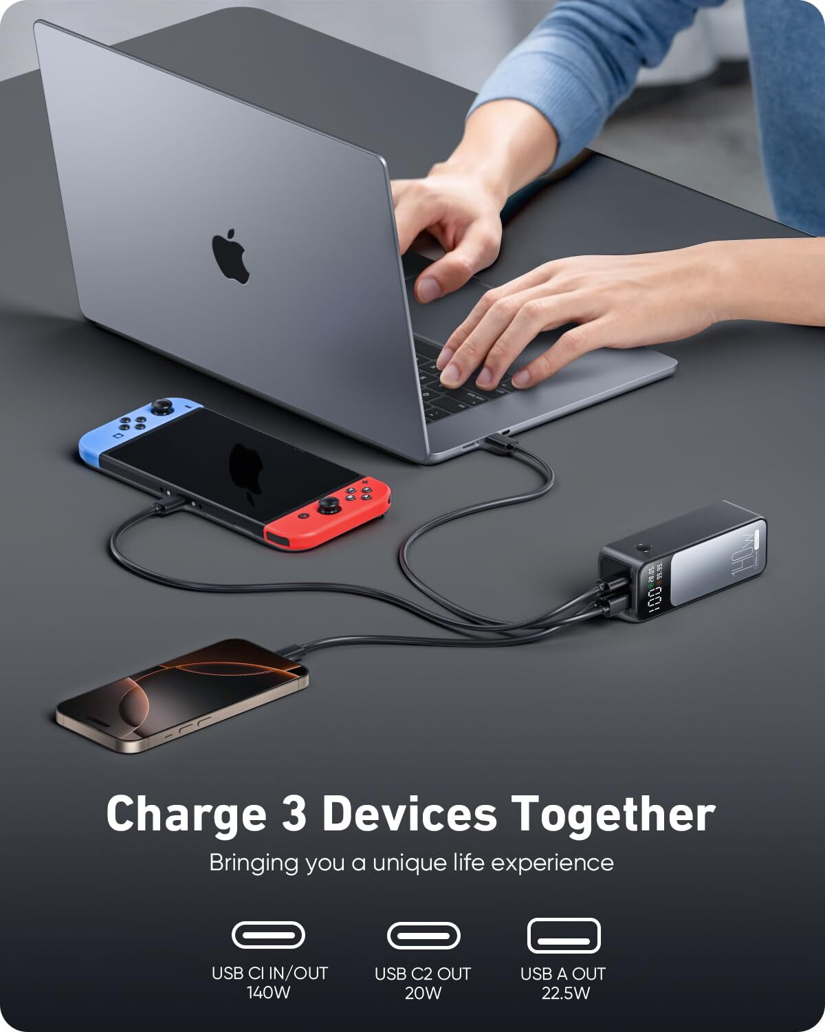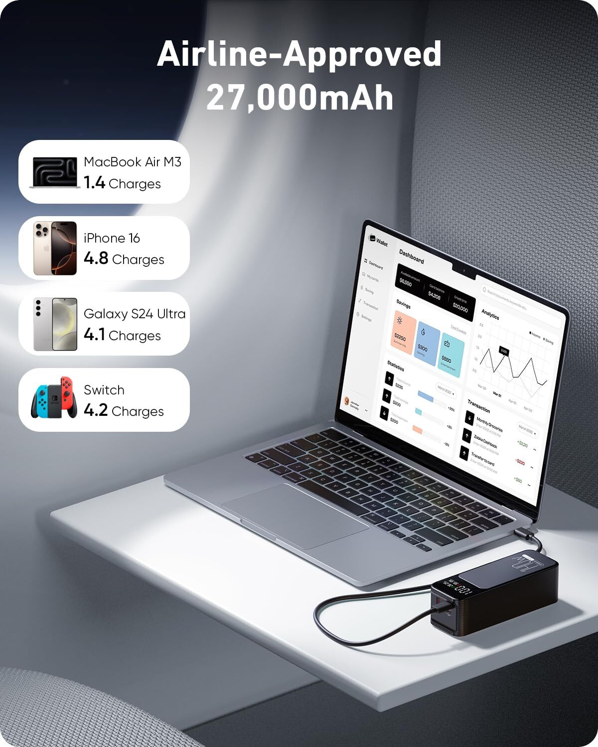 140W Two-Way Fast Recharge: Portable charger power bank with PD3.1 and QC4+ etc for fast charging to laptops and phones. In just 30 minutes, you'll have a MacBook Pro 16" at 59%, SteamDeck at 57%, iPhone 16 Pro Max at 70%. The laptop power bank refills its own battery quickly in 1 hour. It’s ready to go again in no time, keeping up with your fast-paced lifestyle. High-Capacity Power for All Devices: With a 27,000mAh capacity, this laptop power bank can recharge MacBook Air M3 up to 1.4 times or iphone 16 up to 4.8 times. Power through your day, ensuring your devices stay powered during long trips or heavy usage. Convenient & Airline Approved: Get through TSA and boardyour flight on time with this laptop battery power bank that meets boarding standards.This laptop portable charger is the size of a soda can.Making it a perfect choice for light travel or commuting. Smart LED Display & Super bright flashlight: The smart digital display on this Portable laptop charger provides real-time insights on output/input power and estimates the recharge time, keeping users informed and their devices ready.This laptop portable charger is also equipped with a super bright flashlight. With 4 modes, it can help you light up the darkness. Perfect companion for power outages, night walks, reading and emergencies. Wide Compatibility: Portable laptop charger supports power 1,000+ devices from big to small. Whether you have an Android, Apple, or another brand of device, this charger's got you covered. A universal solution for all your charging needs.