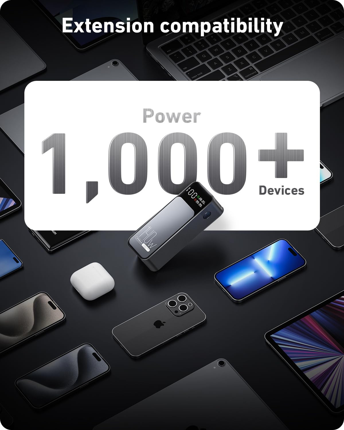140W Two-Way Fast Recharge: Portable charger power bank with PD3.1 and QC4+ etc for fast charging to laptops and phones. In just 30 minutes, you'll have a MacBook Pro 16" at 59%, SteamDeck at 57%, iPhone 16 Pro Max at 70%. The laptop power bank refills its own battery quickly in 1 hour. It’s ready to go again in no time, keeping up with your fast-paced lifestyle. High-Capacity Power for All Devices: With a 27,000mAh capacity, this laptop power bank can recharge MacBook Air M3 up to 1.4 times or iphone 16 up to 4.8 times. Power through your day, ensuring your devices stay powered during long trips or heavy usage. Convenient & Airline Approved: Get through TSA and boardyour flight on time with this laptop battery power bank that meets boarding standards. This laptop portable charger is the size of a soda can. Making it a perfect choice for light travel or commuting. (size: 6.41 x 2.04 x 2.28 inches, weight: 1.38 pounds). Smart LED Display & Super bright flashlight: The smart digital display on this portable laptop charger provides real-time insights on output/input power and estimates the recharge time, keeping users informed and their devices ready. This laptop portable charger is also equipped with a super bright flashlight. With 4 modes, it can help you light up the darkness. Perfect companion for power outages, night walks, reading and emergencies. Wide Compatibility: Portable laptop charger supports power 1,000+ devices from big to small. Whether you have an Android, Apple, or another brand of device, this charger's got you covered. A universal solution for all your charging needs.