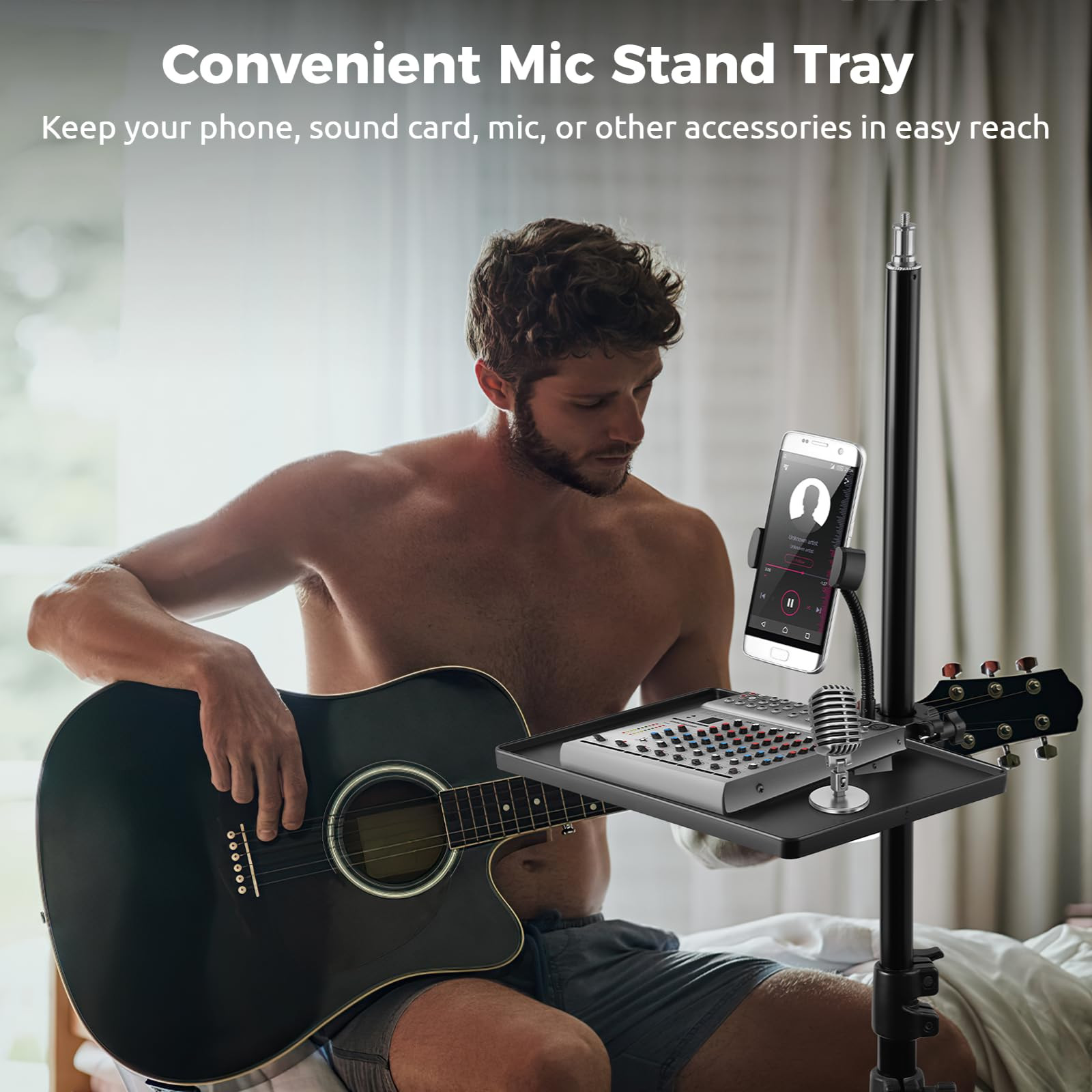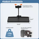 【2-In-1 Mic Stand Tray with Holder】 Upgrade your live streaming setup with our 2-in-1 mic stand holder, which helps hold your cell , sound card, and other live streaming accessories on your front, allowing for easy access to your essentials for seamless performances! 【Big Tray & Adjustable Rack】 With a generous size of 10.63 x 8.07’’(L x W), our mic rack tray provides ample space for a microphone, a mobile , a sound card, a beverage glass, and small percussion. Plus, the holder is adjustable in width and 360-degree rotatable, allowing for both vertical and horizontal display, and suitable for cell phones with a width between 2.5-3.3’’. 【Secure O-Ring Clamp】 The O-ring clamp features an anti-skid gasket that provides a more secure grip on the bracket rod, preventing any movement and keeping the holder tray firmly in place, more reliable than U clamps. It fits micro stands of 0.59 to 1'' in diameter. Please verify the compatibility with your specific device before making a purchase. 【Free Height Adjustment】 The clamp has a rotation knob that allows you to effortlessly adjust the clamping size, enabling you to move the tray up or down along your bracket. This versatile feature caters to your specific needs, whether you're sitting or standing, ensuring you can find the most comfortable posture to deliver your best performance. 【Durable ABS & Wide Application】 Constructed of thick and high-quality ABS plastic, the microphone stand holder is sturdy, resistant to impact, and not easy to crack or break. It is universal for mic stands, music sheet stands, selfie light stands, speaker stands, and tripods.