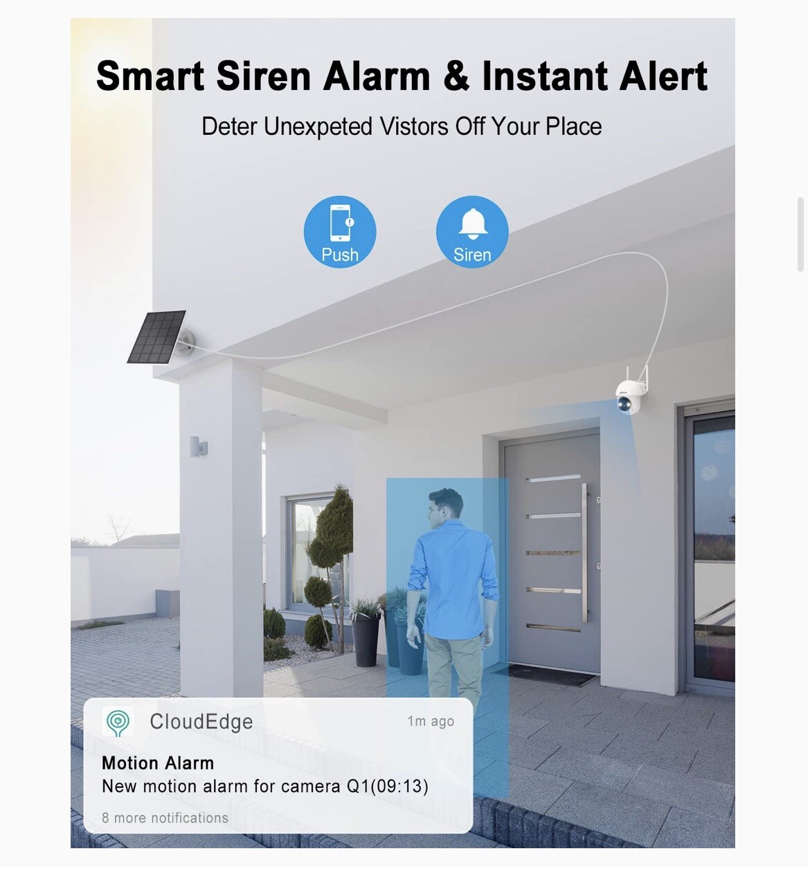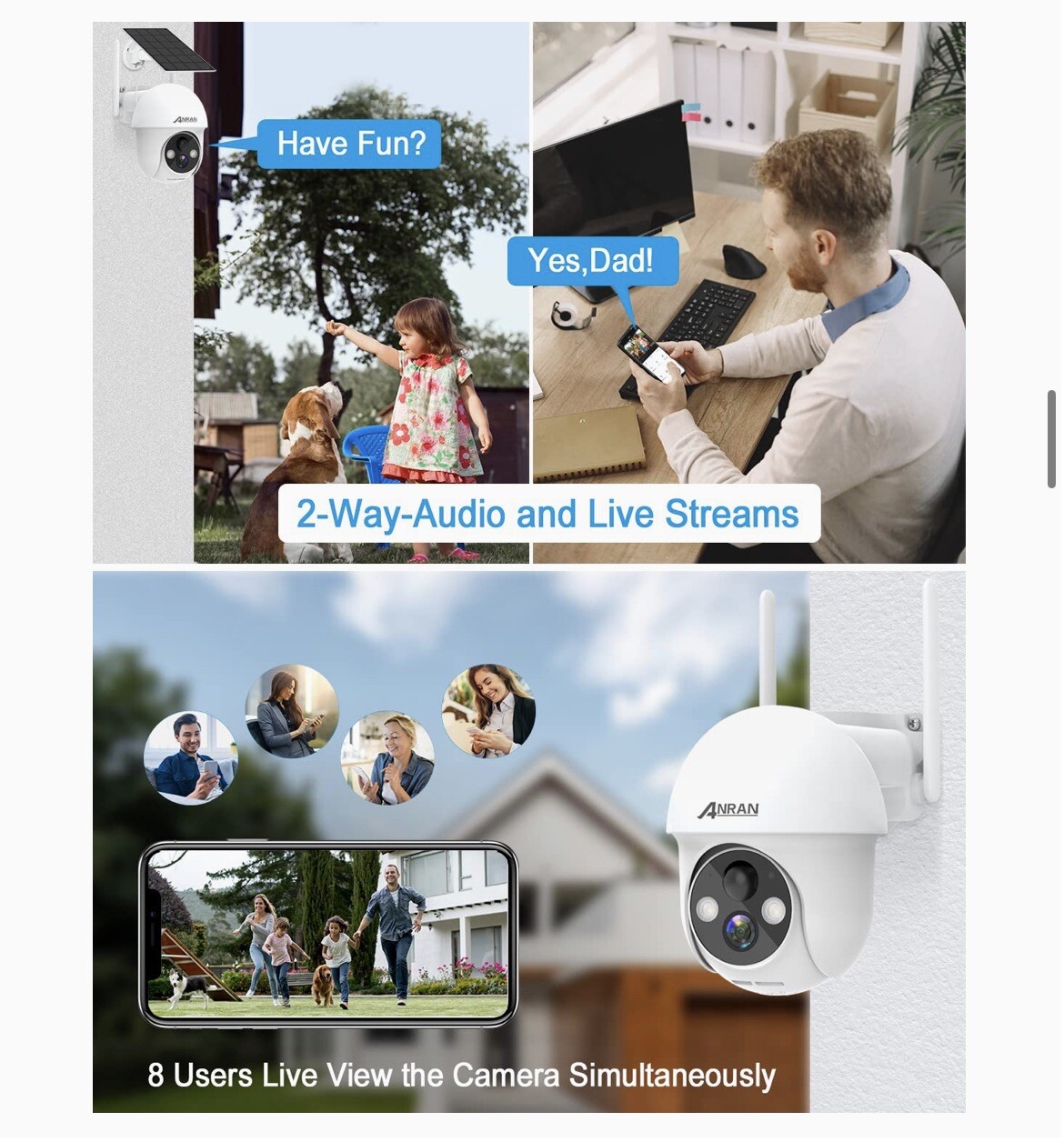 ANRAN Security Camera Wireless Outdoor, 2K Solar Outdoor Camera with 360ยฐ View, Smart Siren, Spotlights, Color Night Vision, PIR Human Detection, Pan Tilt Control, 2-Way Talk, IP65, Q1 [White] ๐๐ซ๐ข๐ฌ๐ฉ ๐๐ฆ๐๐ ๐ & ๐๐๐ยฐ ๐๐ข๐๐ฐ: Take a panoramic shooting and make sure no blind spots or zone,and get great video quality. Great IR night vision in darkness as well as Color night vision enabled by 2 powerful spotlights. ๐๐ฆ๐๐ซ๐ญ ๐๐ข๐ซ๐๐ง ๐๐ฅ๐๐ซ๐ฆ ๐๐ง๐ ๐๐ฉ๐จ๐ญ๐ฅ๐ข๐ ๐ก๐ญ๐ฌ: Unique Smart Siren Alarm feature work with Spotlights is really an awesome design when it detects unexpected visitors at night in darkness and derters them off your place right away. ๐๐จ ๐๐ข๐ซ๐ข๐ง๐ ๐๐จ ๐๐๐ฌ๐ฌ๐ฅ๐: No electrical wiring jobs. It comes with built-in rechargeable batteries of large capacity and gets non-stop power by the solar panel kit included . ๐๐ฆ๐๐ซ๐ญ ๐๐๐ ๐๐ฎ๐ฆ๐๐ง ๐๐๐ญ๐๐๐ญ๐ข๐จ๐ง: Be notified instantly when it detects unexpected visitors, and talk to them by 2.4G WiFi stronger connection than 5G WiFi (not support) outsides crossing walls. ๐๐-๐๐๐ฌ๐๐ ๐๐ฎ๐ฉ๐ฉ๐จ๐ซ๐ญ ๐๐ง๐ ๐๐ฅ๐จ๐ฎ๐: US-Based support and service via phone and email. US-Based cloud service (optional) with encrypted secure data and privacy protection.
