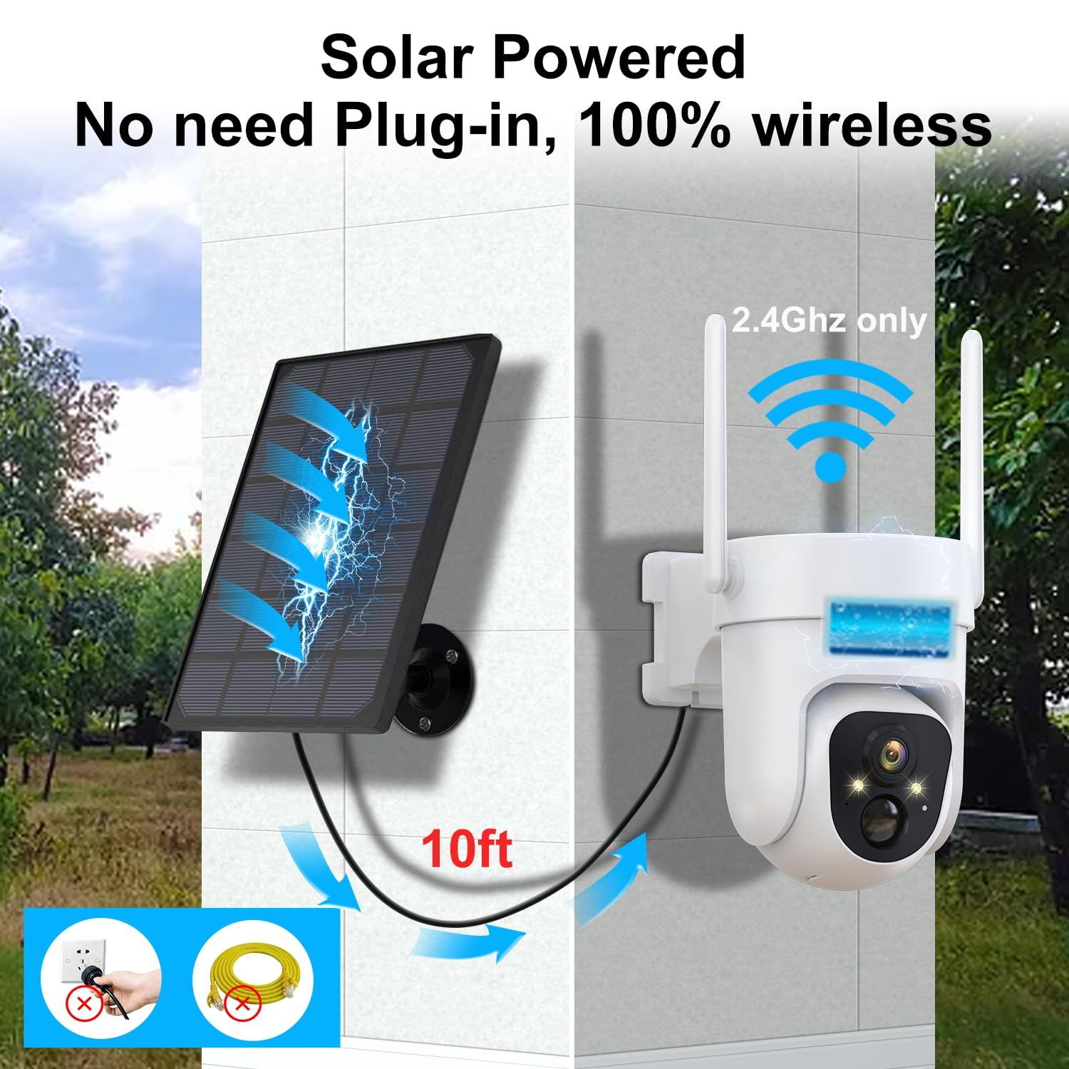 【Solar Powered & Wire-Free】This outdoor camera comes with solar panel,power battery and built in wifi.Solar panel supply non-stop power, wifi antena receive signal.100% wireless free,no wire hassle. No need power plug-in. Put on the wall, then you could start 365 days surveillance.No need to take off for power charger. 【All in one camera】This wireless camera outdoor camera,with free playback,video saved in cloud server(Max 0.5GB). Support max 128G (SD card not included).You could 2-way talk, playback,motioin detection,rotate angle,even when outside 【Instant Alerts &Siren & Flashlight】 Home security camera. When a stranger outside your home in the camera. You would receive message in seconds with a photo preview right in the notification without opening the the App, You could see who comes and goes. Siren and flash spotlight could be set to automatic or mannual turn on. The extra service are that this camera could analys motion behavior,distinguish people,pet,car,and also you could edit motion zone( extra subscription service) 【2K Full HD & 355° Coverage & Colorful Night Vision】355°horizontal rotation & 90°vertical rotation & 3X digital zoom.Rotate the camera to the angle you want, it could be done on your phone. No blind spots you could. With 90-degree wide-angle, the ptz camera outdoor guarantees a panoramic shot of every corner of your front door,back yard,shop, garage. 2K full HD, picture is clear and crystal. The white light is auto turn on when there is motion. 【2-way Audio & Multi-user view camera】This home security camera built in speaker and mic-phone, you could talk to delivery man when he aright your home, ask kids for lunch,volumn adjustable.Share security cameras outdoor wireless with your families, it support multi-user liveview camera at the same time.