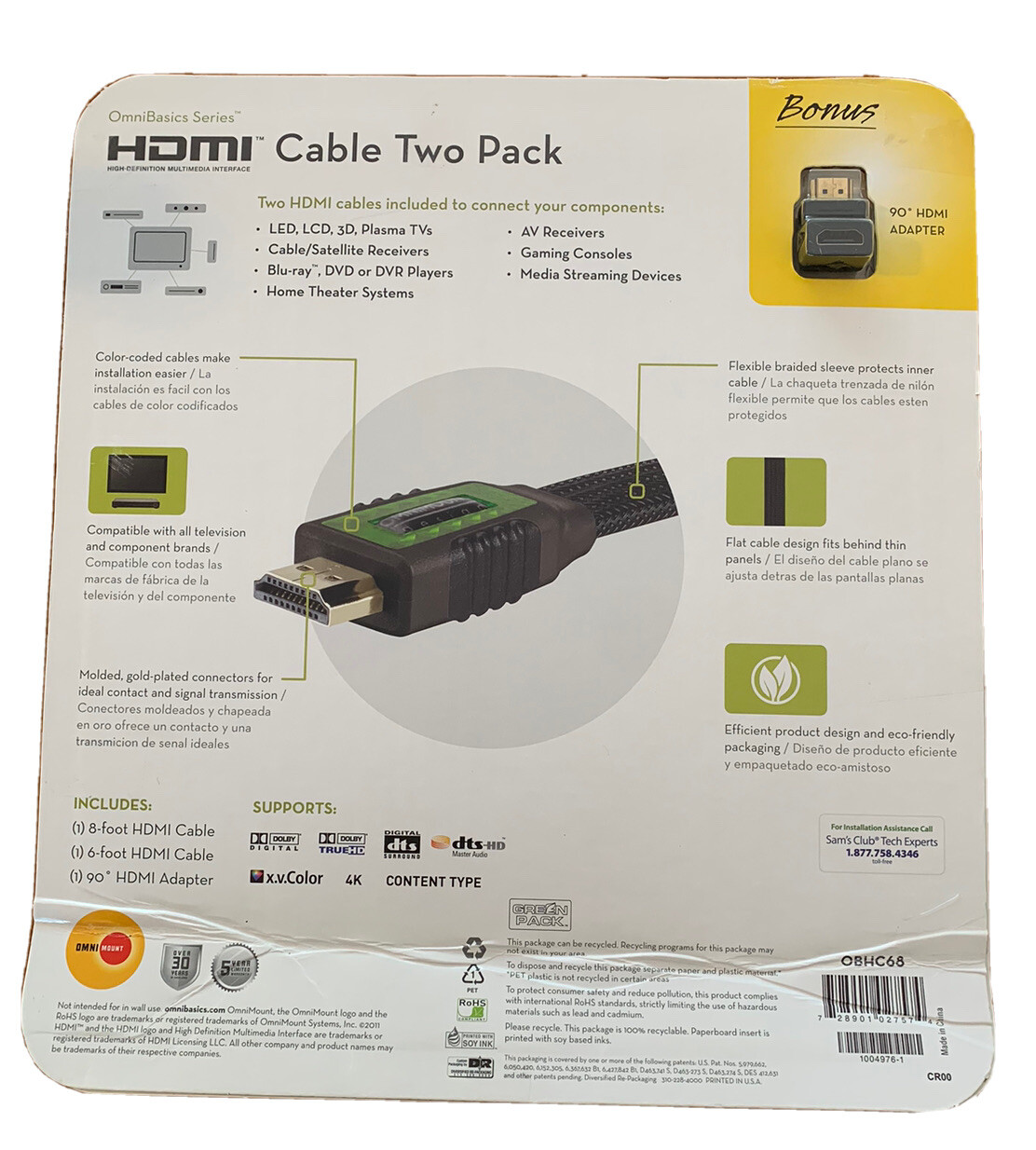 This HDMI cable 2 pack is perfect for ensuring high-quality picture and sound on your devices. With a length of 8ft and 6ft, these cables are compatible with universal brands and models including Sound Plus. The connectors are HDMI Standard Male and HDMI with a BONUS 90 degree HDMI Adapter, and the cable is colored in black. Plus the cables are Flat to fit well in narrow spaces. In addition, the cable features Gold Plated connectors for added durability and longer lifespan. The cable is made in China and is perfect for TV, video and home audio accessories. Purchase this cable pack today to enhance your audio and video needs.