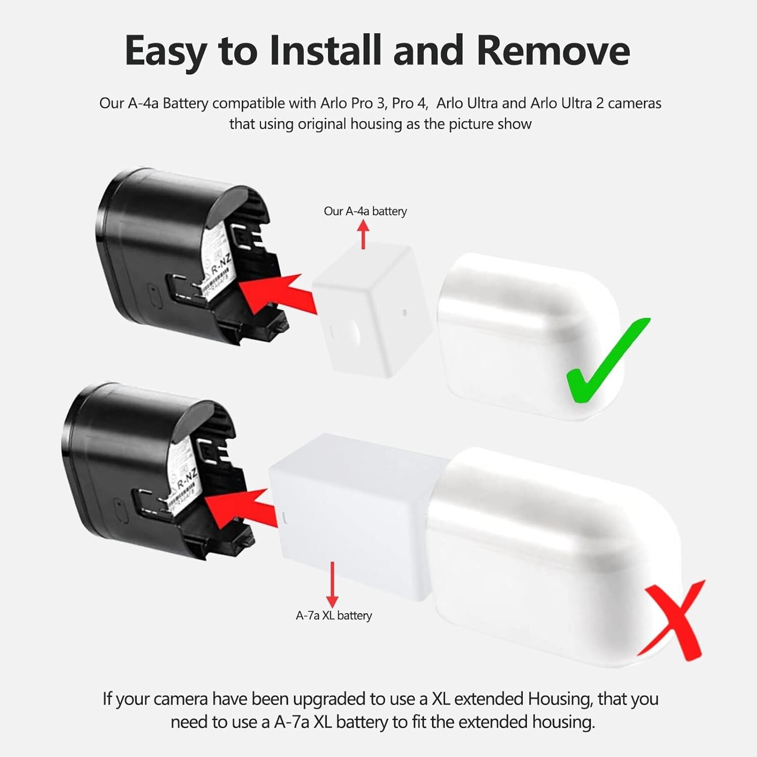 2-Pack Rechargeable Batteries and LCD Dual Charger Compatible with Arlo Ultra, Ultra 2, Arlo Pro 3, Pro 4, Pro 5S 2K Camera 4800mAh A-4a 【Battery Type】Material: rechargeble Li-ion; Capacity: ; High capacity and quality cells make for your Arlo Pro 3, Pro 4, Pro 5S 2K , Arlo Ultra and Ultra 2 work longer, provides uninterrupted performance for your home security and lets you reduce the down-time. 【Fully Compatible with Arlo】: Same chip battery designed for Arlo cameras, fully compatible with Arlo Pro 3, Pro 4, Pro 5S 2K, Arlo Ultra and Arlo Ultra 2 cameras(NOT FOR Arlo pro 3 Floodlight version). NOTE: If your camera is one of the above models but has been upgraded to use a XL battery for an Arlo Extended Housing, then this battery doesn't fit Extended Housing, you need to use A-7a battery(SEE THIS ASIN B0B152B72X) ,please must note the battery size as our pictures show. 【Easy Installation and recharge】: Remove the back cover of the camera and insert battery. Easy to recharge on the for Arlo Pro 3 Camera or Charging Station for Arlo Ultra and Ultra 2, Arlo Pro 3, Pro 4, Pro 5. Note: DO NOT fit for Arlo Pro, Arlo Pro 2, and Arlo Go camera. 【Safe To Use】: Integrated intelligent control chip help you use for Arlo-pro3 pro4 pro 5S 2K cameras safer. Built-in over-charge, over-discharge, over-voltage, over-current and over-heating protections. Multiple circuit protection ensures both safety and stability. Exclusive offering of high performance and long lasting usage. 【Buy with Confidence satisfaction】: Package includes: 2-pack Batteries and dual-channel charger for Arlo pro3, pro4 pro5 / Ultra Ultra2 camera, 1*type-c charging cable. 12 s satisfaction. 24 x 7 Support. If you have any questions, please contact me directly. We are committed to resolving any situation in which our product does not meet your expectations.