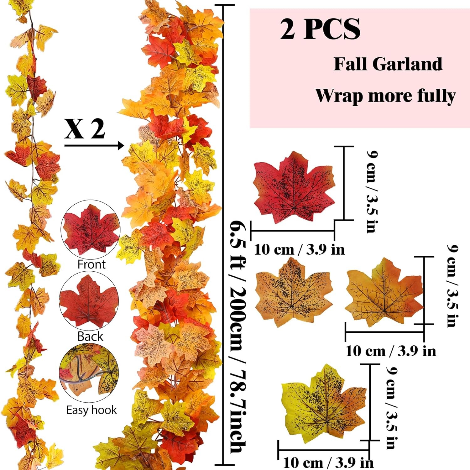 2pc Fall Garland 6.5ft/Piece 2 PC Red, 2 Pc Red LuxeFusion Product Description Features 【 Detailed Introduction 】Dear customer, our Fall Garland product pack contains 2 fall garland each with 26 fall leaves, each measuring 6.5 FT/78.7 INCH in length. If you want it to look plump, you will need to wrap it together. 【Fall Garland Decorations】Autumn maple leaf vines can be used to decorate our indoor and outdoor spaces, especially during Halloween, Thanksgiving, and autumn decorations, which are particularly beautiful. For example, on tables, background walls, fence decorations, swings, doors, gardens, fireplaces, etc. 【Artifcial Flower Garland】These fake flower vines have a beauty comparable to real flowers and are more to and reusable than real flowers. As they are made of silk long-distance transportation will cause some of the silk debris to fall off. 【 Quality Material 】 Maple leaves are made of high-quality plastic as the stem wrapping material. Maple leaves are made of silk fabric, which is characterized by durability, realistic maple leaf patterns, and bright colors. The stem of the wreath is supported by flexible metal wire. 【Note】1. Are made of silk and have no pungent odor. Due to storage in the warehouse, you should take out ventilation as soon as you receive the goods. 2. Silk woven fabric may cause some debris to appear during transportation, which can be shaken a few times when taken out. Product Details Item Weight: 0.18 Kilograms Is Artificial Garland: Yes Is Lighted: No Size: 2 PC Fall Garland Red Shape: Round Manufacturer: AWARDSEN Package Dimensions: 7.24 x 3.9 x 3.7 inches Item Weight: 6.4 ounces Country of Origin: China Item model number: PPP-240521FYTM-2 Brand: AWARDSEN Color: 2 Pc Fall Garland Red Material: Silk fabric, Plastic Item Length: 6.5 Feet Plant or Animal Product Type: Vine Free Shipping All orders ship free and fast to your doorstep. Easy Returns Satisfaction guaranteed. 30-day returns, no questions asked. 24/7 Support Contact us anytime; we’re here to help, day or night. Brought to you by LuxeFusion – Quality you can trust.