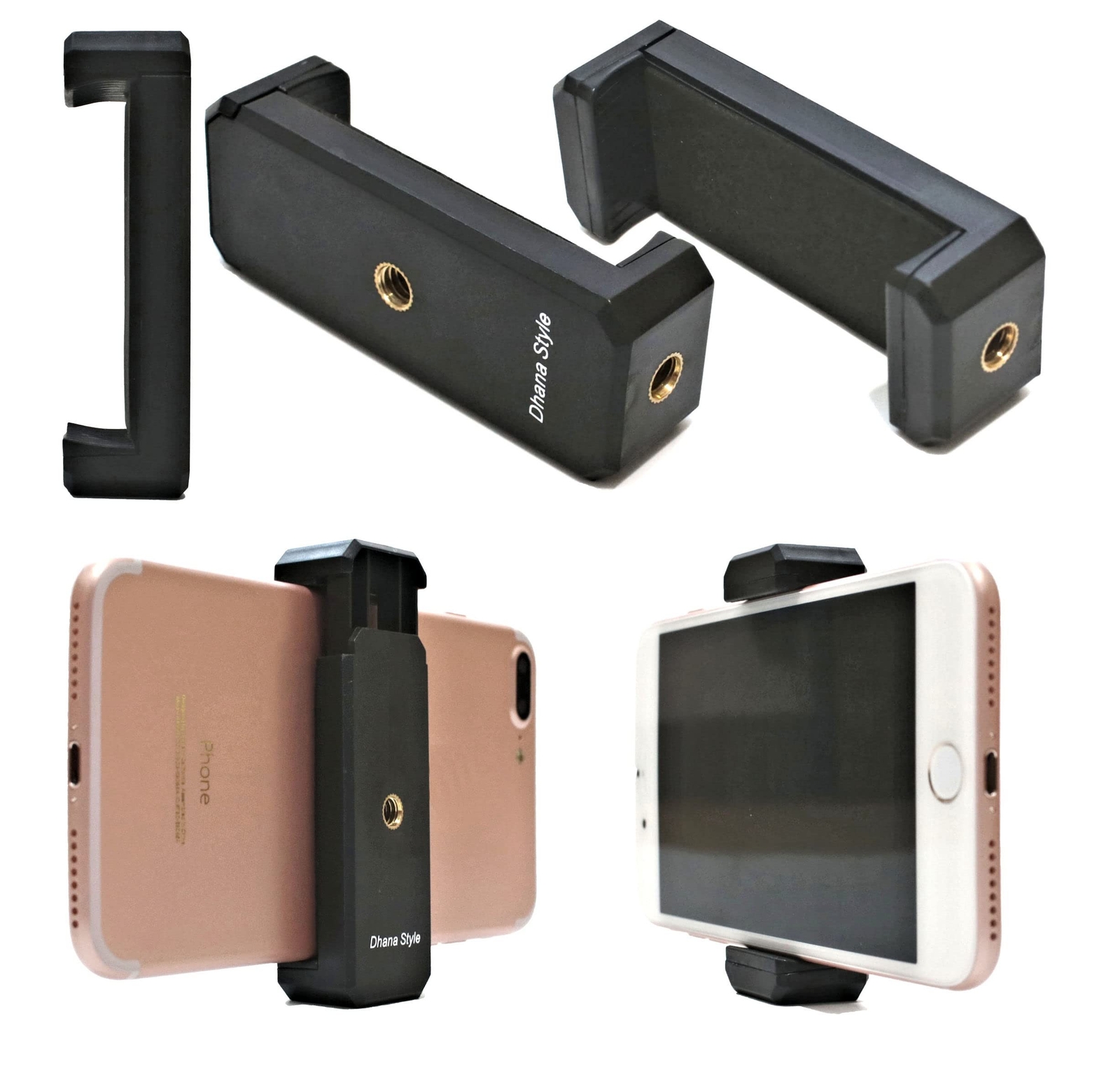 2Way Cell Phone Adapter 1/4" Standard Screw Tripod/Monopod Mount Holder Clamp Adjustable Smartphone Bracket Clip Cellphone Attachment Product Details Brand: Dhana Style Color: Black Compatible Devices: Smartphones Mounting Type: Tripod Package Dimensions: 3.1 x 2.1 x 1 inches Item Weight: 0.81 ounces Special features: Portable Adjustable, portable, lightweight Other display features: Wireless Color: Black Manufacturer: Dhana Style Country of Origin: China Date First Available: May 20, 2020 Fits any standard tripod with dual 14 inches-20 threading: Easy to install any smartphone on tripod without tools. The standard 1/4" thread screw make it a useful versatile cell phone tripod mount adapter. Quick operation to setup, perfect for taking Selfies and recording videos hands free, Portable with light weight, easier carry for a trip, travelling, and any outdoor activities. Silicon padded on top and bottom, providing stable grip. Compact & Portable; Helps you shoot steady video for Facebook Live, Periscope, and other microphone live streaming Vlogging platforms. Light weight design and easy portability mean that you can put it in your pocket or your briefcase and take it everywhere you go. And you will be ready for the perfect Lens picture at any time. Dual mounting locations meet your various needs. PACKAGE INCLUDED ; Smartphone tripod mount holder x 1 SPECIFICATION -Weight; 0.88oz (25g) -Material: ABS Plastic "Phone mount adjustable from 2.44 to 3.54 Inch