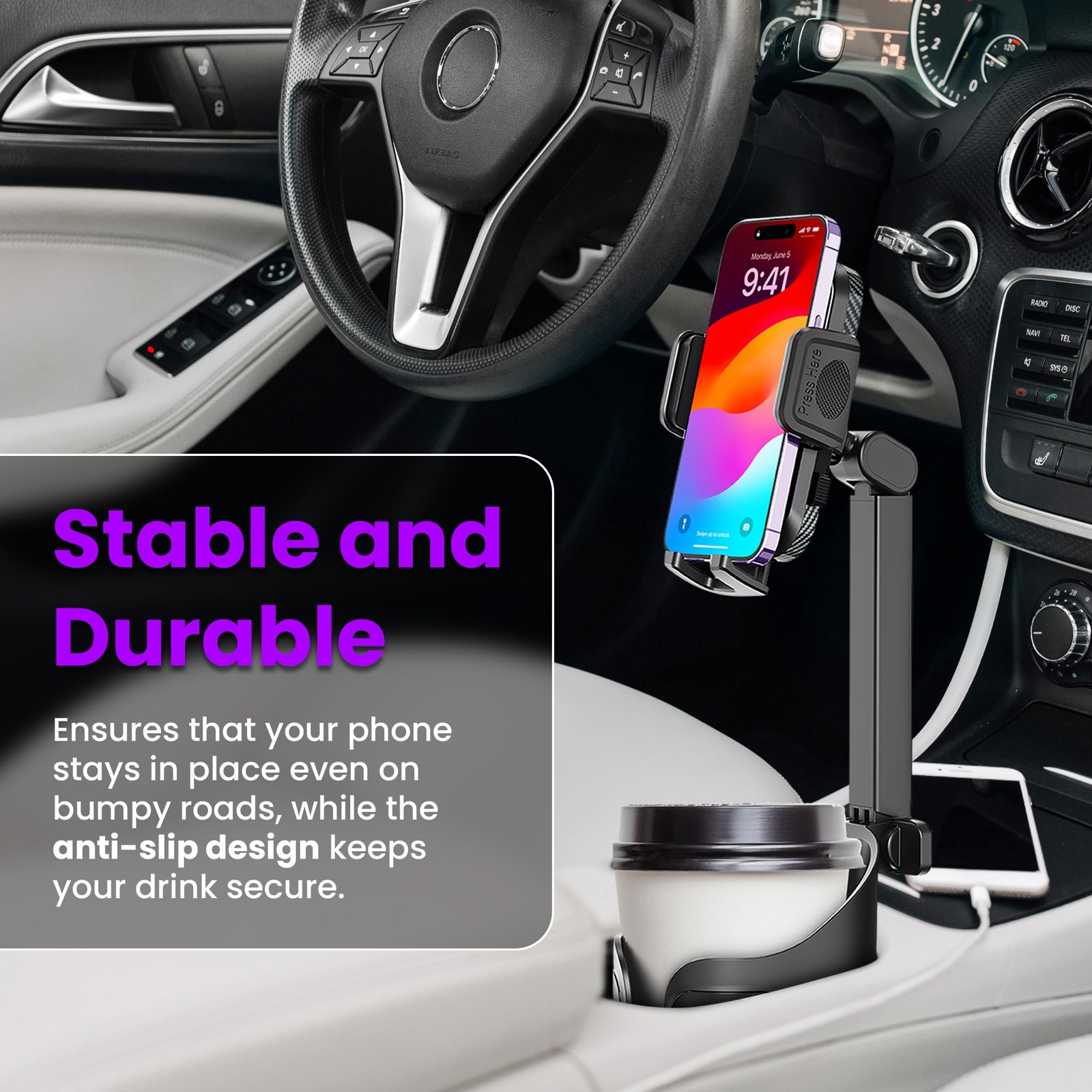 2-in-1 Cup Holder Phone Holder for Your Car Bottle Friendly Cup Cell Phone Holder Mount for Car Height Adjustable Sturdy Fit 4-7 inches Phones, Silicone Description and features 📱 HOLD PHONE AND CUP - This cup holder phone mount for car allows you to hold both your phone and a cup simultaneously, providing stable and clear navigation while driving. The hollow base lets you place drinks or coffee without holding them. ✨ NEAT, ELEGANT, EFFICIENT - With its C-shaped hollow base design, this phone holder fits firmly without occupying cup holder space. It fits all 2.5-4.0 inches round and rectangular cup holders, making your car's interior more organized and stylish. 🔧 DURABLE & EASY INSTALL - Made from heavy-duty PC and flexible ABS, this holder is built to last up to 10 years. It installs easily by squeezing the base into the cup holder and features non-slip silicone sides for a secure fit. 🔄 ADJUSTABLE ROD, BEST VIEW - Featuring two adjustable rods, this holder's height ranges from 2.5'' to 10''. It supports horizontal and vertical phone positioning, ensuring the perfect viewing angle without blocking your screen or gear lever. 📏 FITS MOST PHONES AND CUPS - Compatible with all 4-7 inch phones with thick cases (excluding Z Flip and Z Fold). The hollow base design preserves cup holder space, accommodating almost any cup, coffee cup, can, or drink bottle. Return Policy ⦿ All our products come with a 30-Day Return Policy. If you would like to return your item and you are within 30 days of the purchase, and it is still in its original condition, you can return the item by contacting us through eBay messaging. ⦿ If you are not 100% satisfied, please let us know the Detailed Problem,We will give you a 100% satisfactory solution ⦿ If you received an incorrect, damaged, defective, or item not as described, contact us for a partial/full refund or replacement on our cost. ⦿ Free Shipping and Free Return 30-Days Money Back Guarantee. ☎ For all returned products, buyers MUST contact us for the returning address. Shipping ⦿ We do not ship to a different address. we will ship to the address you provide on the ebay only. Please check your address before purchase. ⦿ It should take 2-4 business days for the product to reach your destination. ⦿ If the product doesn't reach your destination within the time limit, please give it an additional 1-2 business days in case of postal delays and/or possible technical issues. ⦿ We use a selection of shipping services such as UPS, FedEx, USPS etc. ⦿ We ship only to the 48 contiguous states of America. We do not ship to Hawaii, Alaska, US Protectorates, APO/FPO addresses. Local pickups are not offered. ☎ If it takes any longer than that, please do not hesitate to contact us to resolve the issues. Contact us ☎ Please contact us via eBay message. And your message will be replied within 1 business days. For any queries, please feel free to contact us, we will get back to you as quickly as possible. Customer 100% satisfaction is our first priority and goal. We are always working hard for maintain high standards of excellence and resolve your problem in best way. So your POSITIVE FEEDBACK is very important. If you have any problem of the item, please feel free to let us know before leaving your feedback. We will try our best to solve your problem. About us We are here to give you quality products, competitive pricing and amazing service in order to make sure you get the best deal online, Thank you for your business and the opportunity to serve you.