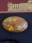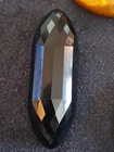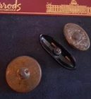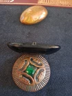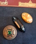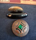From our family collection..grandmothers buttons goes back to the 30s 40s. This unique coppertone Metal Raised button with emerald green Stone. 1 and 1/4 inch. A Rare button! 2 inch jet black lucite, faceted concave unique button. And most rare is the early celluloid late 1800s also faceted, concave 1 &1/4"