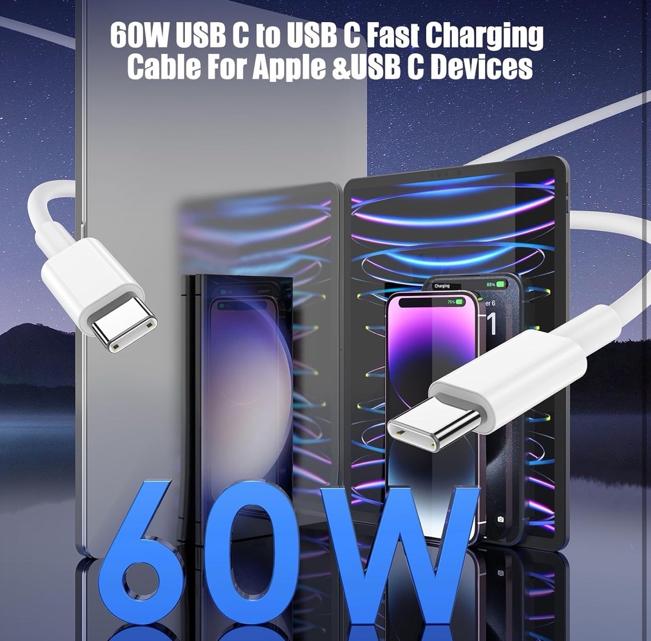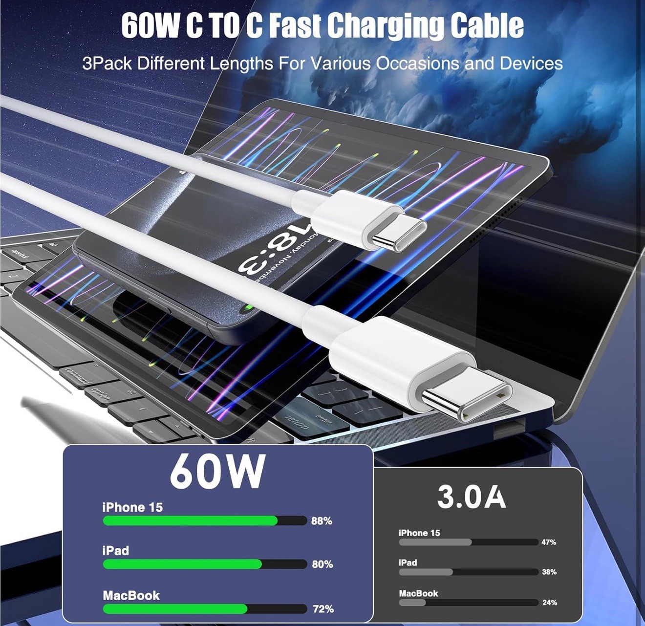 【Universal Compatibility】This C to C fast charging cable Compatible with 65W/61W/45W/35W/30W/25W/20W USB C charger.for iPhone 16 15 Pro Plus Pro Max,for MacBook Pro 13 inch, for Macbook Air 13 /m1 Inch, for MacBook 12 inch,for iPad Pro 12.9/11 inch, for iPad Air 4/5, for iPad Mini 6, for Google Pixel 6/6 Pro/5/5a, for Galaxy S24/S23/S22/S21/S20/S20+/S20 Ultra, for Galaxy A53/A73/A71,for Galaxy Note 10/10+/20 Ultra, for Switch, for PS5 and other USB-C port devices. 【USB C to USB C Cable】This USB-C to USB-C cable,which has the same USB C plug on both ends, with your USB C wall charger,and usbc to usbc fast charging your device.usb c cable usb c charger usb c to usb c usbc to usbc type c charger fast charging c chargers fast charging type c charger iphone 15 charger cord usb c usb c to usb c cable c to c cable fast charging iphone charger usb c c charger usbc charger usb-c cable type c cable usb-c charger usb c charger cable usbc usbc to usbc cable. 【Fast Charging-60W】This c to c type fast charging cable supports PD 3.0 & QC 3.0 fast charging, Max output up to 20V/3A, suit with USB-C adapters. USB 2.0 supports data transfer speed up to 480Mbps.c type charger fast charge type c to type c usb c charging cable iphone 15 charging cable usb c cable fast charging usb c cord apple usb c cable usb c cable 6ft usb type c cable iphone 15 pro charger cord ipad charging cord c charger cord usb c extension cable c type charger cord c to c cable.