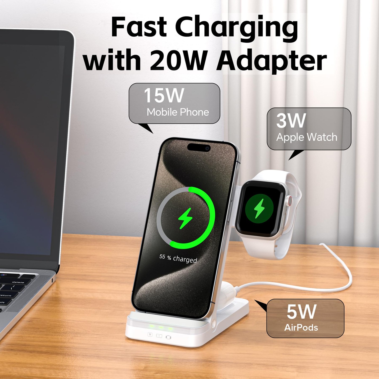 Wireless Charger, 3 in 1 Foldable Fast Charger for iPhone 16 15 14 13 12 11 Pro Max XR XS 8 Plus,for Multiple Devices,for Apple Watch 10 9 8 7 6 5 4 3 2 SE Ultra,for AirPods Pro 4 3 2, 3 in one Fold Up Charger Station: A charging station for apple devices charging your Airpods, iPhone, and Apple Watch simultaneously. With a built-in wide-range induction coil and wireless charger technology, it brings you an easy and convenient charging experience without the hassle of cluttered wires. It can also charge other phones with wireless charging capabilities. 20W High Power Fast Charging : Quickly fully charger your smart device in just 3 hours,with a high-power 20W adapter and 3.3-foot type-c charging cable ( Phone supports up to 15W fast wireless charging). When the phone is fully charged, it will automatically switch to trickle protection mode to prevent overcharging. Portable & Foldable Stand Design: The iPhone charging station is foldable, lightweight, and portable, suitable for carrying in bags or suitcases. This wireless charging stand is not only great for home and office use but also for travel and trips. Additionally, it serves as an adjustable-angle phone stand. Highly Compatible : Perfect 3 in 1 charging dock for Apple , Compatible with iPhone 15/15 Plus/15Pro/15 Pro max/14/14 Plus/14Pro/14 Pro max/13/13Pro/13Pro Max/13 mini/12/12Pro/12Pro Max/12 mini/11/11Pro/11Pro Max/XS/XR/XS MAX/X/8/ 8Plus & Apple iWatch 9/8/7/6/5/4/3/2/1/SE/Ultra 1/2 & AirPods 1/2/3/Pro.Note: Please do not wear a case thicker than 5mm(0.2")& Please update the system of the device promptly. What You’ll Get: The package includes a wireless charger, Free 20W adapter, one charging cable, user manual. If you have any problems during use, please feel free to contact us.