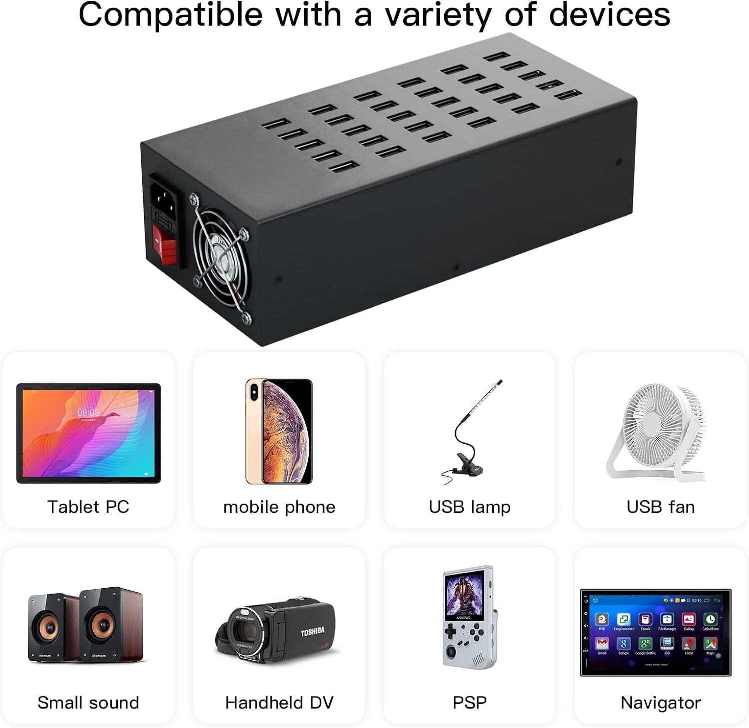 Charging Station for Multiple Devices 30 Port 300W USB Charging Station 30 in 1 Design - The input voltage is 110V. We use a ball fan as the radiator to improve the heat dissipation effect, and it is quiet and not hot. Thick copper wire, high current, anti-interference metal shell, durable and sturdy. 30 Fast 2A Charging Ports - Each interface of the charging station has an independent chip, charges up to 30 devices at once, Provides up to 5V2A of power per port. And to increase our charging speed. More Compatibility - 30 Cables Compatible with iPhone 11,11 Pro, XS, XS Max, XR, X, SE, 8, 8 Plus, 7, 7 Plus, 6, 6 Plus, 6s, 6s Plus, 5, 5s, 5c, iPad, iPad Pro, iPad Air, iPad Mini, iPod and other electronics. Home and Business Favorite - Use at shopping malls, coffee shops, canteens, multimedia classrooms, offices and other places. At home kitchen counters, desks, tables, or nightstands; restaurants, hotels, courier companies, concierge desks, libraries, and more. Multiple Protection Measures - USB charging station total 200W, short circuit protection, input overcurrent protection, output overcurrent protection, anti-leakage protection, only output power switching, single device failure protection, output overvoltage protection, output undervoltage protection, high temperature, temperature drop protection, electromagnetic field protection. ------------------------------------------------------------------------------------------ Shipping Policy: Domestic lower 48 states shipping is free and expedited. Shipping is also free to the rest US states and US Protectorates including Puerto Rico, Alaska, Hawaii, APO/FPO, but delivery times are longer than usual. If you need your order by a specific date please contact us before you make the purchase for a delivery estimate. ------------------------------------------------------------------------------------------ Return Policy: Your satisfaction is guaranteed! If for any reason you are unhappy with your item, just return it within 30 days for a full refund. Please contact us prior to initiating a return so that we can issue you a refund authorization.