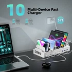 320W Charging Station for Multiple Devices, 10-Port USB C Fast Charger Stations for MacBook, i, Android Cell , iPad, Tablet, Family Multi-Device Organizer Charging Dock, White 10-Port Charging Station Organizer: Unlike charging stations with only USB-A ports, our multi-device charging station features 5 USB-C ports, delivering a total output of up to 320W. It includes 8 short mixed charging cables and can conveniently store and charge up to 10 devices simultaneously. This charging station helps eliminate messy cables and the need for multiple wall chargers, keeping your desk tidy and organized. Dual 65W Fast GaN Charging Dock: This multi device charging station equips PD ports for apple devices, to power your smart gadgets with high speed. You can charge your laptops like Macbook series with the top two 20V/ fast charging power. Additionally, three 30W ports and five 20W ports make it perfect for fast charging is, Galaxy S23/Ultra, heads, Kindles, iWatches, Switches, and more, meeting all your daily charging needs. Sturdy One-Piece Slots: Unlike other charging stations that use fragile, removable dividers, our multi-port charging station features a durability design made from high-quality, flame-retardant ABS material, ensuring a longer lifespan. We’ve specially designed two extra-wider and taller slots in the middle, each measuring " wide and " high. These slots are perfect for securely holding a laptop or a child's iPad with a protective case intact. Widely Used and Loved by Users: The USB C charging station features 4 non-slip rubber pads on the bottom, protecting your desktop from scratches and keeping the station securely in place. Whether you're at school, in the office, staying at a hotel, at home, in the bedroom, on a desk, or on a nightstand, it effortlessly organizes all your electronic devices. Trusted and loved by over 5000 users, the charging station is not only a practical solution but also a perfect present for family, friends, and colleagues. What You Get: 1 Charging Station, 1 Power Cord, and an 8-Pack of Short Mixed Charging Cables: 2 for i & iPad, 2 Type C, 2 USB C, and 2 Micro USB. Our USB C GaN charger station offers advanced protection features, including Flame Retardant, Over-Current, Over-Voltage, Overcharge, Overload, Overheat, and Short Circuit Protection, ensuring 100% safety for you and your devices. Plus, enjoy peace of mind with our friendly customer service.