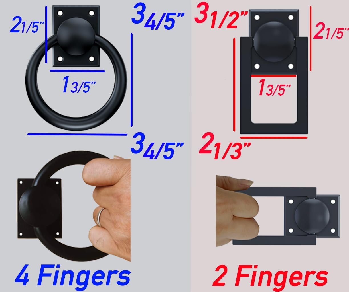 Business is our speciality NEW 3-3/4" Rotatable Matte Black Sliding Barn Door Handles Garden Fence Gate Pulls, Zinc Vintage Ring Bi-Fold Closet Door Handles, Trapdoor Attic Pull down Hardware Kit FEATURES EXCLUSIVE FOLDABLE DESIGN allows the door loop handle to flip 180 degrees from bottom to top, and the pull hinger to rotate 360 degrees. For more details, please check the second picture. ELEGANT and decorative gate door handles provide convenience, decoration, durability, and customization. They are essential for gates in various settings, including interior double-side barn doors, exterior door, hallway entry doors, outdoor front doors, carriage garage carport doors, garden decor barnyard picket fence doors, and bi-fold bypass doors. SIMPLY attach the flush handles to the wooden surface using the included 4 stainless steel bolts, and easily open or close sliding doors. VERSATILE: they function not only as door pull handles but also as steamer trunk / chest handles, shed and horse stable rope cross tie downs, dummy door knockers for front doors, and ladder attic door pull down handles, ceiling or floor basement access hatch handles, pool electrical equipment box cover handles DURABLE: These door hardware items are made from 100% heavy-duty Zinc (not cheap cast iron) with an anti-corrosion coating for weather resistance. UNIVERSALLY fit all types of wooden doors, whether solid or hollow core. The matte black color, slightly lighter than flat black, adds elegance to the overall design. UNIQUE horseshoe decorative barn door hardware adds style and sophistication, reflecting the room's personality. GIFT for her or him as the horseshoe is universally known as a symbol of protection and good luck Product Description HORSESHOE SHAPE Hanging a horseshoe hardware at your barn door or gate door is believed to attract positive energies and bring good luck and happiness to your home Flexibility in Door Customization Sliding Barn Door Handle Door handles are essential for opening and closing these doors, as well as for privacy and security. Carriage Garage Door Handle Round door handles offer a combination of functionality, durability, and aesthetic appeal, making them a popular choice for garage doors. Gate Fence Door Handle Even if not used for their original purpose, they can serve as decorative elements on doors, adding visual interest and enhancing curb appeal. Front Door Knocker They may be used as symbols of hospitality, respect, or good fortune. High Standard To Meet Rustproof Solid Zinc Material Our gate door handles are crafted entirely from zinc, ensuring they remain stainless and durable. Unlike cheaper cast iron handles, these will withstand the test of time. Powder Coating These zinc door handles are specially treated using an advanced technique called powder coating. This makes them durable and suitable for outdoor use, whether it’s on gates, fences, garages, or front doors. trust4care Compact Gate Handle Features Circular Design Circular handles are often easier to grasp and operate, especially for individuals with limited hand mobility or strength. Left/Right Sliding The 360-degree swivel function enables you to slide the barn door smoothly in either the left or right direction. Thin Height(1.2 inches) The slim handle's lower profile saves space. It sticks out less from the door, reducing the chance of snagging clothes or blocking traffic flow. 180-degree Rotation These handles can be attached to fence or heavy chests. Their 180-degree rotation function allows you to use as either door pulls or chest handles. Ring Handle vs Rectangle Handle Ring Shape Horseshoe Shape Rectangle Shape Rectangle Loop Rectangle Shape Rectangle Loop Large Size 4 fingers inside the ring Small Size 2 fingers inside the loop Small Size 2 fingers inside the loop Number of Items 1 Theme entry door, sliding barndoor, French Door, entrance door, Swinging Cafe Door, bifold Closet door, Ladder Attic Pull Down Handles, gate, shed horse stable, Laundry Batteries Included? No Unit Count 1.0 Count Room Type Kitchen, Bedroom, Living Room, Dining Room Finish Powder Coated Gem Type horseshoe, round, drop rings, circle Exterior Finish black Material Cast zinc, Zinc casting Item Depth 3.75 inches Metal Type Cast zinc, Stainless zinc, solid zinc Specific Uses For Product sliding barn door handle, door knocker, garage door handles, horse stable, gate handles Item Package Quantity 2 Indoor/Outdoor Usage Outdoor, Indoor Batteries Required? No Item Weight 1.59 pounds Size 3-3/4" Lock Type bolts mount, screws mounts Special Features Durable, Easy to Install, Versatile Special Feature Durable, Easy to Install, Versatile Color Flat Black Shape Pentagonal Finish Type Powder Coated Hand Orientation Towing Hitch Handle Material Stainless Steel, Zinc Style horseshoe Handle Type Pull Handle, gate pull open Included Components install template Product Dimensions 3.75"L x 3.75"W Grit Description Fine Number Of Pieces 2, 4 3.75 "w x 3.75 "w. Weight: 1.59 lb Ask us anyhting Free shipping PAYMENT We accept all payments via Ebay using Credit Cards , PAYPAL , Apple Pay and many others SHIPPING We are always working hard to ensure your package arrives as soon as possible. Please understand that some factors like weather, high postal traffic, and the performance of shipping companies are outside of our control. DELIVERY & RETURN POLICY We offer a 30-Day Return Policy on items in which you are not completely satisfied with. You have the option of a full-refund or an exchange of the item. No returns are available on items shipped outside of the USA.