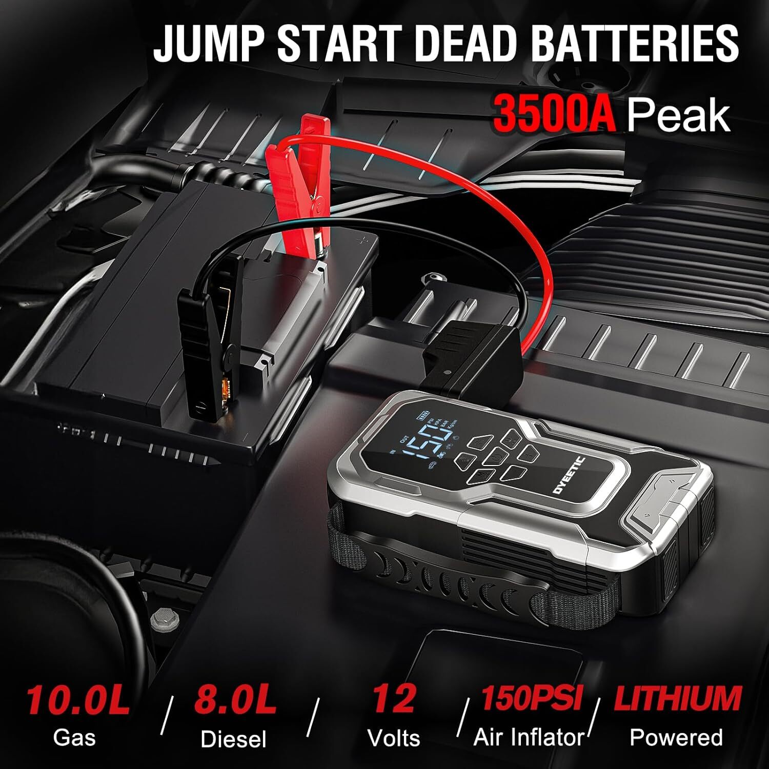 Car Jump Starter with Air Compressor, 3500A 12V Lithium Battery Silver Product Details Brand: Dyeetic Product Dimensions: 8.5"D x 4.1"W x 5.9"H Item Weight: 2.8 Pounds Amperage: 3500 Amps Peak Output Current: 3500 Amps Manufacturer: Shenzhen Kalaifu Technology CO., Ltd Model: D18 Item Weight: 2.8 pounds Item model number: D18 Batteries: 1 Lithium Ion batteries required. (included) Manufacturer Part Number: D18 Brand: Dyeetic Product Dimensions: 8.5"D x 4.1"W x 5.9"H Item Weight: 2.8 Pounds Amperage: 3500 Amps Peak Output Current: 3500 Amps Battery Cell CompositionVoltage: Lithium Ion12 Volts Vehicle Service TypeBattery Capacity: Passenger Car, Bus, ATV, Motorcycle, Van, RV, UTV, Truck, TractorPassenger Car, Bus, ATV, Motorcycle, Van, RV, UTV, Truck, TractorPassenger Car, Bus, ATV, Motorcycle, Van, RV, UTV, Truck, Tractor See more 21800 Milliamp Hours 【Start Most 12V Cars Dead Batteries】This Dyeetic jump starter delivers a peak of 3500A, enabling it to start dead batteries in seconds. Its upgraded 4-cell lithium battery is compatible with 12V vehicles, including those with up to 10.0L gas and 8.0L diesel engines. It supports over 50 jump starts on a single charge, making it perfect for passenger cars, SUVs, lawnmowers, motorcycles, trucks, and boats. 【Powerful Cordless Air Compressor with 4 Extra Nozzles 】The 150psi digital air compressor can inflate a car tire to 20 PSI in just 2 minutes. You can preset the desired pressure (PSI, BAR, KPA), and it will automatically shut off once reached. The large LCD screen provides accurate tire pressure readings and offers multiple mode selections for cars, bicycles, motorcycles, and balls. 【10 Intelligent Safety Protection】DYEETIC has been proud of its outstanding safety standards for decades. This jumper box features a mistake-proof design, eliminating worries about incorrect connections or sparks. With 10 intelligent safety protections and real-time alerts, it ensures fast starts in extreme environments (-4°F to 140°F) and can remain on standby for up to 24 months. 【Large Capacity Power Bank with Fast Charge Port and 3 Modes LED Light】 More than just a jump starter, it also functions as a 21800mAh power bank with two output ports (1 fast charge port), capable of charging smartphones and tablets and more. The built-in flashlight has three modes (Flash, Strobe, and SOS), providing essential lighting during emergencies or outdoor adventures. 【Big LCD Display and Portable Carry Case】The large LED display shows real-time battery levels and alerts you to potential errors. The jump starter is lightweight and compact, making it easy to carry in a backpack for outdoor camping or travel. It comes with a portable carry case for added convenience, it is a practical consideration that can minimize the space it occupies in the trunk, glove box, or under the vehicle seat.