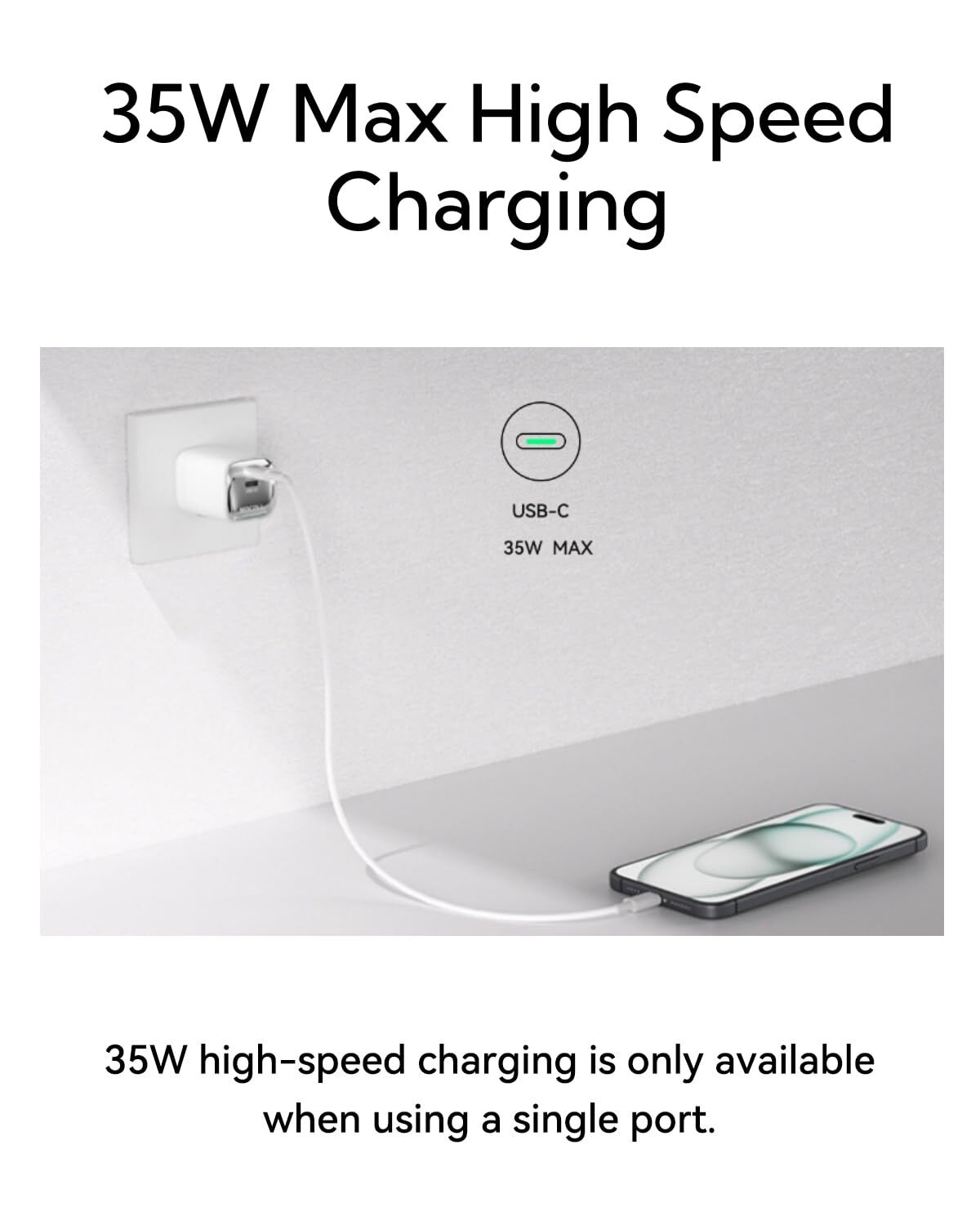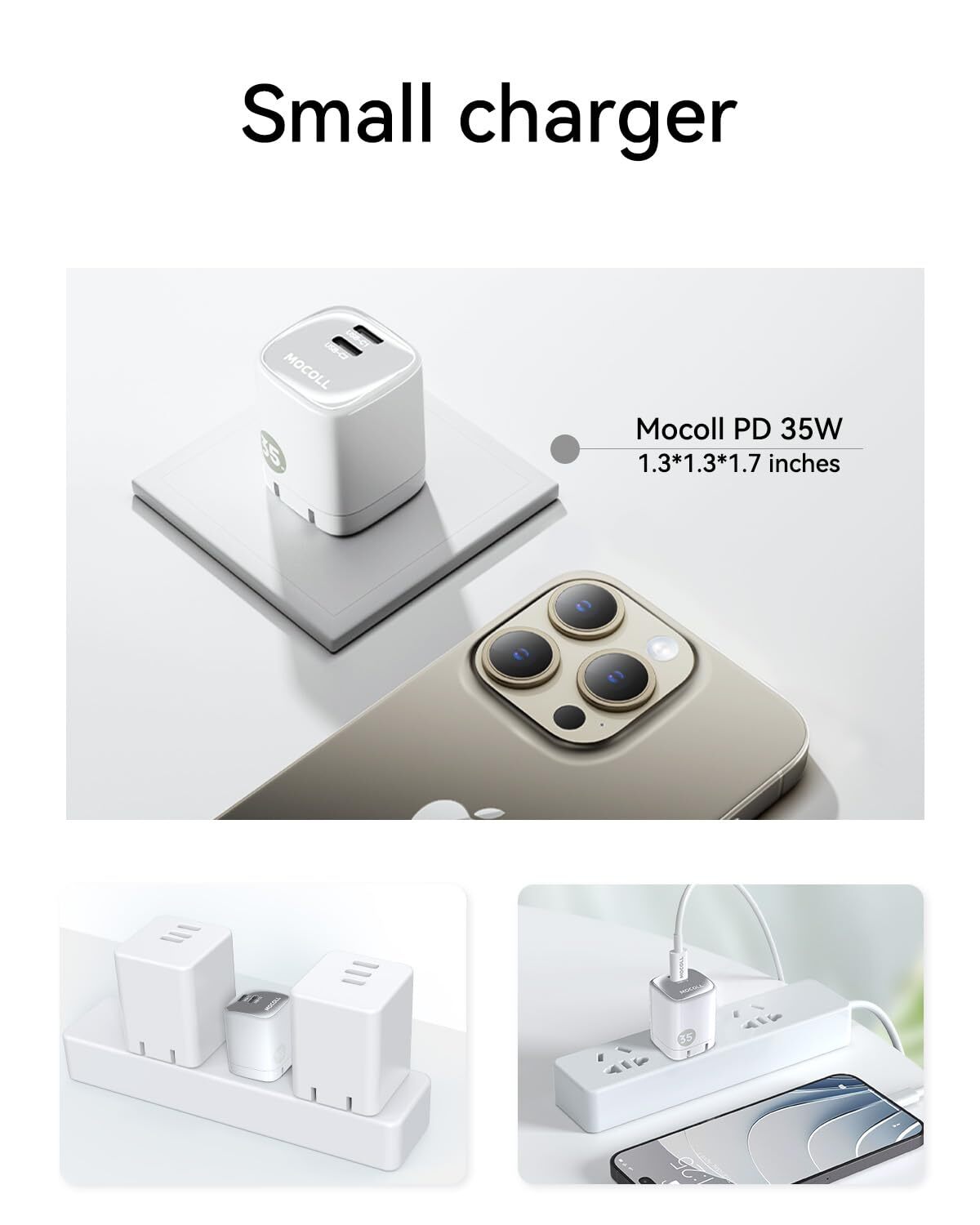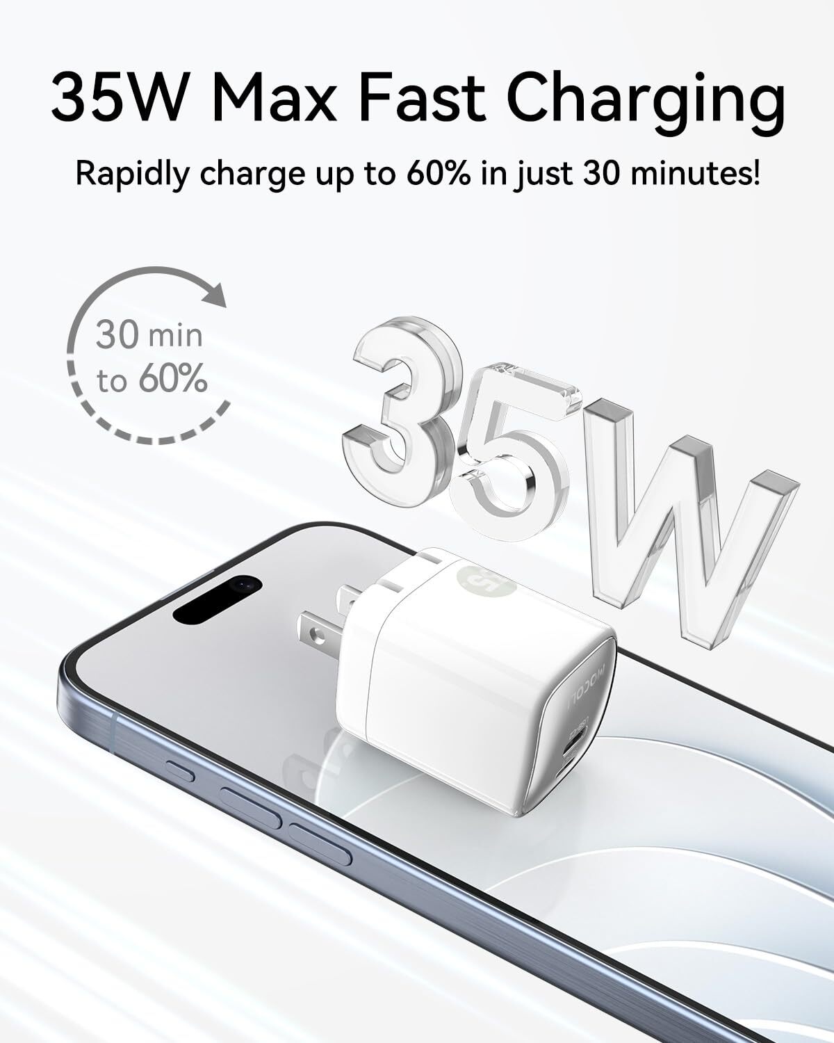 【Type C Charger Fast Charging】MOCOLL usb c charger block utilizes upgraded GaN technology for more efficient fast charging. It can charge i-Phone 15 from 0% to 60% in 30 minutes. 【Dual USB C Charger Block】Can charge two devices at once: Connect one device to get 35W of maximum charging power. When you connect two devices, the power will be efficiently distributed between the two ports (i.e. 15W+15W) to ensure you get the best charging results. 【Foldable Plug, Compact】usb c charger is designed with a foldable plug that takes up less space with no reduction in power. With a piano baking coating on the surface, type c charger is fashionable and more resistant to scratches. 【Superior Safety】15 pro max charger intelligently monitors temperatures more than 3 million times a day to prevent overcharging and overheating, extending the life of your phone's battery for healthier, stronger performance. 【Reliable Service】We have full confidence in the quality of our 35w usb c charger block, offering an 24-month warranty period. Additionally, our 7*24 customer service ensures timely resolution of any issues you may encounter during use, making your shopping experience more reassuring.