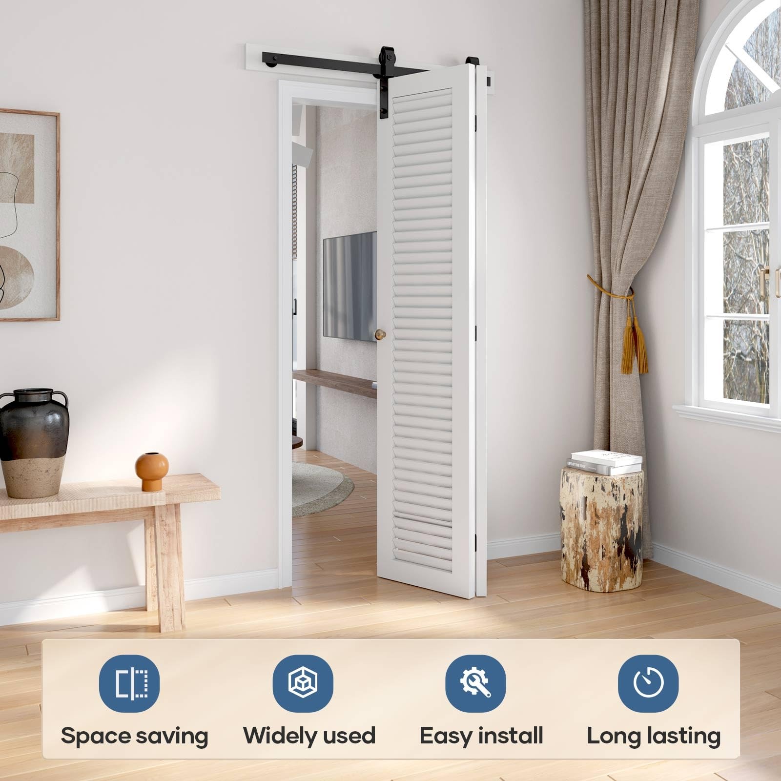 heavy-duty bifold door hardware system revolutionizes space efficiency with its innovative folding mechanism. Crafted from industrial-grade solid steel with a corrosion-resistant black powder coating, this hardware withstands daily use while maintaining its sleek appearance for years. The precision ball bearing rollers have been rigorously tested over 100,000 cycles, ensuring buttery-smooth, whisper-quiet operation that outperforms standard sliding door systems. Space-Saving: The door panel folding design takes up minimal space when opened,making it ideal for small homes,narrow hallways,or compact areas to maximize room efficiency.Can be partially or fully opened,allowing customizable ventilation and natural light control.More flexible than traditional sliding or swing doors,perfect for balconies,wardrobes,kitchen partitions,and more Smooth Gliding Like Butter: Crafted from steel with a fine black powder-coated finish,our bifold barn door hardware resists corrosion for lasting durability.Features high-precision bearing rollers tested over 100,000 cycles for buttery-smooth,silent operation-rigorously inspected for reliability Reminds: Fits up to double 16" wide bifold doors (1-3/8"~1-3/4" thickness; 180lb weight capacity). Track length = door opening + 4" (100mm). Requires 5-3/8" ceiling clearance Complete Hardware Kit: Includes 1x36" Rail,2x Rollers,2x Roller Rotating Base,1x Roller Fixator,3x Rail Support,3x Hinge,1x Floor Guide,1x Sealing Strip. DOOR NOT INCLUDED! Backed by 's 24/7 assistance,let us know for missing/defective parts,we will prompt solutions Hassle-Free Installation: Includes a step-by-step installation manual with detailed diagrams and text instructions.Get soft copy and professional installation guide from our online service