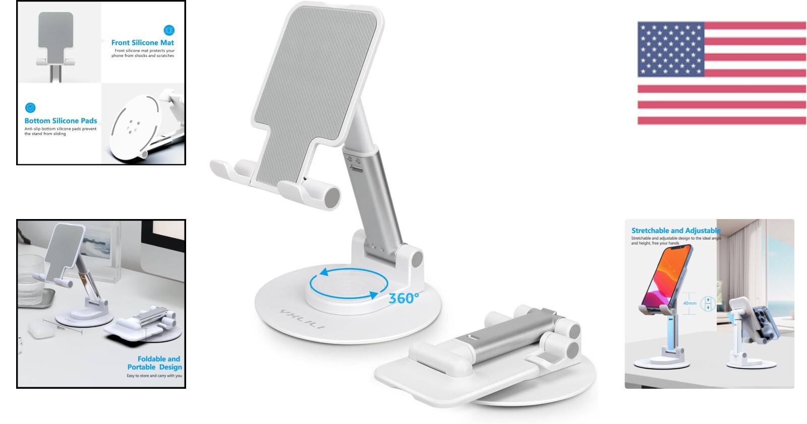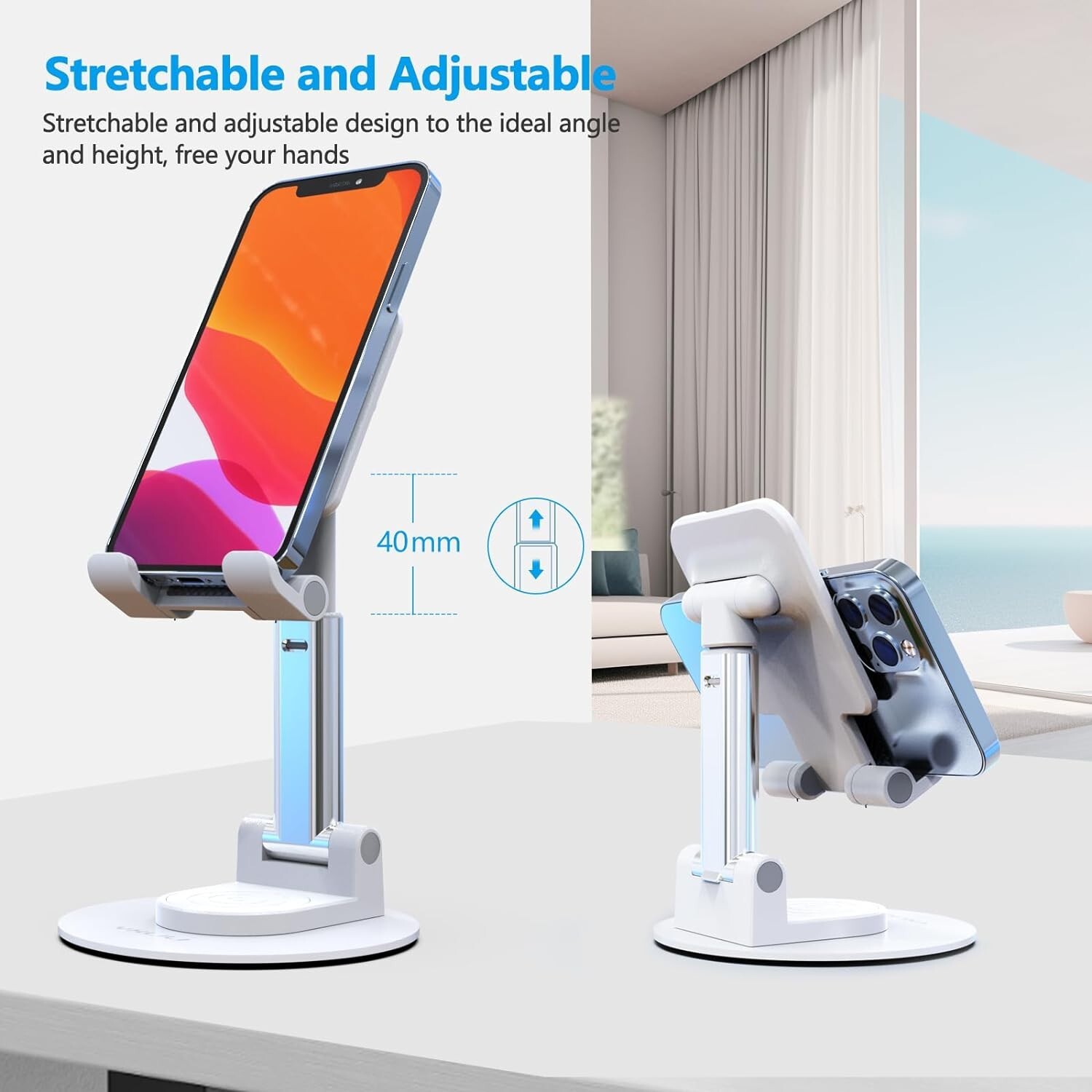 This phone stand is a game-changer! The 360° rotation and adjustable height make it perfect for watching videos, video calls, or even reading. It holds my iPhone and iPad securely without slipping, and the weighted base keeps it stable. The collapsible design is great for travel, and it looks sleek in white. Super sturdy yet lightweight—highly recommend for anyone needing a versatile stand!