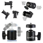 360 Degree Rotating Swivel Mini Tripod Ball Head Camera Mount Includes : 1× DaVoice 1/4" Screw Thread 360° Swivel Mini Ball Head (Black) 360 Degree Swivel Tripod Head Swivel ball joint allows 360 degree horizontal rotating fluid movement when adjusting the angle. Made of Aluminum Alloy Has rubber-padded mount on the top to protect your camera from potential scratches. Made of aluminum alloy, the max load is 4.4lbs/2 kg. It is very strong and durable. Locking Knob Ballhead is adjusted by loosening and tightening the knob, which allows for just the perfect angle. Locking Knob is made of hard plastic. Tripod mini ball head mount i s easy to carry and adjust; Rubber-padded mount with a 1/4" screw protects your camera from potential scratches between your camera and the mount. Ball head rotates 360 degrees , allows you to adjust angle, portrait or landscape, and is sturdy; Can work with DSLR cameras such as Nikon, Canon, Pentax, Sony, etc. - The aluminum alloy ball head can be rotated 360 degrees. Loosen/Tighten the adjustment knob on the ball head to adjust the angle of the ball head. Compact and Portable - Perfect for traveling, selfie, YouTube or Tiktok video recording, live streaming, taking pictures; can even be used on a selfie stick; use with a camera or even a phone (cell phone clip sold separately) 360 Degree Swivel Mini Ball Head 1/4 Tripod Screw Head for Cameras, Camcorders, Smart Phone, Gopro, LED Video Light, Microphone and More This ball head can withstand loads up to 4.4 pounds. It locks solidly, and moves smoothly. Leveling can be accomplished as one smooth motion. It has a tight sturdy hold with just a quick twist of one knob. This tripod ball head is also much easier to carry and pack than tripods with pan-tilt heads, as there are no long, protruding handles. Simply screw the tripod ball head onto your tripod quick release plate. Then screw the whole tripod set to your camera or cell phone clip. Bottom with 1/4" Thread Hole Ball Head is compatible with ring light stands, tripods and hot shoe adapters with 1/4" technology. Compatible with DSLR Cameras, Smart Phones, HTC Vive, Tripods, Monopods, Camcorders, Light Standards, other camera devices with 1/4" screws. Ball Head Specifications Designed to fit: Cameras, Tripods with a 1/4" Standard Screw Compatibility, Most Cell Phone Tripod Mounts. Item Type : 360° Swivel Mini Ball Material: Aluminum Alloy + Hard Plastic Knob & Top with Cushion Pan: 360 degree Ball Head weight: 2.5oz Ball Head Screw Type: 1/4" screw thread Ball Head Size: 2 inches tall More Features : 360 degree panning and from -90 degree to +90 degree tilting for panoramic photography; gives you the ability to have different angle positions with a tripod or monopod that does not have a ball head. Securely hold your camera to the tripod to take videos and photos at different angles, giving you more flexibility Aiming and horizon leveling can be accomplished as one instinctive motion, and rigid lockup takes just a quick twist of one control; Swivel ball joint to ensure 360 degree horizontal rotating fluid movement when adjusting the angle The component of the tripod mini ball head only has three parts, which makes it easy to carry and adjust; Rubber-padded mount with a 1/4" screw protects your camera from potential scratches between your camera and the mount The built-in ball head allows you to adjust and set its friction conveniently and make it rotate by 360 degrees; Can work with DSLR cameras such as Nikon, Canon, Pentax, Sony, etc. With Additional adapter (not included) it would work with smartphones or action cameras such as Gopro HD Hero 1/2/3/3+/4/5/6 Tactfully designed item, made of aluminum alloy, strong and durable; 1/4" screw on the top and an industrial standard 1/4" female thread at the bottom allows for mounting to most tripods or light stands