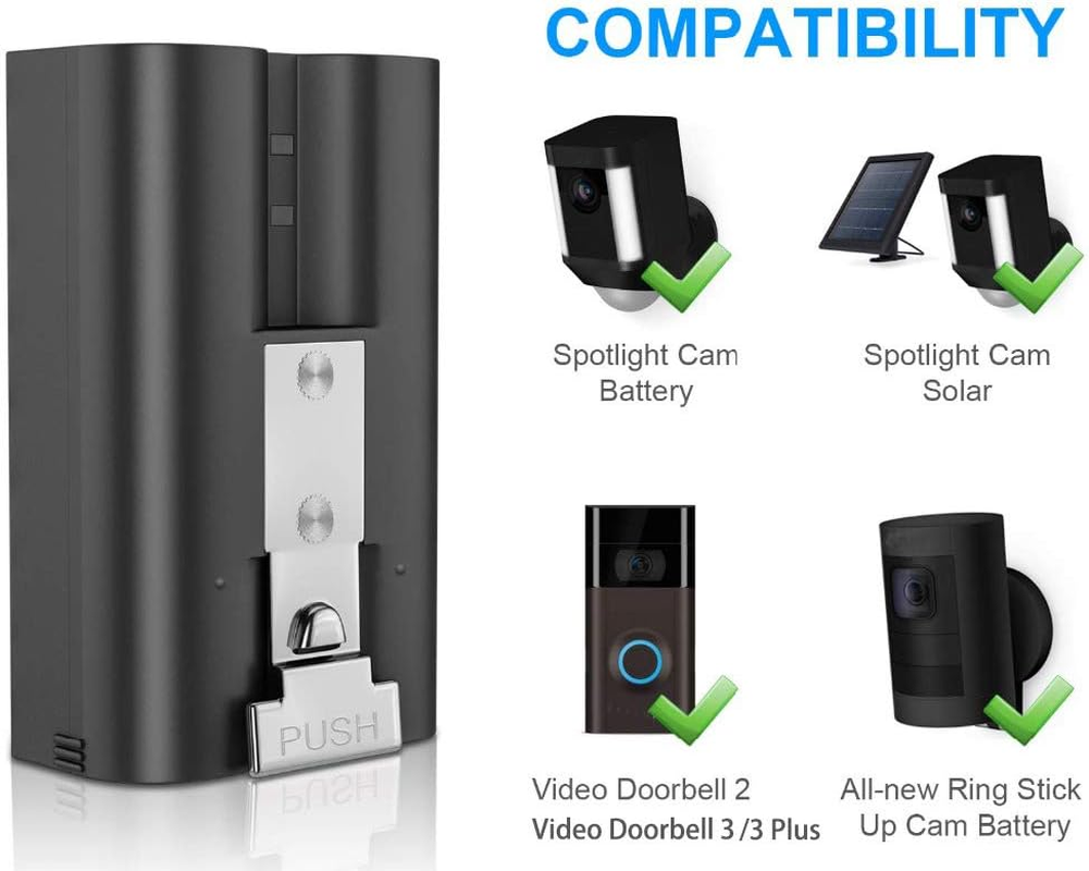 Store New Arrivals Add to Favorite View Feedback Contact Charging Station and 1 Packs Rechargeable 3.65V Lithium-Ion Battery Battery That Is Compatible with Ring, for Video Doorbell 2/3 and Spotlight Cam Battery 6400Mah ( 2023 Stronger Compatibility) Description Color 1 Battery + Charging Station (2023) Product Dimensions 0.88"D x 2.44"W x 2.44"H Item Weight 0.19 Kilograms Batteries 1 Lithium Ion batteries required. (included) Output Voltage 5 Volts 【 Same with Original】New upgrade 2023 Stronger compatibility,( Works with Ring ),- Video Doorbell 3, Video Doorbell 3.1, Video Doorbell 3 Plus, Video Doorbell 4, Battery Doorbell Plus, Peephole Cam, Stick Up Cam Battery (2nd and 3rd Gen), Spotlight Cam Battery, and Smart Lighting Solar Floodlight. 【High Quality】Rechargeable lithium-ion battery with premium cells ,Voltage: 3.65V, Capacity: 6400mAh 【Intelligent Charger】Dual charging docks allow you to charge up to two batteries simultaneously,led lights display charging status of both batteries,Simply push the battery down into the charging slot to charge, lower it until the LED light indicating charge level。 【Multiple Protection】 Features four layers of protection (over-charging, short-circuit, high-temperature, and surge protection) with a high-quality, fire-resistant construction, ensure complete protection for you and your devices 【WHAT YOU GET】1 Packs Batteries, 1 *Dual charging docks, 24-Month Manufacturer Warranty and 24-Hour Customer Service. Battery can be charged but no work? Please rescan the QR code on your Ring device,then let your Ring join the Ring Wi-Fi network again. Extra Power for Your Ring Video Doorbell 2, Ring Spotlight cam, Ring Stick Up Cam, Ring Door View Cam. 6400mAh rechargeable battery, lasts for about 3-6 months, battery life varies based on settings, usage & temperature. NOTE: The battery life is depending on your device’s motion and light settings. The battery life may range in different working environments. Specification: Rechargeable battery Specification: Capacity: 6400mAh Voltage: 3.65V Charging Station Specification: Input:5V/2A Output: 5V 800mA Size:2.44*2.44*0.88 inch What You Get: 1 Packs Batteries 1 Dual USB Charger ABOUT US We offer the best prices around on high quality products. Our E-store includes media such as books, movies, music and games while offering electronics, toys, sporting apparel, clothing, tools, general home, garden items and more. SHIPPING We are always working hard to ensure your package arrives as soon as possible. Please understand that some factors like weather, high postal traffic, and the performance of shipping companies are outside of our control. We offer free shipping to the lower 48 states and ship within 2 business days of payment, usually sooner. We do not accept P.O. Boxes. Please provide a physical address. For shipping outside of the continental USA, we only use eBay's Global Shipping Program.The item is shipped to KY and then sent to the rest of the world. International customers are responsible for all duties and taxes. Continue to check out in order to calculate costs for shipping the item to your country. Messages regarding eBay's Global Shipping Program MUST be directed at eBay EXCLUSIVELY. RETURNS We offer a 30-Day Return Policy on items which you are not completely satisfied with. You have the option for a full-refund or an exchange of the item. No returns are available on items shipped outside of the USA. PAYMENT We accept PayPal. CONTACT US This page content is yet to come Please ad us to your favorite seller and visit again later Thank You CUSTOMER SATISFACTION We try our very best to make sure every customer is completely satisfied. If there's a problem, message us! We're happy to help. WE ACCEPT Copyright © 2021 AutoDS. | All Rights Reserved