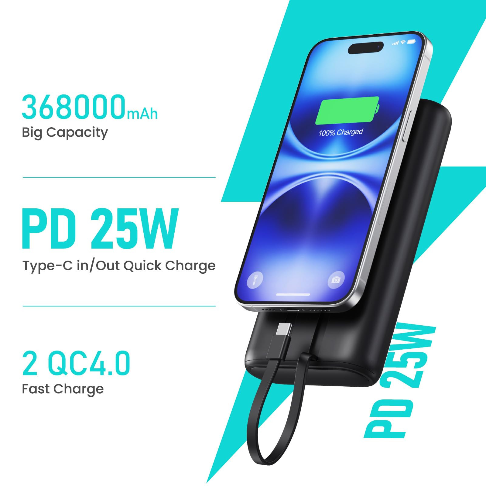 【36800 mAh Portable Charger with Built in Cables】This USB-C power bank has 2 built-in cables (Type-C, ios),No need for messy and tangle-prone external cables.With 3 output ports and 2 built-in cables,you can charge up to 5 devices at the same time. Suitable for business, travel, going out. 【Ultra-high Capacity 36800mAh】36800mAh power bank with ultra-high capacity can Keep Your phone running all day. Without extra worry about low phone battery. Ideal to take it for play game, trip and listen music. 【PD 25W Fast Charging Portable Charger】Portable phone charger combines the advanced PD & QC fast charging technologies,the USB C cable/port supports PD25W,it only takes 30 minutes to charge your iPhone from 0 to 50% in 30mins, you no longer have to wait endlessly charging or fret about low battery. With this power bank, your phone/tablet will be very fast charged, you will never miss any important phone calls or video calls again. 【Super Safety - Intelligent Controlling IC】 Newest design upgraded version 36800mAh power bank with safety polymer battery, built-in intelligent chip can protect your devices against overcharge, over discharge, excessive currents, short circuits or overheating, provided stable charging. 【Universal Compatibility & Smart LED Indicator】Pxwaxpy Portable Charger is widely compatible with iPhone, Samsung Galaxy, Pixel smartphone and smaller devices such as bluetooth earbuds, fitness tracker and so on. 4 blue LED indicators show the power left as 25%-50%-75%-100%, no more guessing whether need to charge it or not. 【What You Get】1*36800mAh Portable Charger with 2 built-in Cables , 1*User Manual. And 3 Years warranty lifetime technical support.If you have any question, please feel free to contact us