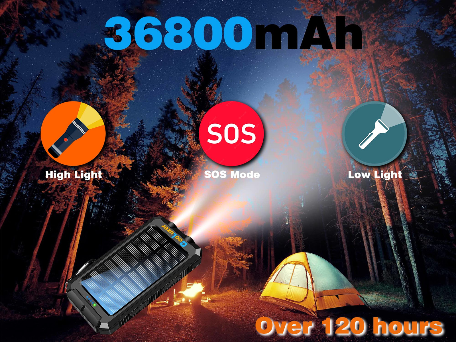 Solar Power Bank 36800mah, Solar Charger Power Bank with 18W PD 5V 3.1A outputs, IP67 Waterproof, Grade A+ Battery with LED Flashlight and Compass, Perfect Camping Gear Accessory for Outdoor (Black) ⚡【Grade A+ 36800mAh Battery & anti-explosion】⚡This Solar Power Bank has built-in Grade A+ 36800mAh Lithium polymer battery, It is anti-explosion, lightweight and durable. The solar charger has a high-performance solar panel and have more than 3000 times full cycle recharging lifetime, as 36800mAh capacity power stored in high-density lithium polymer battery, so the solar charger power bank has mini size and lightweight. ⚡【18W fast Charging & Multi-Functions】⚡The Power Bank support QC 3.0 with two 5V 3.1A 18W fast charging Outputs,It is also a portable power bank compatible with Phones, watches, headphones and other USB devices. The solar phone charger has 2 supper bright LED lights with 3 modes (normal, strong, SOS) and has a high-precision compass, In addition, it is equipped with a carabiner for hanging the power bank charger on your backpack while climbing, walking and camping. ⚡【Solar Panel Charging Mode 】⚡Limited by the small solar panel size, the Solar panel charging mode cannot offer you satisfied charging speed as its maximum charging speed is 5V*0.3A=1.5W, less than 1/12 of the charging speed with outlet, solar charging mode is used for emergency purpose , so It is highly recommended to do it that fully charge the Solar power bank with outlet before taking an outdoor trip. ⚡【Waterproof & Shockproof 】⚡ The Portable Solar charger made by Strong ABS material which protects the Solar bank Charger from shock/drops. The power Charger has a special cover on the ports area, it protects the power bank charger to be IP67 waterproof and dustproof. ⚡【Use Occasion & Customer Service】⚡It is a perfect outdoor equipment or camping gear accessory for hiking, camping, cycling, fishing, traveling, and beaches. The power bank pass CE, UL PSE testing. the full package contain: 1* 36800mAh Solar charger, 1*Micro USB cable, 1*Carabiner, 1* User manual. we offer 24hours online after-sales service. If you have any question, please contact us to get support.