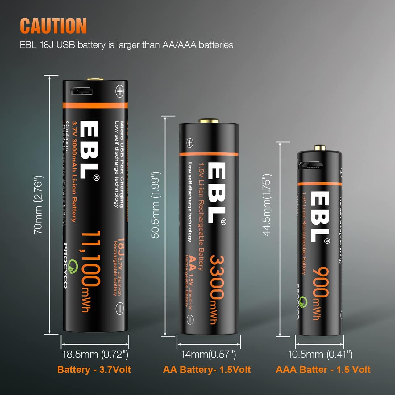 EBL 18J Battery - 3.7V lithium batteries(SIZE: 18.5MM x 70MM, battery type: button top) STATEMENT: This product is NOT sold with restricted lithium-ion standalone batteries. This product does NOT include lithium-ion battery types: 14500, 16340, 18650, 20700, 21700 and 26650. Built-in micro USB port - easy to charge with the included 2 in 1 USB cable, no additional battery charger required, just plug into any USB port at anytime and anywhere. Rechargeable Batteries -1200 Tech, ProCyco (Professional recycle) helps maximize its best power performance while charging. Safety Assurance - built-in integrated safety circuit protects battery from over-charge, over-discharge, short-circuit and over-heat, ensures complete safety for the battery charging.Note: The smart chip protection makes our batteries are little longer than other flat top batteries. High performance - EBL 3.7V Li-ion batteries with 3000mAh capacity, support stable 3.7volt output voltage, makes the devices work more stable and lasting longer, great replacement batteries for high frequently used devices. Product Description EBL 3.7V 3000mAh USB Rechargeable Lithium Battery, Steady Voltage for High Current Applications ProCyco (Professional recycle) & Low self discharge - Long battery Life 1200 Tech, ProCyco (Professional recycle) helps maximize its best power performance while charging. The advantage of lithium ion batteries is low self-discharge and no typical memory effect, don’t need to worry about reduction of the battery life after constantly charging and discharging. 3.7V Lithium USB rechargeable battery - Steady Voltage These Li-ion batteries can provide approximately the same and steady voltage until the whole cell is depleted, make the devices working stable and lasting longer. Perfect for the devices that need high battery performance. Fast Charging & 3000mAh High Capacity Batteries Advanced iQuick charging technology, the 3000mAh(11,100mWh) high capacity battery will be full charged within four hours, and it can provide longer working time than alkaline and NiMh batteries for every charge Build-in LED Light Shows the Charging Process The LED indicator shows the red light when battery is recharging. The LED indicator shows the blue light when battery was fully charged Smart Charging Design - Easy to Charge Anytime and Anywhere Unique design with a micro-USB port in the side of the battery, come with a 2 in 1 USB cable. It can be directly recharged by plug in a USB port like laptops, power bank, wall adapter, etc. Easy and convenient to charge at anywhere and anytime. NOTICE: Please measure your original battery size or battery slot space of your device, confirm this item is fit for your devices before purchase: Battery length: 70mm(2.76inch); Diameter: 18.5mm (0.73inch) How to charge the battery? *Compatible charging cable: Micro USB cable (included) ; Compatible adapter: 5V/2A (Not included) * Plug the micro-USB cable into the batteries, then plug the USB cable into the 5V/2A adapter or power bank. *Please use the 5V/2A charging adapter to charge the batteries, otherwise it may cause the batteries to short circuit. Why the battery won’t hold the charge ? *The batteries were only precharged 20%~30% of capacity - Please fully charge the batteries when you get it, new battery can achieve the best performance after experiences 3-5 cycles of charge & discharge. * The devices need a different voltage or current - Please try to use this battery in other types of devices to check if battery work well. * The battery was reversed or short-circuit- Please remove the battery from device, charging battery to reactive the batteries. * The battery is damaged by shipping - Please check if the battery is damaged, bulging, or leaking.If so, please stop using. Package Included 3.7V 18J lithium battery x 2 2 in 1 charging cable x 1 Directly Charging by Micro USB - 18J 3.7V Lithium Batteries Advanced USB charging design, you could directly charge two batteries with provided USB cable at the same time. Not need to look for specialized charger for the batteries with different size and types. Ideal for everyday use, especially the devices with constant energy demands, perfectly use for many types of flashlights. Notice: PLEASE NOTE THAT THIS BATTERIES SIZE IS LARGER THAN STANDARD. Please note that batteries with 5V/2A charging adapter. This battery type is button top not flat top. Compatibility Used for flashlights(S1000/LC 90 Bolder/T04-1 /LFX1000/GearLight S1050/Feyachi FL21-MB), , Headlamps, Doorbells, RC Cars and other household devices. For streamlight flashlights: Stinger 2020, ProTac HL 5-X USB, PolyTac 90 X USB, Right Angle Light PolyTac X USB, ProTac 90 X USB, ProTac HL USB and More Battery Specifications Battery type Lithium Ion Terminal Type Micro USB Cycle life >1200 cycles Capacity 3000mAh (11,100mWh) Charging Time about 4 Hours Charging Current: 5V/2A Voltage 3.7 Volts Dimensions 18.5 * 70mm (± 0.3mm ) Weight 48g / pcs ( 1.69oz / pcs) Steady Voltage Keep steady 3.7V voltage until the whole cell is depleted, makes the devices work more stable. The advantage of lithium battery is no memory effects, you can charge the battery anytime whatever fully or partially drained. USB Charging Design Unique design with a micro-USB port in the side of the battery, no need the extra battery charger. it can be directly recharged by plug in a USB port like laptops, power bank, wall adapter, etc. Easy and convenient to charge anywhere and anytime. Multiple Safe Protection Supports over-charged, over-discharged, over-voltage, over-current and short circuit protection, ensures complete safety for you and your devices.